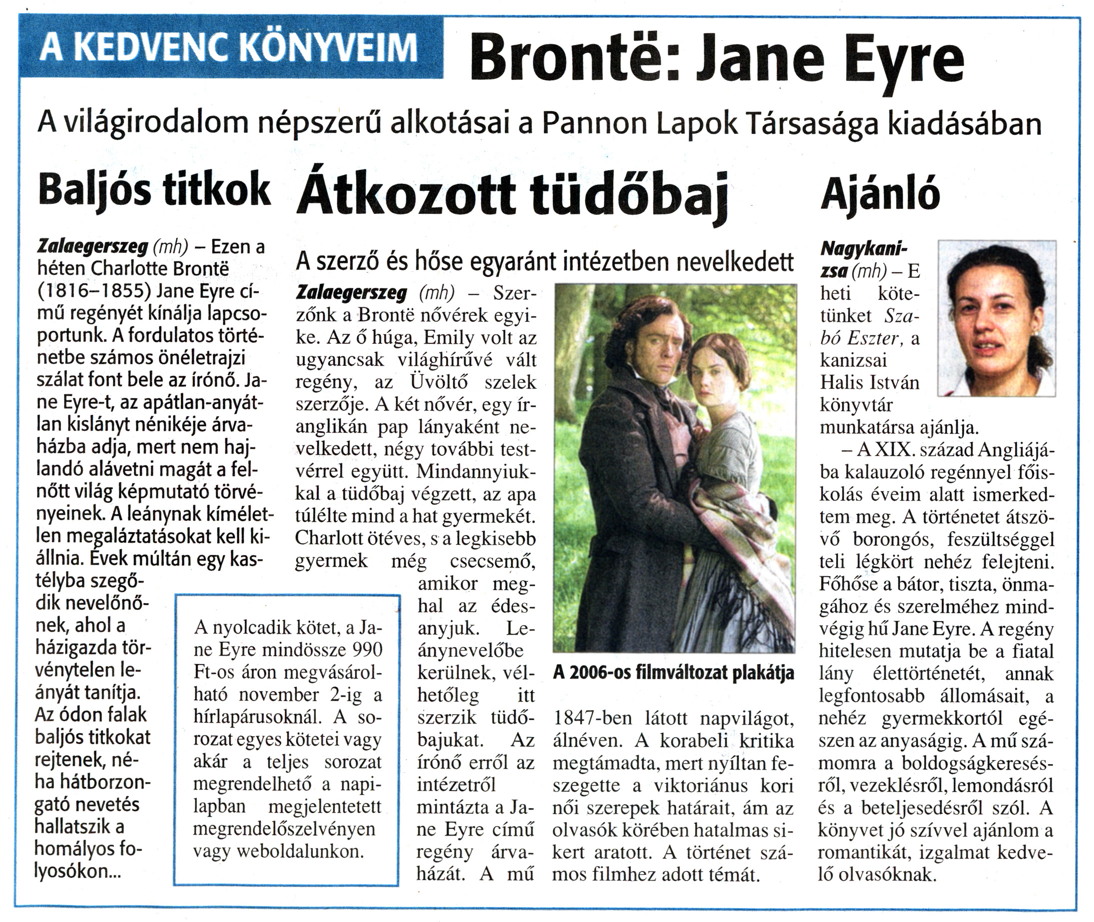 Nyilvános 1261 | 1415 | Zalai Hírlap 2010. október 27. 250. szám 7. oldal - Könyvajánló | A cikk szövege: A KEDVENC KÖNYVEIM Bronte: Jane Eyre A világirodalom népszerű alkotásai a Pannon Lapok Társasága kiadásában Baljós titkok Zalaegerszeg (mh) - Ezen a héten Charlotte Bronté (1816-1855) Jane Eyre című regényét kínálja lapcsoportunk. A fordulatos történetbe számos önéletrajzi szálat font bele az írónő. Jane Eyre-t, az apátlan-anyátlan kislányt nénikéje árvaházba adja, mert nem hajlandó alávetni magát a felnőtt világ képmutató törvényeinek. A leánynak kíméletlen megaláztatásokat kell kiállnia. Evek múltán egy kastélyba szegődik nevelőnőnek, ahol a házigazda törvénytelen leányát tanítja. Az ódon falak baljós titkokat rejtenek, néha hátborzongató nevetés hallatszik a homályos folyosókon... A nyolcadik kötet, a Jane Eyre mindössze 990 Ft-os áron megvásárolható november 2-ig a hírlapárusoknál. A sorozat egyes kötetei vagy akár a teljes sorozat megrendelhető a napilapban megjelentetett megrendelőszelvényen vagy weboldalunkon. Átkozott tüdőbaj A szerző és hőse egyaránt intézetben nevelkedett Zalaegerszeg (mh) - Szerzőnk a Bronte nővérek egyike. Az ő húga, Emily volt az ugyancsak világhírűvé vált regény, az Üvöltő szelek szerzője. A két nővér, egy ír-anglikán pap lányaként nevelkedett, négy további testvérrel együtt. Mindannyiukkal a tüdőbaj végzett, az apa túlélte mind a hat gyermekét. Charlott ötéves, s a legkisebb gyermek még csecsemő, amikor meg- hal az édesanyjuk. Leánynevelőbe kerülnek, vélhetőleg itt szerzik tüdőbajukat. Az írónő erről az intézetről mintázta a Jane Eyre című regény árvaházát. A mű A 2006-os filmváltozat plakátja 1847-ben látott napvilágot, álnéven. A korabeli kritika megtámadta, mert nyíltan feszegette a viktoriánus kori női szerepek határait, ám az olvasók körében hatalmas sikert aratott. A történet számos filmhez adott témát. Ajánló Nagykanizsa (mh) - E heti kötetünket Szabó Eszter, a kanizsai Halis István könyvtár munkatársa ajánlja. - A XIX. század Angliájába kalauzoló regénnyel főiskolás éveim alatt ismerkedtem meg. A történetet átszövő borongós, feszültséggel teli légkört nehéz felejteni. Főhőse a bátor, tiszta, önmagához és szerelméhez mindvégig hű Jane Eyre. A regény hitelesen mutatja be a fiatal lány élettörténetét, annak legfontosabb állomásait, a nehéz gyermekkortól egészen az anyaságig. A mű számomra a boldogságkeresésről, vezeklésről, lemondásról és a beteljesedésről szól. A könyvet jó szívvel ajánlom a romantikát, izgalmat kedvelő olvasóknak. |