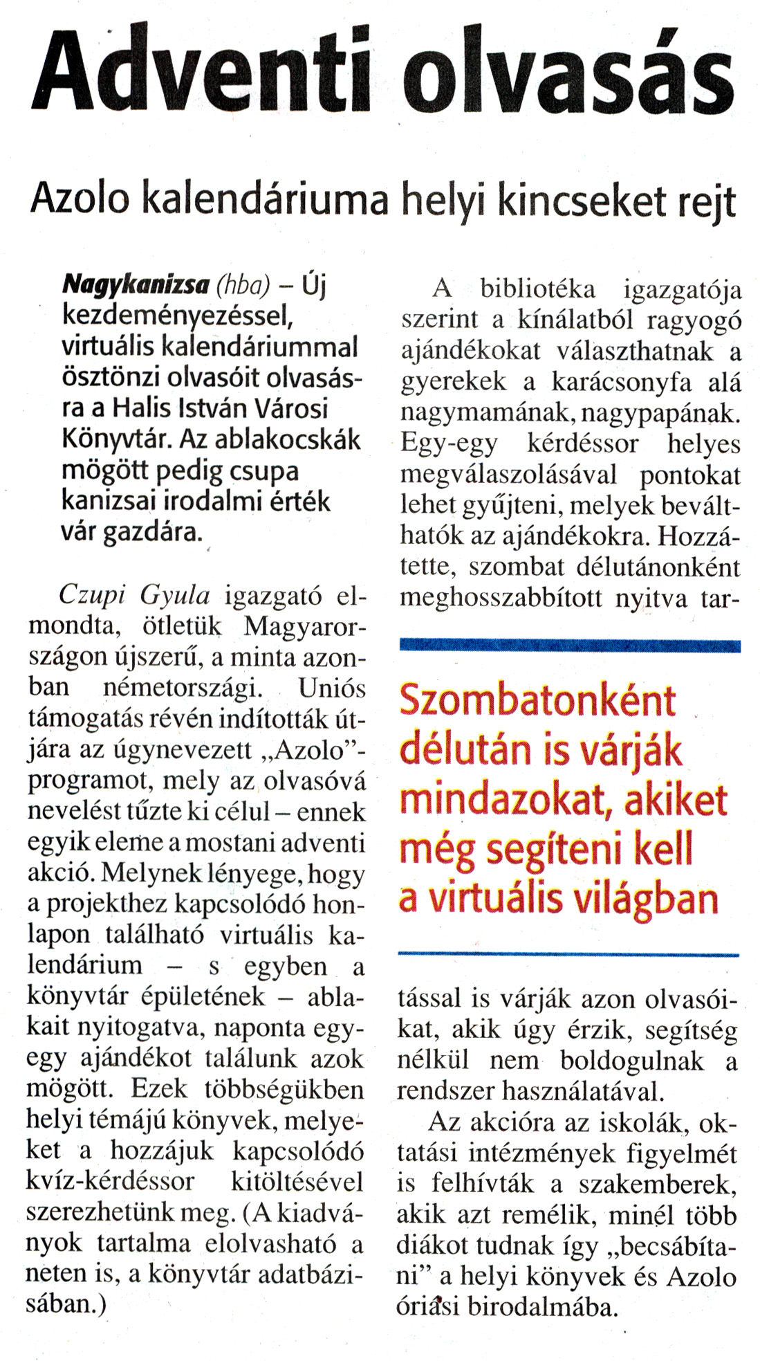 Nyilvános 1948 | 4906 | Zalai Hírlap 2010. december 7. 284. szám 11. oldal - Adventi olvasás | A cikk szövege: Adventi olvasás Azolo kalendáriuma helyi kincseket rejt Nagykanizsa (hba) - Új kezdeményezéssel, virtuális kalendáriummal ösztönzi olvasóit olvasásra a Halis István Városi Könyvtár. Az ablakocskák mögött pedig csupa kanizsai irodalmi érték vár gazdára. Czupi Gyula igazgató elmondta, ötletük Magyarországon újszerű, a minta azonban németországi. Uniós támogatás révén indították útjára az úgynevezett „Azolo"-programot, mely az olvasóvá nevelést tűzte ki célul - ennek egyik eleme a mostani adventi akció. Melynek lényege, hogy a projekthez kapcsolódó honlapon található virtuális kalendárium - s egyben a könyvtár épületének - ablakait nyitogatva, naponta egy-egy ajándékot találunk azok mögött. Ezek többségükben helyi témájú könyvek, melyeket a hozzájuk kapcsolódó kvíz-kérdéssor kitöltésével szerezhetünk meg. (A kiadványok tartalma elolvasható a neten is, a könyvtár adatbázisában.) A bibliotéka igazgatója szerint a kínálatból ragyogó ajándékokat választhatnak a gyerekek a karácsonyfa alá nagymamának, nagypapának. Egy-egy kérdéssor helyes megválaszolásával pontokat lehet gyűjteni, melyek beválthatók az ajándékokra. Hozzátette, szombat délutánonként meghosszabbított nyitva tartással is várják azon olvasóikat, akik úgy érzik, segítség nélkül nem boldogulnak a rendszer használatával. Az akcióra az iskolák, oktatási intézmények figyelmét is felhívták a szakemberek, akik azt remélik, minél több diákot tudnak így „becsábítani" a helyi könyvek és Azolo óriási birodalmába. Szombatonként délután is várják mindazokat, akiket még segíteni kell a virtuális világban |