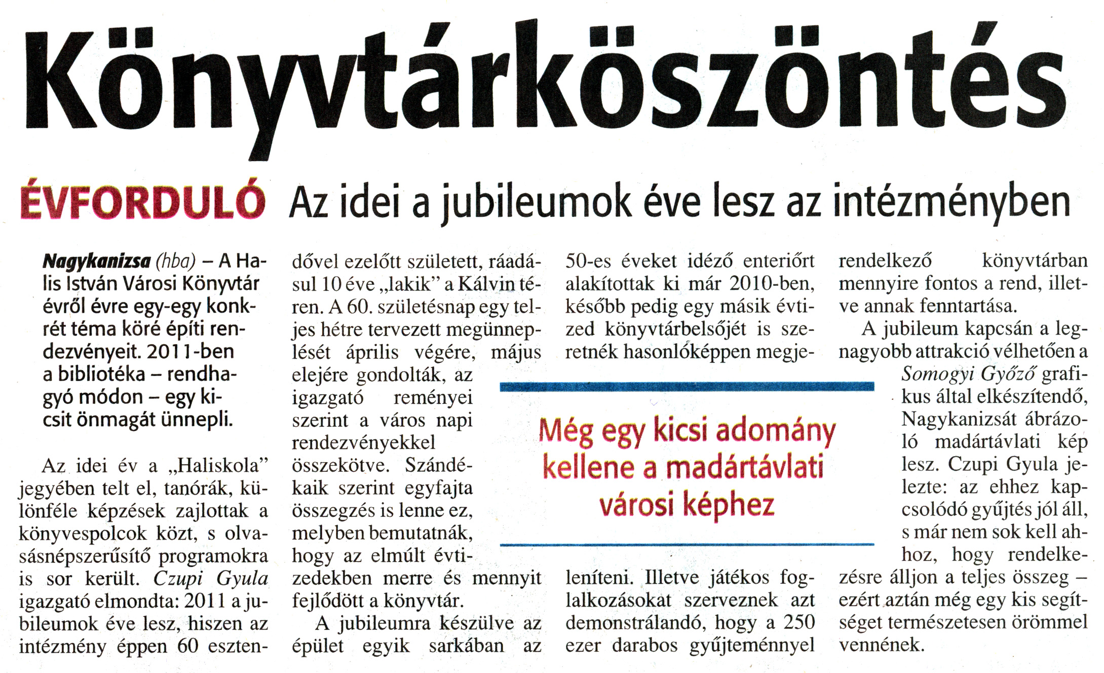 Nyilvános 2007 | 5762 | Zalai Hírlap 2011. január 3. 1. szám 7. oldal - Könyvtárköszöntés | A cikk szövege: Könyvtárköszöntés ÉVFORDULÓ Az idei a jubileumok éve lesz az intézményben Még egy kicsi adomány kellene a madártávlati városi képhez Nagykanizsa (hba) - A Halis István Városi Könyvtár évről évre egy-egy konkrét téma köré építi rendezvényeit. 2011-ben a bibliotéka - rendhagyó módon - egy kicsit önmagát ünnepli. Az idei év a „Haliskola" jegyében telt el, tanórák, különféle képzések zajlottak a könyvespolcok közt, s olvasásnépszerűsítő programokra is sor került. Czupi Gyula igazgató elmondta: 2011 a jubileumok éve lesz, hiszen az intézmény éppen 60 esztendővel ezelőtt született, ráadásul 10 éve „lakik" a Kálvin téren. A 60. születésnap egy teljes hétre tervezett megünneplését április végére, május elejére gondolták, az igazgató reményei szerint a város napi rendezvényekkel összekötve. Szándékaik szerint egyfajta összegzés is lenne ez, melyben bemutatnák, hogy az elmúlt évtizedekben merre és mennyit fejlődött a könyvtár. A jubileumra készülve az épület egyik sarkában az 50-es éveket idéző enteriőrt alakítottak ki már 2010-ben, később pedig egy másik évtized könyvtárbelsőjét is szeretnék hasonlóképpen megjeleníteni. Illetve játékos foglalkozásokat szerveznek azt demonstrálandó, hogy a 250 ezer darabos gyűjteménnyel rendelkező könyvtárban mennyire fontos a rend, illetve annak fenntartása. A jubileum kapcsán a legnagyobb attrakció vélhetően a Somogyi Győző grafikus által elkészítendő, Nagykanizsát ábrázoló madártávlati kép lesz. Czupi Gyula jelezte: az ehhez kapcsolódó gyűjtés jól áll, s már nem sok kell ahhoz, hogy rendelkezésre álljon a teljes összeg - ezért aztán még egy kis segítséget természetesen örömmel vennének. |