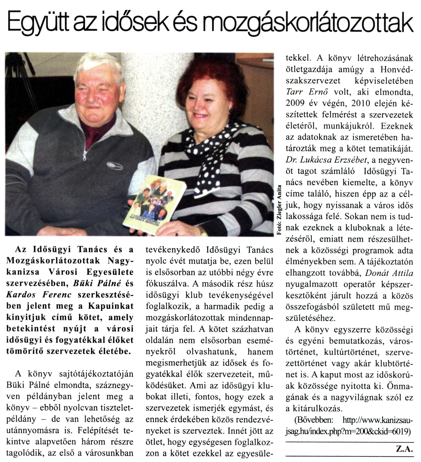Nyilvános 2586 | 7837 | Kanizsa 2011. január 20. 2. szám 5. oldal - Együtt az idősek és mozgáskorlátozottak | A cikk szövege: Együtt az idősek és mozgáskorlátozottak Az Idősügyi Tanács és a Mozgáskorlátozottak Nagykanizsa Városi Egyesülete szervezésében, Büki Pálné és Kardos Ferenc szerkesztésében jelent meg a Kapuinkat kinyitjuk című kötet, amely betekintést nyújt a városi idősügyi és fogyatékkal élőket tömörítő szervezetek életébe. A könyv sajtótájékoztatóján Büki Pálné elmondta, száznegyven példányban jelent meg a könyv - ebből nyolcvan tiszteletpéldány - de van lehetőség az utánnyomásra is. Felépítését tekintve alapvetően három részre tagolódik, az első a városunkban tevékenykedő Idősügyi Tanács nyolc évét mutatja be, ezen belül is elsősorban az utóbbi négy évre fókuszálva. A második rész húsz idősügyi klub tevékenységével foglalkozik, a harmadik pedig a mozgáskorlátozottak mindennapjait tárja fel. A kötet százhatvan oldalán nem elsősorban eseményekről olvashatunk, hanem megismerhetjük az idősek és fogyatékkal élők szervezeteit, működésüket. Ami az idősügyi klubokat illeti, fontos, hogy ezek a szervezetek ismerjék egymást, és ennek érdekében közös rendezvényeket is szerveztek. Innét jött az ötlet, hogy egységesen foglalkozzon a kötet ezekkel az egyesületekkel. A könyv létrehozásának ötletgazdája amúgy a Honvédszakszervezet képviseletében Tarr Ernő volt, aki elmondta, 2009 év végén, 2010 elején készítettek felmérést a szervezetek életéről, munkájukról. Ezeknek az adatoknak az ismeretében határozták meg a kötet tematikáját. Dr. Lukácsa Erzsébet, a negyvenöt tagot számláló Idősügyi Tanács nevében kiemelte, a könyv címe találó, hiszen épp az a céljuk, hogy nyissanak a város idős lakossága felé. Sokan nem is tudnak ezeknek a kluboknak a létezéséről, emiatt nem részesülhetnek a közösségi programok adta élményekben sem. A tájékoztatón elhangzott továbbá, Donát Attila nyugalmazott operatőr képszerkesztőként járult hozzá a közös összefogásból született mű megszületéséhez. A könyv egyszerre közösségi és egyéni bemutatkozás, várostörténet, kultúrtörténet, szervezettörténet vagy akár klubtörténet is. A kaput most az időskorúak közössége nyitotta ki. Önmagának és a nagyvilágnak szól ez a kitárulkozás. (Bővebben: http://www.kanizsaujsag.hu/index.php?m=200&ckid=6019) Z.A. Fotó: Ziegler Anita |
