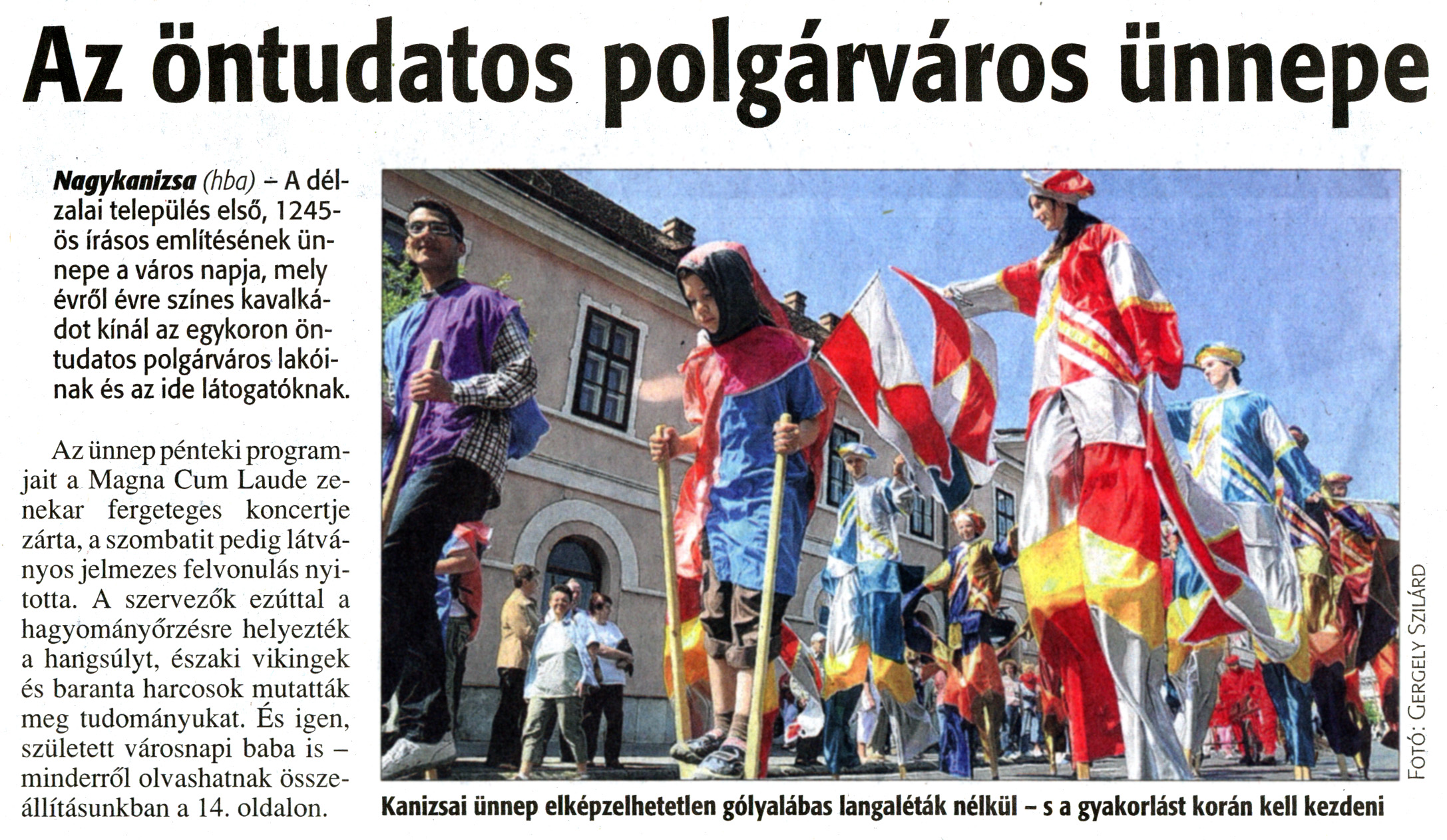 Nyilvános 1945 | 5005 | Zalai Hírlap 2011. május 16. 113. szám 1. oldal - Az öntudatos polgárváros ünnepe | A cikk szövege: Az öntudatos polgárváros ünnepe Nagykanizsa (hba) - A délzalai település első, 1245-ös írásos említésének ünnepe a város napja, mely évről évre színes kavalkádot kínál az egykoron öntudatos polgárváros lakóinak és az ide látogatóknak. Az ünnep pénteki programjait a Magna Cum Laude zenekar fergeteges koncertje zárta, a szombatit pedig látványos jelmezes felvonulás nyitotta. A szervezők ezúttal a hagyományőrzésre helyezték a hangsúlyt, északi vikingek és baranta harcosok mutatták meg tudományukat. És igen, született városnapi baba is - minderről olvashatnak összeállításunkban a 14. oldalon. Kanizsai ünnep elképzelhetetlen gólyalábas langaléták nélkül - s a gyakorlást korán kell kezdeni |