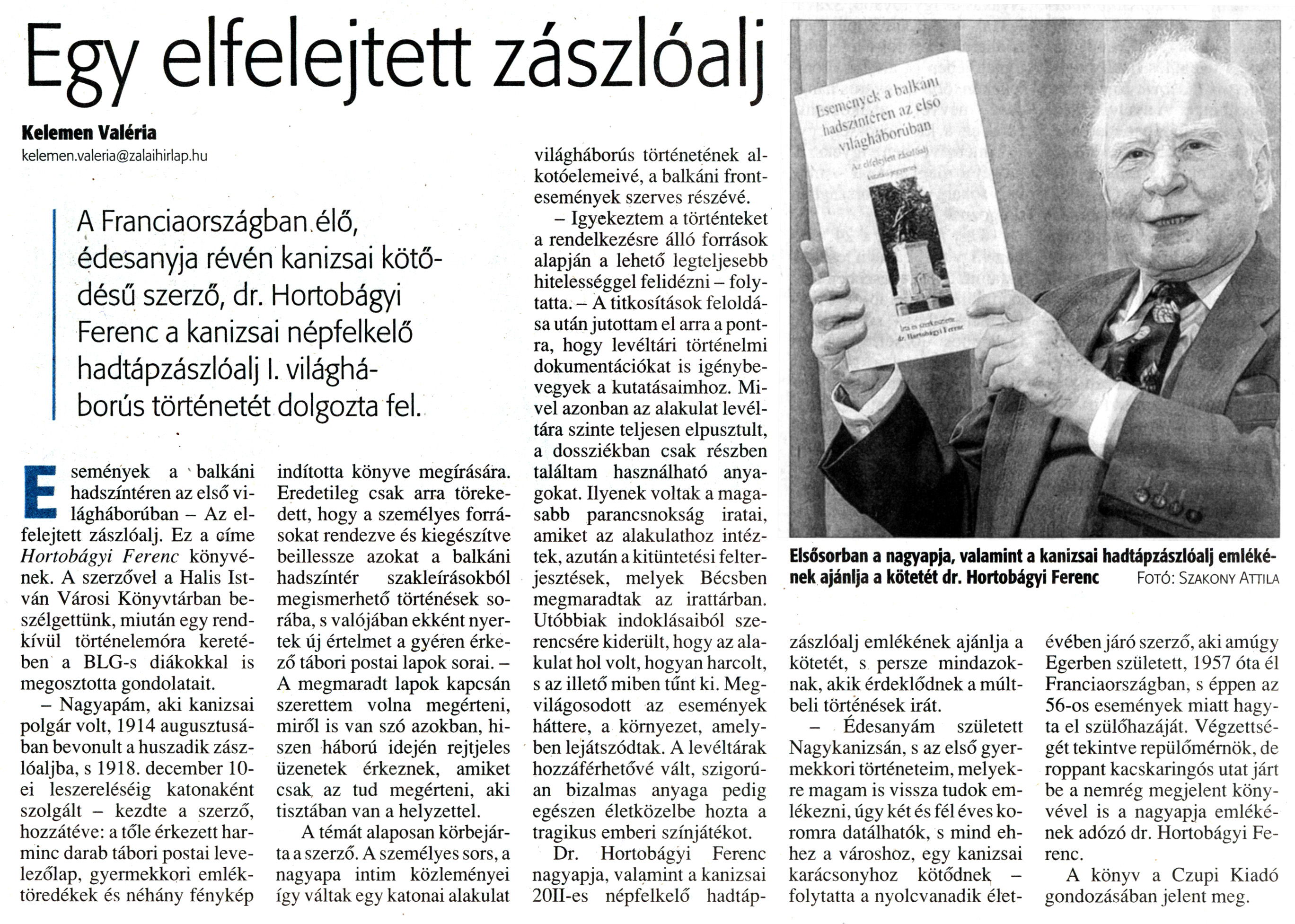 Nyilvános 1971 | 5258 | Zalai Hírlap 2011. június 4. 130. szám 18. oldal - Egy elfelejtett zászlóalj | A cikk szövege: Egy elfelejtett zászlóalj Kelemen Valéria kelemen.valeria@zalaihirlap.hu A Franciaországban élő, édesanyja révén kanizsai kötődésű szerző, dr. Hortobágyi Ferenc a kanizsai népfelkelő hadtápzászlóalj I. világháborús történetét dolgozta fel. Elsősorban a nagyapja, valamint a kanizsai hadtápzászlóalj emlékének ajánlja a kötetét dr. Hortobágyi Ferenc Fotó: Szakony Attila Események a balkáni hadszíntéren az első világháborúban - Az elfelejtett zászlóalj. Ez a címe Hortobágyi Ferenc könyvének. A szerzővel a Halis István Városi Könyvtárban beszélgettünk, miután egy rendkívüli történelemóra keretében a BLG-s diákokkal is megosztotta gondolatait. - Nagyapám, aki kanizsai polgár volt, 1914 augusztusában bevonult a huszadik zászlóaljba, s 1918. december 10-ei leszereléséig katonaként szolgált - kezdte a szerző, hozzátéve: a tőle érkezett harminc darab tábori postai levelezőlap, gyermekkori emléktöredékek és néhány fénykép indította könyve megírására. Eredetileg csak arra törekedett, hogy a személyes forrásokat rendezve és kiegészítve beillessze azokat a balkáni hadszíntér szakleírásokból megismerhető történések sorába, s valójában ekként nyertek új értelmet a gyéren érkező tábori postai lapok sorai. - A megmaradt lapok kapcsán szerettem volna megérteni, miről is van szó azokban, hiszen háború idején rejtjeles üzenetek érkeznek, amiket csak, az tud megérteni, aki tisztában van a helyzettel. A témát alaposan körbejárta a szerző. A személyes sors, a nagyapa intim közleményei így váltak egy katonai alakulat világháborús történetének alkotóelemeivé, a balkáni frontesemények szerves részévé. - Igyekeztem a történteket a rendelkezésre álló források alapján a lehető legteljesebb hitelességgel felidézni - folytatta. - A titkosítások feloldása után jutottam el arra a pontra, hogy levéltári történelmi dokumentációkat is igénybe vegyek a kutatásaimhoz. Mivel azonban az alakulat levéltára szinte teljesen elpusztult, a dossziékban csak részben találtam használható anyagokat. Ilyenek voltak a magasabb parancsnokság iratai, amiket az alakulathoz intéztek, azután a kitüntetési felterjesztések, melyek Bécsben megmaradtak az irattárban. Utóbbiak indoklásaiból szerencsére kiderült, hogy az alakulat hol volt, hogyan harcolt, s az illető miben tűnt ki. Megvilágosodott az események háttere, a környezet, amelyben lejátszódtak. A levéltárak hozzáférhetővé vált, szigorúan bizalmas anyaga pedig egészen életközelbe hozta a tragikus emberi színjátékot. Dr. Hortobágyi Ferenc nagyapja, valamint a kanizsai 20 II-es népfelkelő hadtápzászlóalj emlékének ajánlja a kötetét, s persze mindazoknak, akik érdeklődnek a múltbeli történések iránt. - Édesanyám született Nagykanizsán, s az első gyermekkori történeteim, melyekre magam is vissza tudok emlékezni, úgy két és fél éves koromra datálhatok, s mind ehhez a városhoz, egy kanizsai karácsonyhoz kötődnek -folytatta a nyolcvanadik élet- évében járó szerző, aki amúgy Egerben született, 1957 óta él Franciaországban, s éppen az 56-os események miatt hagyta el szülőhazáját. Végzettségét tekintve repülőmérnök, de roppant kacskaringós utat járt be a nemrég megjelent könyvével is a nagyapja emlékének adózó dr. Hortobágyi Ferenc. A könyv a Czupi Kiadó gondozásában jelent meg. |