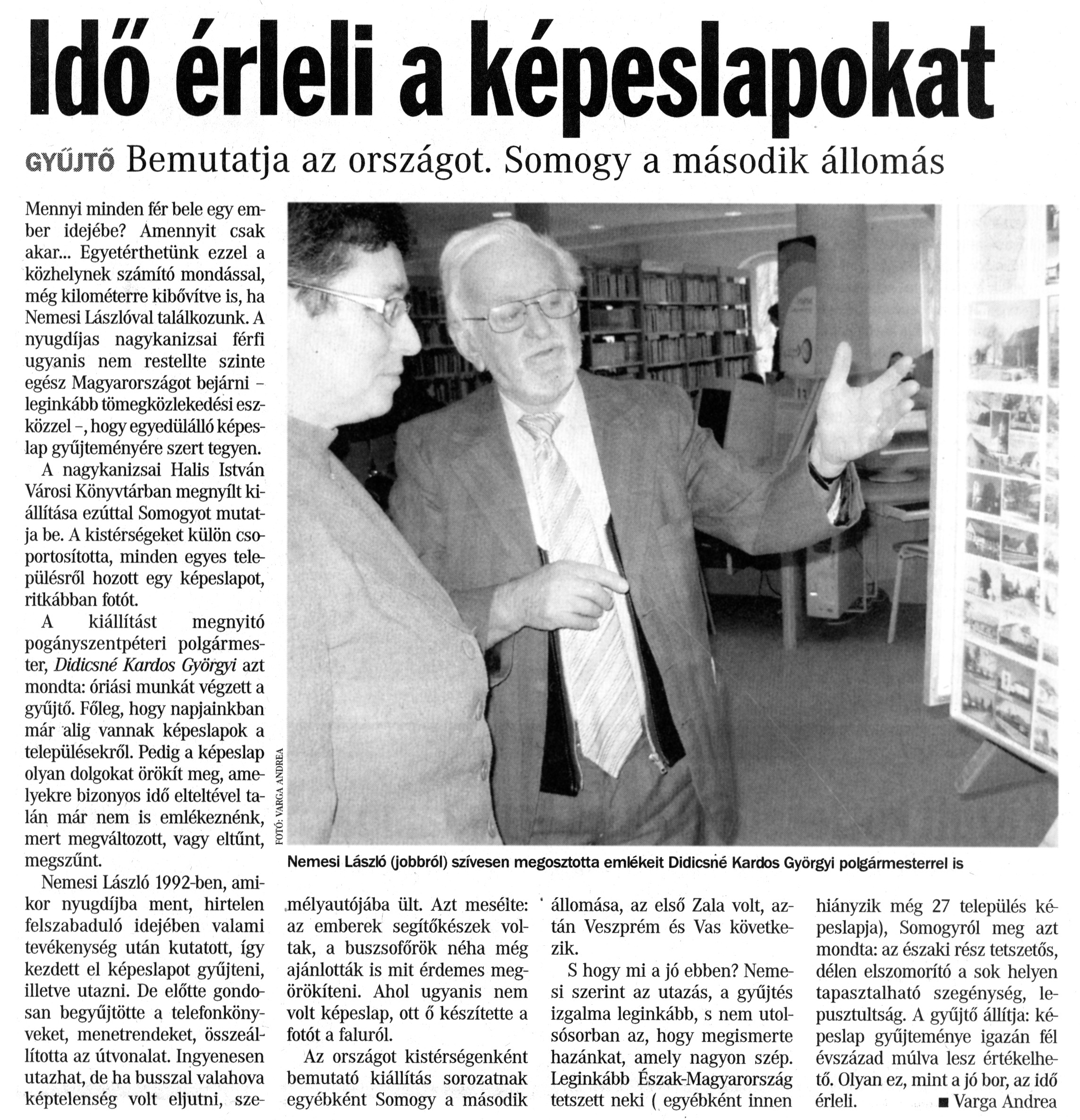 Nyilvános 1873 | 5033 | Somogyi Hírlap 2011. február 5. 30. szám 14. oldal - Idő érleli a képeslapokat | A cikk szövege: Idő érleli a képeslapokat gyűjtő Bemutatja az országot. Somogy a második állomás Nemesi László (jobbról) szívesen megosztotta emlékeit Didicsné Kardos Györgyi polgármesterrel is Mennyi minden fér bele egy ember idejébe? Amennyit csak akar... Egyetérthetünk ezzel a közhelynek számító mondással, még kilométerre kibővítve is, ha Nemesi Lászlóval találkozunk. A nyugdíjas nagykanizsai férfi ugyanis nem restellte szinte egész Magyarországot bejárni -leginkább tömegközlekedési eszközzel hogy egyedülálló képeslap gyűjteményére szert tegyen. A nagykanizsai Halis István Városi Könyvtárban megnyílt kiállítása ezúttal Somogyot mutatja be. A kistérségeket külön csoportosította, minden egyes településről hozott egy képeslapot, ritkábban fotót. A kiállítást megnyitó pogányszentpéteri polgármester, Didicsné Kardos Györgyi azt mondta: óriási munkát végzett a gyűjtő. Főleg, hogy napjainkban már alig vannak képeslapok a településekről. Pedig a képeslap olyan dolgokat örökít meg, amelyekre bizonyos idő elteltével talán már nem is emlékeznénk, mert megváltozott, vagy eltűnt, megszűnt. Nemesi László 1992-ben, amikor nyugdíjba ment, hirtelen felszabaduló idejében valami tevékenység után kutatott, így kezdett el képeslapot gyűjteni, illetve utazni. De előtte gondosan begyűjtötte a telefonkönyveket, menetrendeket, összeállította az útvonalat. Ingyenesen utazhat, de ha busszal valahova képtelenség volt eljutni, személyautójába ült. Azt mesélte: az emberek segítőkészek voltak, a buszsofőrök néha még ajánlották is mit érdemes megörökíteni. Ahol ugyanis nem volt képeslap, ott ő készítette a fotót a faluról. Az országot kistérségenként bemutató kiállítás sorozatnak egyébként Somogy a második állomása, az első Zala volt, aztán Veszprém és Vas következik. S hogy mi a jó ebben? Nemesi szerint az utazás, a gyűjtés izgalma leginkább, s nem utolsósorban az, hogy megismerte hazánkat, amely nagyon szép. Leginkább Észak-Magyarország tetszett neki (egyébként innen hiányzik még 27 település képeslapja), Somogyról meg azt mondta: az északi rész tetszetős, délen elszomorító a sok helyen tapasztalható szegénység, le-pusztultság. A gyűjtő állítja: képeslap gyűjteménye igazán fél évszázad múlva lesz értékelhető. Olyan ez, mint a jó bor, az idő érleli. Varga Andrea |