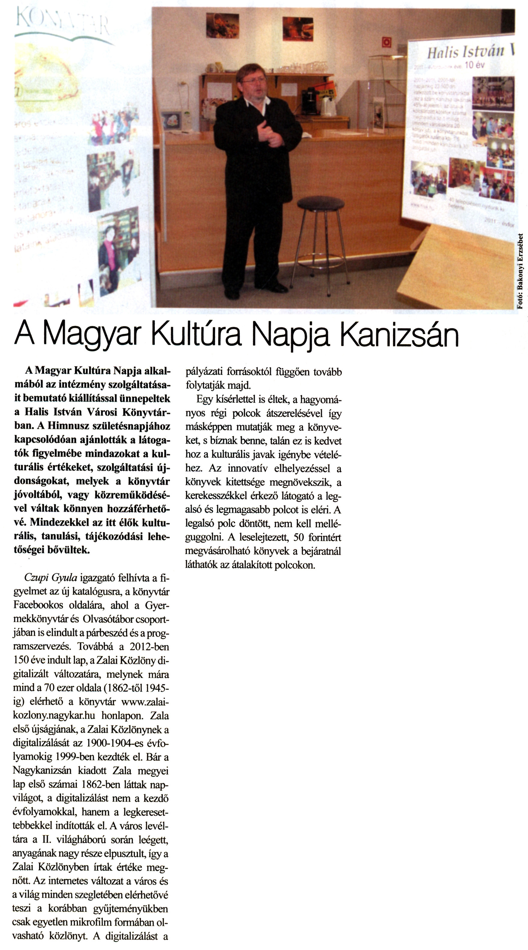 Nyilvános 2610 | 7892 | Kanizsa 2012. január 26. 3. szám 2. oldal - A Magyar Kultúra Napja Kanizsán | A Magyar Kultúra Napja Kanizsán A Magyar Kultúra Napja alkalmából az intézmény szolgáltatásait bemutató kiállítással ünnepeltek a Halis István Városi Könyvtárban. A Himnusz születésnapjához kapcsolódóan ajánlották a látogatók figyelmébe mindazokat a kulturális értékeket, szolgáltatási újdonságokat, melyek a könyvtár jóvoltából, vagy közreműködésével váltak könnyen hozzáférhetővé. Mindezekkel az itt élők kulturális, tanulási, tájékozódási lehetőségei bővültek. Czupi Gyula igazgató felhívta a figyelmet az új katalógusra, a könyvtár Facebookos oldalára, ahol a Gyermekkönyvtár és Olvasótábor csoportjában is elindult a párbeszéd és a programszervezés. Továbbá a 2012-ben 150 éve indult lap, a Zalai Közlöny digitalizált változatára, melynek mára mind a 70 ezer oldala (1862-től 1945-ig) elérhető a könyvtár www.zalai-kozlony.nagykar.hu honlapon. Zala első újságjának, a Zalai Közlönynek a digitalizálását az 1900-1904-es évfolyamokig 1999-ben kezdték el. Bár a Nagykanizsán kiadott Zala megyei lap első számai 1862-ben láttak napvilágot, a digitalizálást nem a kezdő évfolyamokkal, hanem a legkeresettebbekkel indították el. A város levéltára a II. világháború során leégett, anyagának nagy része elpusztult, így a Zalai Közlönyben írtak értéke megnőtt. Az internetes változat a város és a világ minden szegletében elérhetővé teszi a korábban gyűjteményükben csak egyetlen mikrofilm formában olvasható közlönyt. A digitalizálást a pályázati forrásoktól függően tovább folytatják majd. Egy kísérlettel is éltek, a hagyományos régi polcok átszerelésével így másképpen mutatják meg a könyveket, s bíznak benne, talán ez is kedvet hoz a kulturális javak igénybe vételéhez. Az innovatív elhelyezéssel a könyvek kitettsége megnövekszik, a kerekesszékkel érkező látogató a legalsó és legmagasabb polcot is eléri. A legalsó polc döntött, nem kell melléguggolni. A leselejtezett, 50 forintért megvásárolható könyvek a bejáratnál láthatók az átalakított polcokon. |