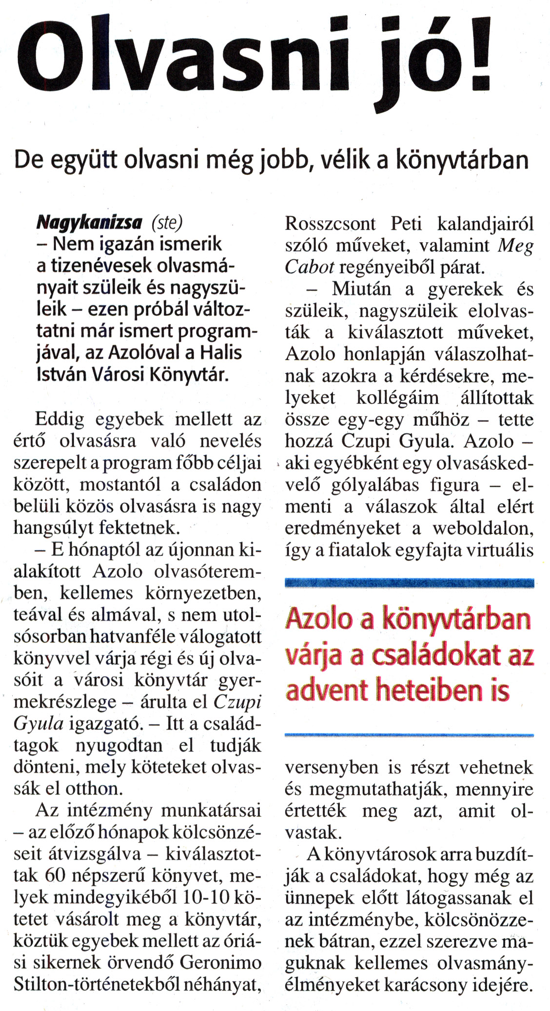 Nyilvános 1812 | 4540 | Zalai Hírlap 2012. december 6. 285. szám 11. oldal - Olvasni jó | Olvasni jó! De együtt olvasni még jobb, vélik a könyvtárban Azolo a könyvtárban várja a családokat az advent heteiben is Nagykanizsa (ste) - Nem igazán ismerik a tizenévesek olvasmányait szüleik és nagyszüleik - ezen próbál változtatni már ismert programjával, az Azolóval a Halis István Városi Könyvtár. Eddig egyebek mellett az értő olvasásra való nevelés szerepelt a program főbb céljai között, mostantól a családon belüli közös olvasásra is nagy hangsúlyt fektetnek. - E hónaptól az újonnan kialakított Azolo olvasóteremben, kellemes környezetben, teával és almával, s nem utolsósorban hatvanféle válogatott könyvvel várja régi és új olvasóit a városi könyvtár gyermekrészlege - árulta el Czupi Gyula igazgató. - Itt a családtagok nyugodtan el tudják dönteni, mely köteteket olvassák el otthon. Az intézmény munkatársai - az előző hónapok kölcsönzéseit átvizsgálva - kiválasztottak 60 népszerű könyvet, melyek mindegyikéből 10-10 kötetet vásárolt meg a könyvtár, köztük egyebek mellett az óriási sikernek örvendő Geronimo Stilton-történetekből néhányat, Rosszcsont Peti kalandjairól szóló műveket, valamint Meg Cabot regényeiből párat. - Miután a gyerekek és szüleik, nagyszüleik elolvasták a kiválasztott műveket, Azolo honlapján válaszolhatnak azokra a kérdésekre, melyeket kollégáim állítottak össze egy-egy műhöz - tette hozzá Czupi Gyula. Azolo -aki egyébként egy olvasáskedvelő gólyalábas figura - elmenti a válaszok által elért eredményeket a weboldalon, így a fiatalok egyfajta virtuális versenyben is részt vehetnek és megmutathatják, mennyire értették meg azt, amit olvastak. A könyvtárosok arra buzdítják a családokat, hogy még az ünnepek előtt látogassanak el az intézménybe, kölcsönözzenek bátran, ezzel szerezve maguknak kellemes olvasmányélményeket karácsony idejére. |