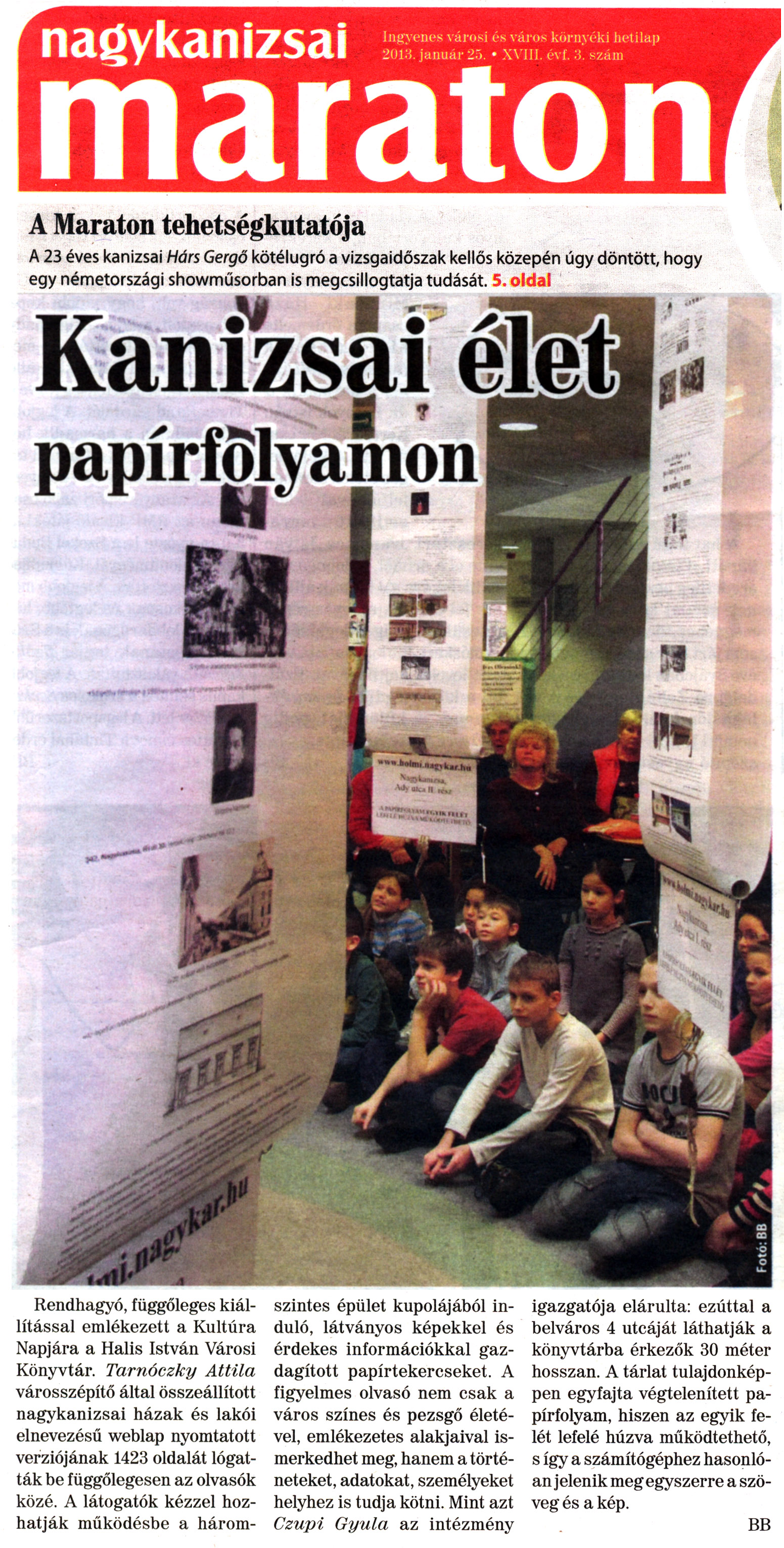 Nyilvános 1846 | 5270 | Nagykanizsai Maraton 2013. január 25. 3. szám 1. oldal - Kanizsai élet papírfolyamon | Kanizsai élet papírfolyamon Rendhagyó, függőleges kiállítással emlékezett a Kultúra Napjára a Halis István Városi Könyvtár. Tarnóczky Attila városszépítő által összeállított nagykanizsai házak és lakói elnevezésű weblap nyomtatott verziójának 1423 oldalát lógatták be függőlegesen az olvasók közé. A látogatók kézzel hozhatják működésbe a háromszintes épület kupolájából induló, látványos képekkel és érdekes információkkal gazdagított papírtekercseket. A figyelmes olvasó nem csak a város színes és pezsgő életével, emlékezetes alakjaival ismerkedhet meg, hanem a történeteket, adatokat, személyeket helyhez is tudja kötni. Mint azt Czupi Gyula az intézmény igazgatója elárulta: ezúttal a belváros 4 utcáját láthatják a könyvtárba érkezők 30 méter hosszan. A tárlat tulajdonképpen egyfajta végtelenített papírfolyam, hiszen az egyik felét lefelé húzva működtethető, s így a számítógéphez hasonlóan jelenik meg egyszerre a szöveg és a kép. BB |