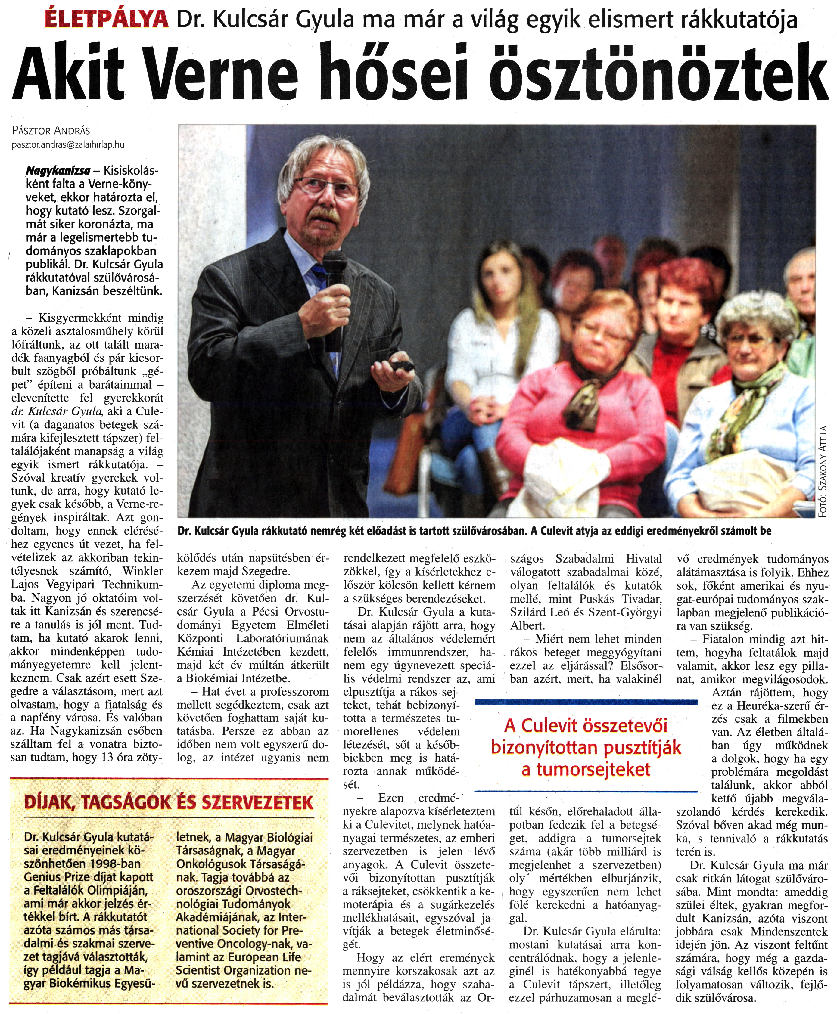 Nyilvános 1825 | 4080 | Zalai Hírlap 2013. november 13. 264. szám 5. oldal | ÉLETPÁLYA Dr. Kulcsár Gyula ma már a világ egyik elismert rákkutatója Akit Verne hősei ösztönöztek Or. Kulcsár Gyula rákkutató nemrég két előadást is tartott szülővárosában. A Culevit atyja az eddigi eredményekről számolt be Pásztor András pasztor.andras@zalaihirlap.hu Nagykanizsa - Kisiskolásként falta a Verne-könyveket, ekkor határozta el, hogy kutató lesz. Szorgalmát siker koronázta, ma már a legelismertebb tudományos szaklapokban publikál. Dr. Kulcsár Gyula rákkutatóval szülővárosában, Kanizsán beszéltünk. - Kisgyermekként mindig a közeli asztalosműhely körül lófráltunk, az ott talált maradék faanyagból és pár kicsorbult szögből próbáltunk „gépet" építeni a barátaimmal -elevenítette fel gyerekkorát dr. Kulcsár Gyula, aki a Culevit (a daganatos betegek számára kifejlesztett tápszer) feltalálójaként manapság a világ egyik ismert rákkutatója. - Szóval kreatív gyerekek voltunk, de arra, hogy kutató legyek csak később, a Verne-regények inspiráltak. Azt gondoltam, hogy ennek eléréséhez egyenes út vezet, ha felvételizek az akkoriban tekintélyesnek számító, Winkler Lajos Vegyipari Technikumba. Nagyon jó oktatóim voltak itt Kanizsán és szerencsére a tanulás is jól ment. Tudtam, ha kutató akarok lenni, akkor mindenképpen tudományegyetemre kell jelentkeznem. Csak azért esett Szegedre a választásom, mert azt olvastam, hogy a fiatalság és a napfény városa. És valóban az. Ha Nagykanizsán esőben szálltam fel a vonatra biztosan tudtam, hogy 13 óra zöty- kölődés után napsütésben érkezem majd Szegedre. Az egyetemi diploma megszerzését követően dr. Kulcsár Gyula a Pécsi Orvostudományi Egyetem Elméleti Központi Laboratóriumának Kémiai Intézetében kezdett, majd két év múltán átkerült a Biokémiai Intézetbe. - Hat évet a professzorom mellett segédkeztem, csak azt követően foghattam saját kutatásba. Persze ez abban az időben nem volt egyszerű dolog, az intézet ugyanis nem rendelkezett megfelelő eszközökkel, így a kísérletekhez először kölcsön kellett kérnem a szükséges berendezéseket. Dr. Kulcsár Gyula a kutatásai alapján rájött arra, hogy nem az általános védelemért felelős immunrendszer, hanem egy úgynevezett speciális védelmi rendszer az, ami elpusztítja a rákos sejteket, tehát bebizonyította a természetes tumorellenes védelem létezését, sőt a későbbiekben meg is határozta annak működését. - Ezen eredményekre alapozva kísérleteztem ki a Culevitet, melynek hatóanyagai természetes, az emberi szervezetben is jelen lévő anyagok. A Culevit összetevői bizonyítottan pusztítják a ráksejteket, csökkentik a kemoterápia és a sugárkezelés mellékhatásait, egyszóval javítják a betegek életminőségét. Hogy az elért eremények mennyire korszakosak azt az is jól példázza, hogy szabadalmát beválasztották az Országos Szabadalmi Hivatal válogatott szabadalmai közé, olyan feltalálók és kutatók mellé, mint Puskás Tivadar, Szilárd Leó és Szent-Györgyi Albert. - Miért nem lehet minden rákos beteget meggyógyítani ezzel az eljárással? Elsősorban azért, mert, ha valakinél túl későn, előrehaladott állapotban fedezik fel a betegséget, addigra a tumorsejtek száma (akár több milliárd is megjelenhet a szervezetben) oly\' mértékben elburjánzik, hogy egyszerűen nem lehet fölé kerekedni a hatóanyaggal. Dr. Kulcsár Gyula elárulta: mostani kutatásai arra koncentrálódnak, hogy a jelenleginél is hatékonyabbá tegye a Culevit tápszert, illetőleg ezzel párhuzamosan a meglévő eredmények tudományos alátámasztása is folyik. Ehhez sok, főként amerikai és nyugat-európai tudományos szaklapban megjelenő publikációra van szükség. - Fiatalon mindig azt hittem, hogyha feltatálok majd valamit, akkor lesz egy pillanat, amikor megvilágosodok. Aztán rájöttem, hogy ez a Heuréka-szerű érzés csak a filmekben van. Az életben általában úgy működnek a dolgok, hogy ha egy problémára megoldást találunk, akkor abból kettő újabb megválaszolandó kérdés kerekedik. Szóval bőven akad még munka, s tennivaló a rákkutatás terén is. Dr. Kulcsár Gyula ma már csak ritkán látogat szülővárosába. Mint mondta: ameddig szülei éltek, gyakran megfordult Kanizsán, azóta viszont jobbára csak Mindenszentek idején jön. Az viszont feltűnt számára, hogy még a gazdasági válság kellős közepén is folyamatosan változik, fejlődik szülővárosa. A Culevit összetevői bizonyítottan pusztítják a tumorsejteket DÍJAK, TAGSÁGOK ÉS SZERVEZETEK Dr. Kulcsár Gyula kutatásai eredményeinek köszönhetően 1998-ban Genius Prize díjat kapott a Feltalálók Olimpiáján, ami már akkor jelzés értékkel bírt. A rákkutatót azóta számos más társadalmi és szakmai szervezet tagjává választották, így például tagja a Magyar Biokémikus Egyesületnek, a Magyar Biológiai Társaságnak, a Magyar Onkológusok Társaságának. Tagja továbbá az oroszországi Orvostechnológiai Tudományok Akadémiájának, az International Society for Preventive Oncology-nak, valamint az European Life Scientist Organization nevű szervezetnek is. |