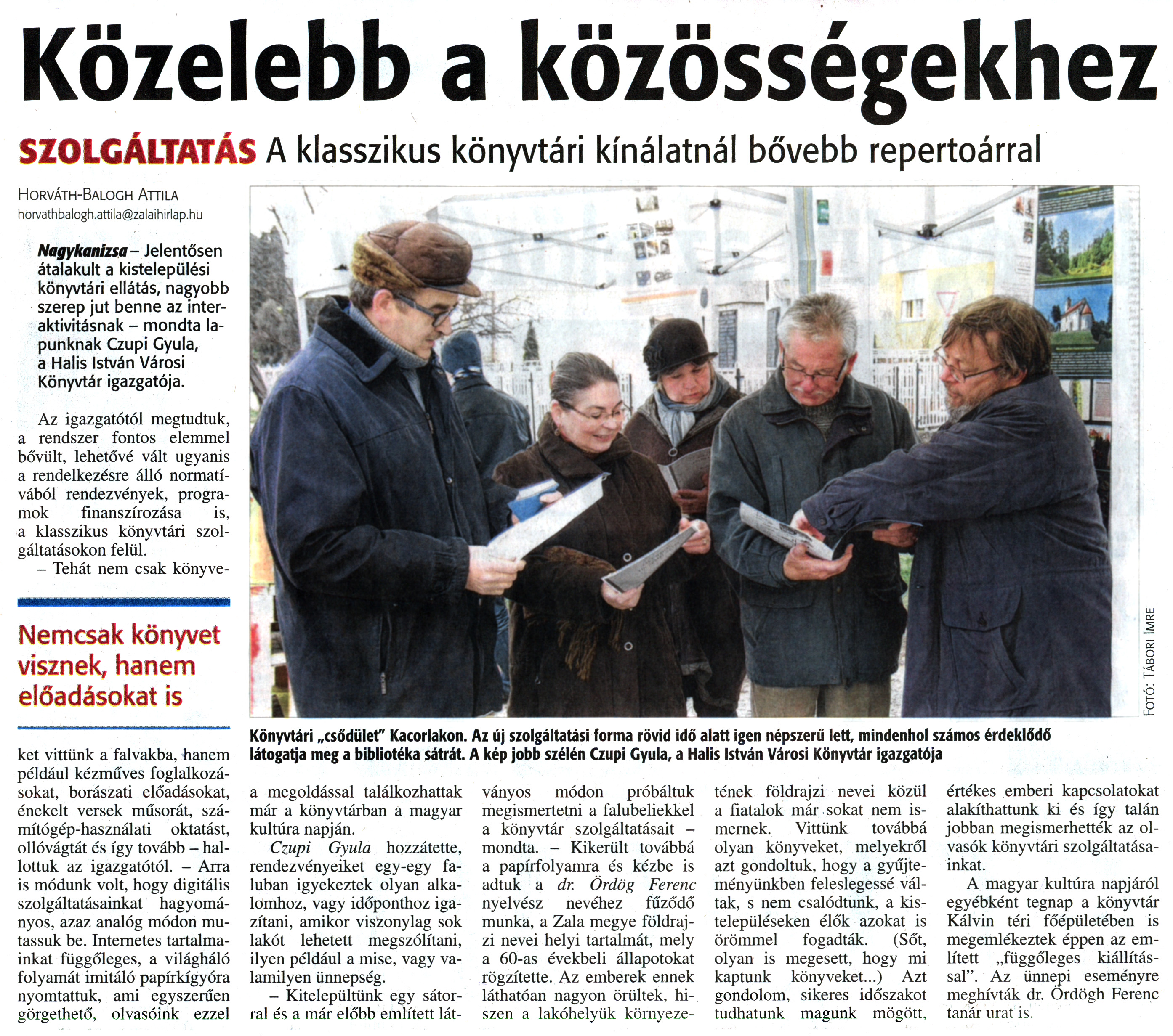 Nyilvános 2248 | 5310 | Zalai Hírlap 2014. január 23. 19. szám 11. oldal - Közelebb a közösségekhez | Közelebb a közösségekhez SZOLGÁLTATÁSA klasszikus könyvtári kínálatnál bővebb repertoárral Nemcsak könyvet visznek, hanem előadásokat is Horváth-Balogh Attila horvathbalogh.attila@zalaihirlap.hu Nagykanizsa - Jelentősen átalakult a kistelepülési könyvtári ellátás, nagyobb szerep jut benne az interaktivitásnak - mondta lapunknak Czupi Gyula, a Halis István Városi Könyvtár igazgatója. Az igazgatótól megtudtuk, a rendszer fontos elemmel bővült, lehetővé vált ugyanis a rendelkezésre álló normatívából rendezvények, programok finanszírozása is, a klasszikus könyvtári szolgáltatásokon felül. - Tehát nem csak könyveket vittünk a falvakba, hanem például kézműves foglalkozásokat, borászati előadásokat, énekelt versek műsorát, számítógép-használati oktatást, ollóvágtát és így tovább - hallottuk az igazgatótól. - Arra is módunk volt, hogy digitális szolgáltatásainkat hagyományos, azaz analóg módon mutassuk be. Internetes tartalmainkat függőleges, a világháló folyamát imitáló papírkígyóra nyomtattuk, ami egyszerűen görgethető, olvasóink ezzel a megoldással találkozhattak már a könyvtárban a magyar kultúra napján. Czupi Gyula hozzátette, rendezvényeiket egy-egy faluban igyekeztek olyan alkalomhoz, vagy időponthoz igazítani, amikor viszonylag sok lakót lehetett megszólítani, ilyen például a mise, vagy valamilyen ünnepség. - Kitelepültünk egy sátorral és a már előbb említett lát- ványos módon próbáltuk megismertetni a falubeliekkel a könyvtár szolgáltatásait -mondta. - Kikerült továbbá a papírfolyamra és kézbe is adtuk a dr. Ördög Ferenc nyelvész nevéhez fűződő munka, a Zala megye földrajzi nevei helyi tartalmát, mely a 60-as évekbeli állapotokat rögzítette. Az emberek ennek láthatóan nagyon örültek, hiszen a lakóhelyük környezetének földrajzi nevei közül a fiatalok már sokat nem ismernek. Vittünk továbbá olyan könyveket, melyekről azt gondoltuk, hogy a gyűjteményünkben feleslegessé váltak, s nem csalódtunk, a kistelepüléseken élők azokat is örömmel fogadták. (Sőt, olyan is megesett, hogy mi kaptunk könyveket...) Azt gondolom, sikeres időszakot tudhatunk magunk mögött. értékes emberi kapcsolatokat alakíthattunk ki és így talán jobban megismerhették az olvasók könyvtári szolgáltatásainkat. A magyar kultúra napjáról egyébként tegnap a könyvtár Kálvin téri főépületében is megemlékeztek éppen az említett „függőleges kiállítással". Az ünnepi eseményre meghívták dr. Ördög Ferenc tanár urat is. Könyvtári „csődület" Kacorlakon. Az új szolgáltatási forma rövid idő alatt igen népszerű lett, mindenhol számos érdeklődő látogatja meg a bibliotéka sátrát. A kép jobb szélén Czupi Gyula, a Halis István Városi Könyvtár igazgatója Fotó: Tábori Imre |