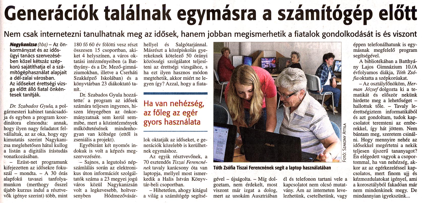 Nyilvános 2010 | 3770 | Zalai Hírlap 2014 04 16 089sz 05old - Generációk találnak egymásra a számítógép előtt | A cikk szövege: Generációk találnak egymásra a számítógép eló'tt Nem csak internetezni tanulhatnak meg az idősek, hanem jobban megismerhetik a fiatalok gondolkodását is és viszont Nagykanizsa (hba) - Az önkormányzat és az idősügyi tanács szervezésében közel kétszáz szépkorú sajátíthatja el a számítógéphasználat alapjait a dél-zalai városban. Az időseket érettségi vizsga előtt álló fiatal önkéntesek tanítják. Dr. Szabados Gyula, a polgármesteri kabinet tanácsadója és egyben a program koordinátora elmondta; annak, hogy ilyen nagy feladatot felvállaltak, az az oka, hogy egy kimutatás szerint Nagykanizsa meglehetősen hátul kuilog a listán a digitális írástudás vonatkozásában. - Eziist-nei programunk kifejezetten az idősekre fókuszál - mondta. - A 30 órás alapfokú tavaszi tanfolyamunkon (merthogy ősszel újabb kurzus indul a résztvevők igénye szerint) több, mint 180 fő 60 év fölötti vesz részt összesen 15 csoportban, akiket 4 helyszínen, a város oktatási intézményeiben (a Batthyány- és a Dr. Mező-gimnáziumokban, illetve a Cserháti Szakképző Iskolában) és a könyvtárban 23 diákoktató ta- Dr. Szabados Gyula hozzátette:' a program az idősek számára teljesen ingyenes, hiszen lényegében az Önkormányzatnak sem kerül semmibe, mert a közintézmények működtetésének mindenhogyan van költsége (ettől is zseniális a projekt). Egyébiránt két nyomós indokuk is volt a képzés megszervezésére. - Sajnos, a legutolsó népszámlálás során az elektronikus úton információt szolgáltatók száma a 23 megyei jogú város közül Nagykanizsán volt a legkevesebb, holtversenyben Hódmezővásár- hellyel és Salgótarjánnal. Másrészt a középiskolás gyerekeknek kötelező 50 órányi közösségi szolgálatot teljesíteni az érettségi vizsgához, s ha ezt ilyen hasznos módon megtehetik, akkor miért ne legyen így? Azzal, hogy a fiata- Ha van nehézség, az főleg az egér gyors használata lok oktatják az időseket, e generációk közelebb is kerülhetnek egymáshoz. Az egyik résztvevőnek, a 70 esztendős Tiszai Ferencné-nek tavaly karácsony óta van laptopja, mellyel most ismerkedik a Haiis István Könyv-tár-beli csoportban. - Hihetetlen, ahogy kitágul a világ a számítógép segítse- Tóth Zsófia Tiszai Ferencnének segít a laptop használatában gével - újságolta. - Míg dolgoztam, nem érdekelt, most viszont már izgat a dolog, mert az unokám Ausztriában él és telefonon tartani vele a kapcsolatot nem olcsó mutatvány. Ám az interneten levelezhetünk, csetelhetünk, vagy éppen telefonálhatunk is egymásnak megfelelő program segítségével. A bibliotékában a Batthyány Lajos Gimnázium 10./A évfolyamos diákja, Tóth Zsó-fia oktatta a szépicorúakat. - Az osztályfőnököm, Hermán József dolgozta ki a tematikát és először nekünk hirdette meg a lehetőséget -hallottuk tőle. - Tavaly leérettségiztem informatikából és azt gondoltam, tudok kapcsolatot teremteni az emberekkel, így hát jöttem. Nem bántam meg, szeretem csinálni. Hogy mennyire nehéz az idősekkel megértetni a nekik teljesen újszerű tananyagot? Én elégedett vagyok a csoportommal, ha van nehézség, akkor az az egérkezeléssel kapcsolatos, mert finom ujj és kézmozdulatokat igényel, ami a korosztályból fakadóan már nem mindenkinek megy. De mindannyian igyekszünk... |