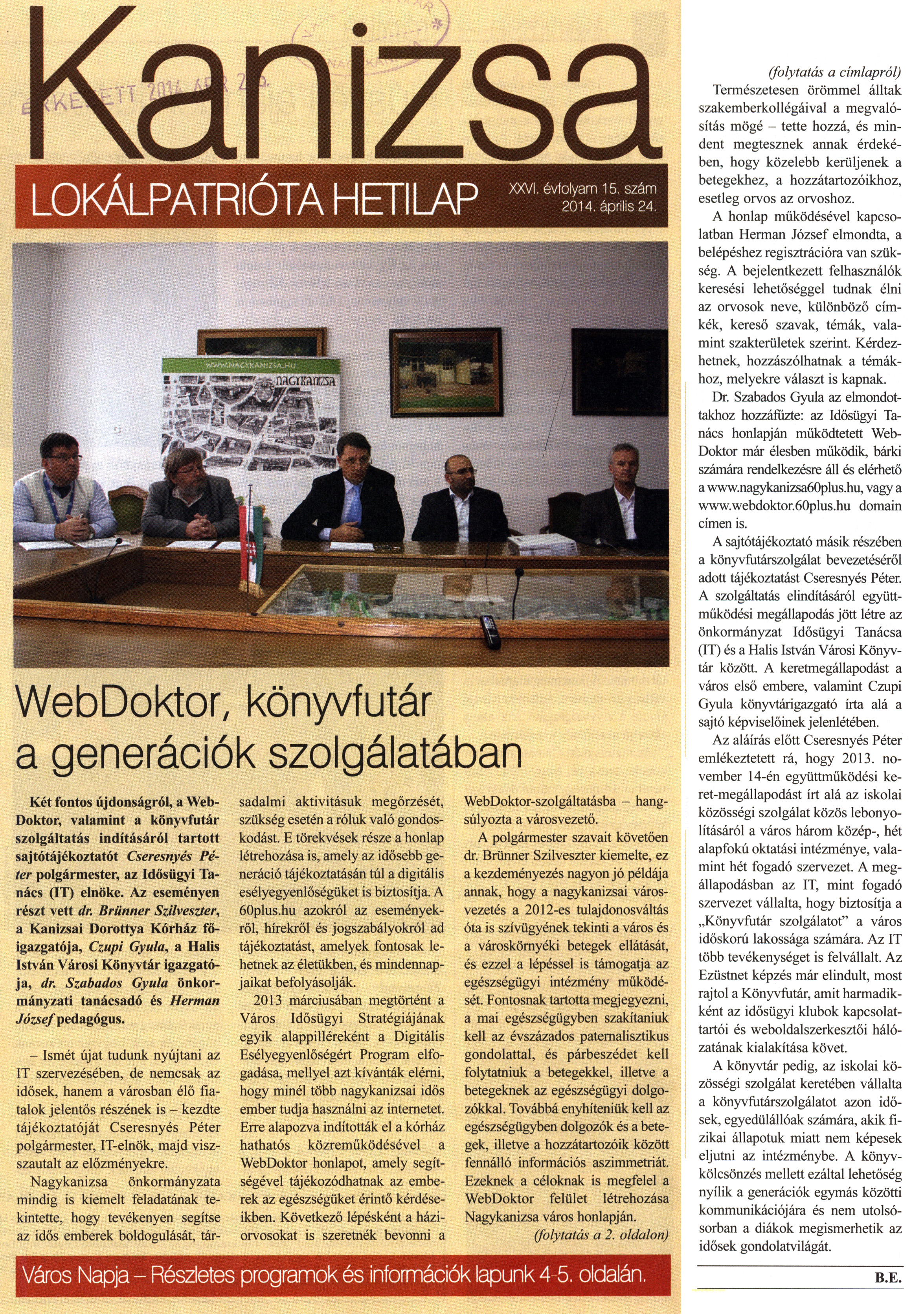 Nyilvános 2274 | 6863 | Kanizsa 2014. április 24. 15. szám 1-2. oldal - WebDoktor, könyvfutár | WebDoktor, könyvfutár a generációk szolgálatában Két fontos újdonságról, a WebDoktor, valamint a könyvfutár szolgáltatás indításáról tartott sajtótájékoztatót Cseresnyés Péter polgármester, az Idősügyi Tanács (IT) elnöke. Az eseményen részt vett dr. Brünner Szilveszter, a Kanizsai Dorottya Kórház főigazgatója, Czupi Gyula, a Halis István Városi Könyvtár igazgatója, dr. Szabados Gyula önkormányzati tanácsadó és Herman József pedagógus. - Ismét újat tudunk nyújtani az IT szervezésében, de nemcsak az idősek, hanem a városban élő fiatalok jelentős részének is - kezdte tájékoztatóját Cseresnyés Péter polgármester, IT-elnök, majd visszautalt az előzményekre. Nagykanizsa önkormányzata mindig is kiemelt feladatának tekintette, hogy tevékenyen segítse az idős emberek boldogulását, társadalmi aktivitásuk megőrzését, szükség esetén a róluk való gondoskodást. E törekvések része a honlap létrehozása is, amely az idősebb generáció tájékoztatásán túl a digitális esélyegyenlőségüket is biztosítja. A 60plus.hu azokról az eseményekről, hírekről és jogszabályokról ad tájékoztatást, amelyek fontosak lehetnek az életükben, és mindennapjaikat befolyásolják. 2013 márciusában megtörtént a Város Idősügyi Stratégiájának egyik alappilléreként a Digitális Esélyegyenlőségért Program elfogadása, mellyel azt kívánták elérni, hogy minél több nagykanizsai idős ember tudja használni az internetet. Erre alapozva indították el a kórház hathatós közreműködésével a WebDoktor honlapot, amely segítségével tájékozódhatnak az emberek az egészségüket érintő kérdéseikben. Következő lépésként a háziorvosokat is szeretnék bevonni a WebDoktor-szolgáltatásba - hangsúlyozta a városvezető. A polgármester szavait követően dr. Brünner Szilveszter kiemelte, ez a kezdeményezés nagyon jó példája annak, hogy a nagykanizsai városvezetés a 2012-es tulajdonosváltás óta is szívügyének tekinti a város és a városkörnyéki betegek ellátását, és ezzel a lépéssel is támogatja az egészségügyi intézmény működését. Fontosnak tartotta megjegyezni, a mai egészségügyben szakítaniuk kell az évszázados paternalisztikus gondolattal, és párbeszédet kell folytatniuk a betegekkel, illetve a betegeknek az egészségügyi dolgozókkal. Továbbá enyhíteniük kell az egészségügyben dolgozók és a betegek, illetve a hozzátartozóik között fennálló információs aszimmetriát. Ezeknek a céloknak is megfelel a WebDoktor felület létrehozása Nagykanizsa város honlapján. (folytatás a 2. oldalon) (folytatás a címlapról) Természetesen örömmel álltak szakemberkollégáival a megvalósítás mögé - tette hozzá, és mindent megtesznek annak érdekében, hogy közelebb kerüljenek a betegekhez, a hozzátartozóikhoz, esetleg orvos az orvoshoz. A honlap működésével kapcsolatban Herman József elmondta, a belépéshez regisztrációra van szükség. A bejelentkezett felhasználók keresési lehetőséggel tudnak élni az orvosok neve, különböző címkék, kereső szavak, témák, valamint szakterületek szerint. Kérdezhetnek, hozzászólhatnak a témákhoz, melyekre választ is kapnak. Dr. Szabados Gyula az elmondottakhoz hozzáfűzte: az Idősügyi Tanács honlapján működtetett WebDoktor már élesben működik, bárki számára rendelkezésre áll és elérhető a www.nagykanizsa60plus.hu, vagy a www.webdoktor.60plus.hu domain címen is. A sajtótájékoztató másik részében a könyvfutárszolgálat bevezetéséről adott tájékoztatást Cseresnyés Péter. A szolgáltatás elindításáról együttműködési megállapodás jött létre az önkormányzat Idősügyi Tanácsa (IT) és a Halis István Városi Könyvtár között. A keretmegállapodást a város első embere, valamint Czupi Gyula könyvtárigazgató írta alá a sajtó képviselőinek jelenlétében. Az aláírás előtt Cseresnyés Péter emlékeztetett rá, hogy 2013. november 14-én együttműködési keret-megállapodást írt alá az iskolai közösségi szolgálat közös lebonyolításáról a város három közép-, hét alapfokú oktatási intézménye, valamint hét fogadó szervezet. A megállapodásban az IT, mint fogadó szervezet vállalta, hogy biztosítja a „Könyvfutár szolgálatot" a város időskorú lakossága számára. Az IT több tevékenységet is felvállalt. Az Ezüstnet képzés már elindult, most rajtol a Könyvfutár, amit harmadikként az idősügyi klubok kapcsolattartói és weboldalszerkesztői hálózatának kialakítása követ. A könyvtár pedig, az iskolai közösségi szolgálat keretében vállalta a könyvfutárszolgálatot azon idősek, egyedülállóak számára, akik fizikai állapotuk miatt nem képesek eljutni az intézménybe. A könyvkölcsönzés mellett ezáltal lehetőség nyílik a generációk egymás közötti kommunikációjára és nem utolsósorban a diákok megismerhetik az idősek gondolatvilágát. B.E. |