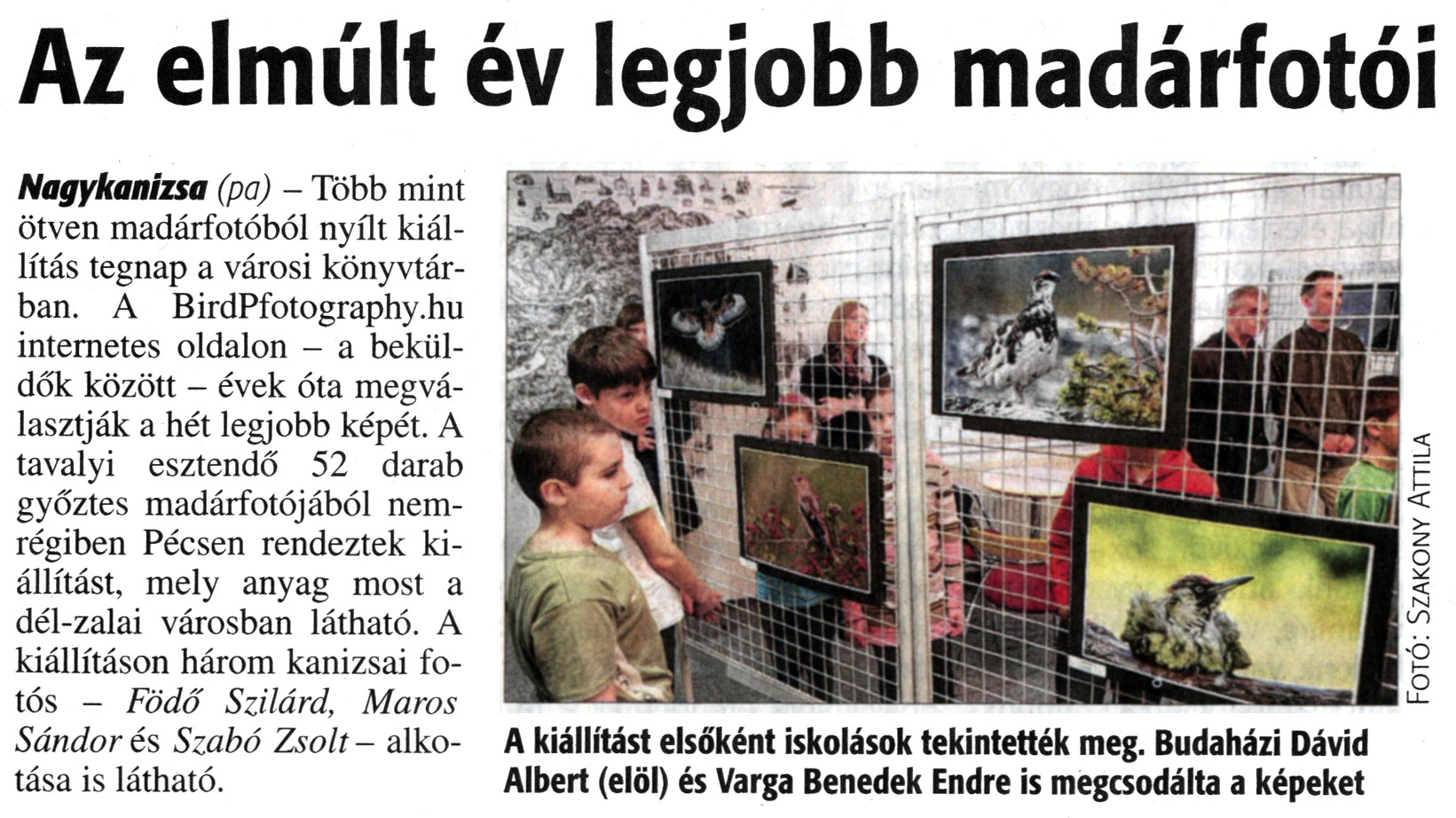 Nyilvános 1492 | 3105 | Zalai Hírlap 2015. március 10. 58. szám 3. oldal - Az elmúlt év legjobb madárfotói | Az elmúlt év legjobb madárfotói Nagykanizsa (pa) - Több mint ötven madárfotóból nyílt kiállítás tegnap a városi könyvtárban. A BirdPfotography.hu internetes oldalon - a beküldők között - évek óta megválasztják a hét legjobb képét. A tavalyi esztendő 52 darab győztes madárfotójából nemrégiben Pécsen rendeztek kiállítást, mely anyag most a dél-zalai városban látható. A kiállításon három kanizsai fotós - Födő Szilárd, Maros Sándor és Szabó Zsolt - alkotása is látható. A kiállítást elsőként iskolások tekintették meg. Budaházi Dávid Albert (elöl) és Varga Benedek Endre is megcsodálta a képeket |