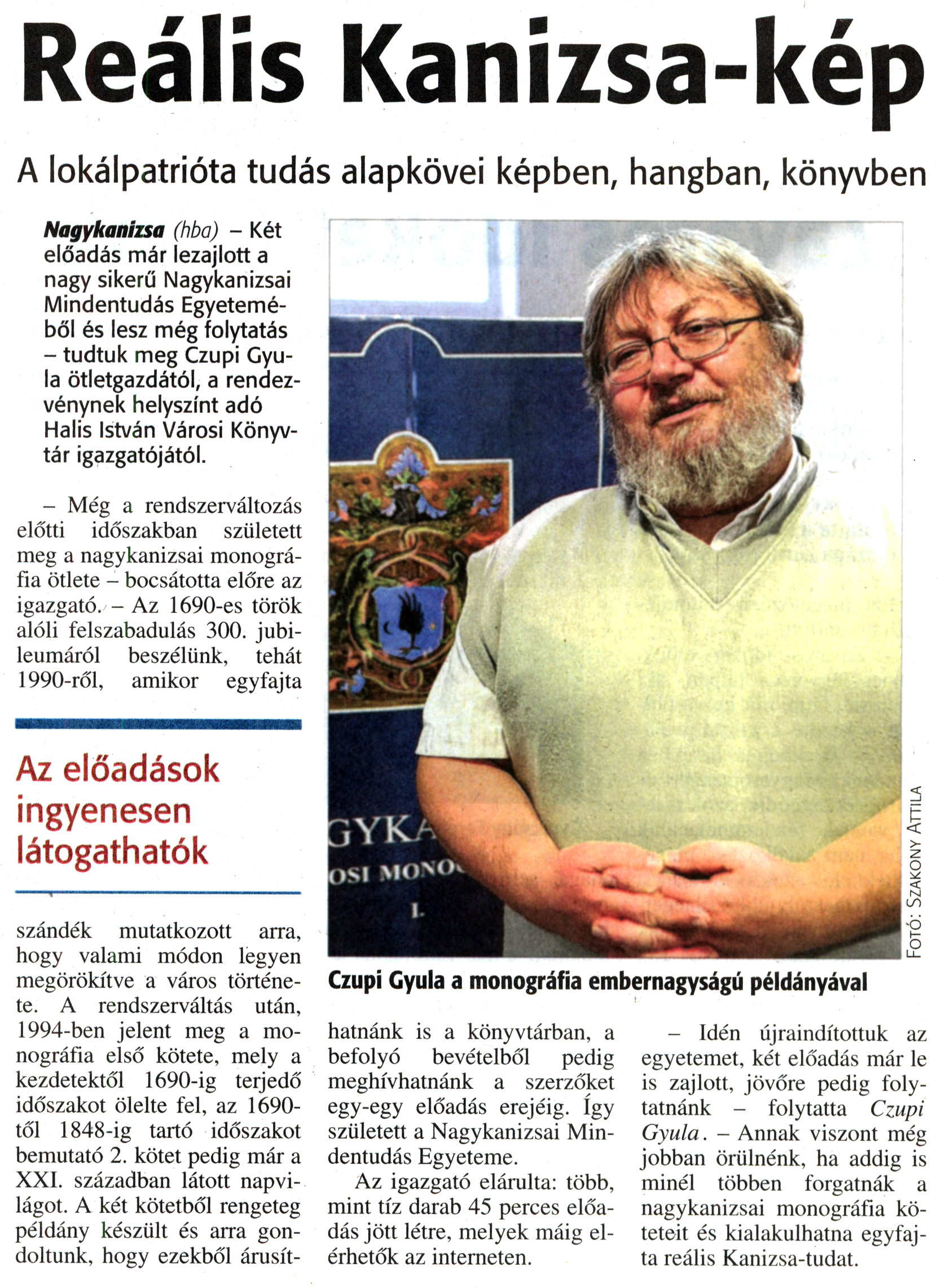 Nyilvános 1686 | 3783 | Zalai Hírlap 2015. november 19. 271. szám 4. oldal | Reális Kanizsa-kép A lokálpatrióta tudás alapkövei képben, hangban, könyvben Nagykanizsa (hba) - Két előadás már lezajlott a nagy sikerű Nagykanizsai Mindentudás Egyeteméből és lesz még folytatás - tudtuk meg Czupi Gyula ötletgazdától, a rendezvénynek helyszínt adó Halis István Városi Könyvtár igazgatójától. - Még a rendszerváltozás előtti időszakban született meg a nagykanizsai monográfia ötlete - bocsátotta előre az igazgató. - Az 1690-es török alóli felszabadulás 300. jubileumáról beszélünk, tehát 1990-ről, amikor egyfajta szándék mutatkozott arra, hogy valami módon legyen megörökítve a város története. A rendszerváltás után, 1994-ben jelent meg a monográfia első kötete, mely a kezdetektől 1690-ig terjedő időszakot ölelte fel, az 1690-től 1848-ig tartó időszakot bemutató 2. kötet pedig már a XXI. században látott napvilágot. A két kötetből rengeteg példány készült és arra gondoltunk, hogy ezekből árusíthatnánk is a könyvtárban, a befolyó bevételből pedig meghívhatnánk a szerzőket egy-egy előadás erejéig. Így született a Nagykanizsai Mindentudás Egyeteme. Az igazgató elárulta: több, mint tíz darab 45 perces előadás jött létre, melyek máig elérhetők az interneten. - Idén újraindítottuk az egyetemet, két előadás már le is zajlott, jövőre pedig folytatnánk - folytatta Czupi Gyula. - Annak viszont még jobban örülnénk, ha addig is minél többen forgatnák a nagykanizsai monográfia köteteit és kialakulhatna egyfajta reális Kanizsa-tudat. |