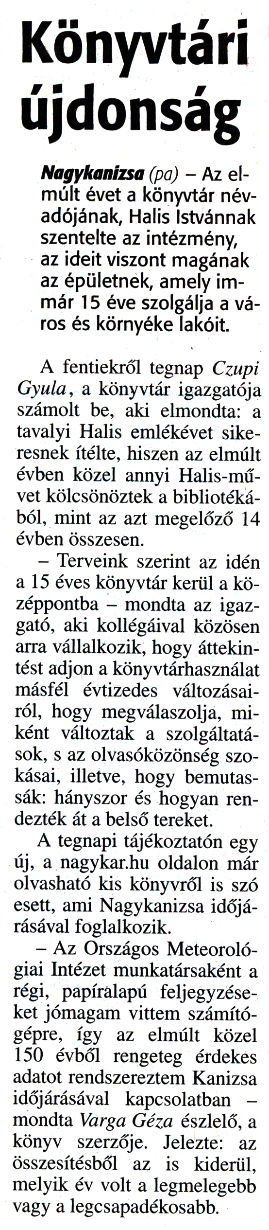 Nyilvános 1834 | 3689 | Zalai Hírlap 2016. január 6. 4. szám 3. oldal - Könyvtári újdonság | Könyvtári újdonság Nagykanizsa (pa) - Az elmúlt évet a könyvtár névadójának, Halis Istvánnak szentelte az intézmény, az ideit viszont magának az épületnek, amely immár 15 éve szolgálja a város és környéke lakóit. A fentiekről tegnap Czupi Gyula, a könyvtár igazgatója számolt be, aki elmondta: a tavalyi Halis emlékévet sikeresnek ítélte, hiszen az elmúlt évben közel annyi Halis-művet kölcsönöztek a bibliotékából, mint az azt megelőző 14 évben összesen. - Terveink szerint az idén a 15 éves könyvtár kerül a középpontba - mondta az igazgató, aki kollégáival közösen arra vállalkozik, hogy áttekintést adjon a könyvtárhasználat másfél évtizedes változásairól, hogy megválaszolja, miként változtak a szolgáltatások, s az olvasóközönség szokásai, illetve, hogy bemutassák: hányszor és hogyan rendezték át a belső tereket. A tegnapi tájékoztatón egy új, a nagykar.hu oldalon már olvasható kis könyvről is szó esett, ami Nagykanizsa időjárásával foglalkozik. - Az Országos Meteorológiai Intézet munkatársaként a régi, papíralapú feljegyzéseket jómagam vittem számítógépre, így az elmúlt közel 150 évből rengeteg érdekes adatot rendszereztem Kanizsa időjárásával kapcsolatban - mondta Varga Géza észlelő, a könyv szerzője. Jelezte: az összesítésből az is kiderül, melyik év volt a legmelegebb vagy a legcsapadékosabb. |