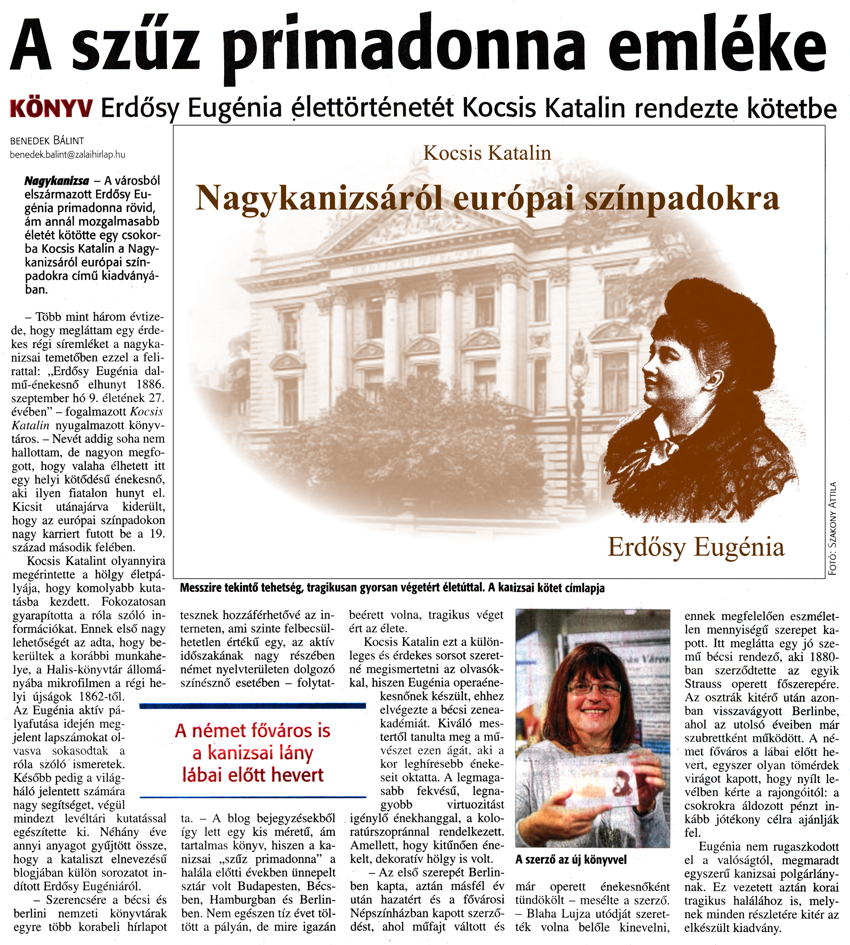Nyilvános 1774 | 3358 | Zalai Hírlap 2016. december 28. 304. szám 7. oldal | A szűz primadonna emléke KÖNYV Erdősy Eugénia élettörténetét Kocsis Katalin rendezte kötetbe BENEDEK BÁLINT Nagykanizsa - A városból elszármazott Erdősy Eugénia primadonna rövid, ám annál mozgalmasabb életét kötötte egy csokorba Kocsis Katalin a Nagykanizsáról európai színpadokra című kiadványában. - Több mint három évtizede, hogy megláttam egy érdekes régi síremléket a nagykanizsai temetőben ezzel a felirattal: „Erdősy Eugénia dalmű-énekesnő elhunyt 1886. szeptember hó 9. életének 27. évében" - fogalmazott Kocsis Katalin nyugalmazott könyvtáros. - Nevét addig soha nem hallottam, de nagyon megfogott, hogy valaha élhetett itt egy helyi kötődésű énekesnő, aki ilyen fiatalon hunyt el. Kicsit utánajárva kiderült, hogy az európai színpadokon nagy karriert futott be a 19. század második felében. Kocsis Katalint olyannyira megérintette a hölgy életpályája, hogy komolyabb kutatásba kezdett. Fokozatosan gyarapította a róla szóló információkat. Ennek első nagy lehetőségét az adta, hogy bekerültek a korábbi munkahelye, a Halis-könyvtár állományába mikrofilmen a régi helyi újságok 1862-től. Az Eugénia aktív pályafutása idején megjelent lapszámokat olvasva sokasodtak a róla szóló ismeretek. Később pedig a világháló jelentett számára nagy segítséget, végül mindezt levéltári kutatással egészítette ki. Néhány éve annyi anyagot gyűjtött össze, hogy a kataliszt elnevezésű blogjában külön sorozatot indított Erdősy Eugéniáról. - Szerencsére a bécsi és berlini nemzeti könyvtárak egyre több korabeli hírlapot Fotó: Szakony Attila Messzire tekintő tehetség, tragikusan gyorsan végetért életúttal. A kaiizsai kötet címlapja tesznek hozzáférhetővé az interneten, ami szinte felbecsülhetetlen értékű egy, az aktív időszakának nagy részében német nyelvterületen dolgozó színésznő esetében - folytatta. - A blog bejegyzésekből így lett egy kis méretű, ám tartalmas könyv, hiszen a kanizsai „szűz primadonna" a halála előtti években ünnepelt sztár volt Budapesten, Bécsben, Hamburgban és Berlinben. Nem egészen tíz évet töltött a pályán, de mire igazán beérett volna, tragikus véget ért az élete. Kocsis Katalin ezt a különleges és érdekes sorsot szeretné megismertetni az olvasókkal, hiszen Eugénia operaénekesnőnek készült, ehhez elvégezte a bécsi zeneakadémiát. Kiváló mestertől tanulta meg a művészet ezen ágát, aki a kor leghíresebb énekeseit oktatta. A legmagasabb fekvésű, legnagyobb virtuozitást igénylő énekhanggal, a koloratúrszopránnal rendelkezett. Amellett, hogy kitűnően énekelt, dekoratív hölgy is volt. - Az első szerepét Berlinben kapta, aztán másfél év után hazatért és a fővárosi Népszínházban kapott szerződést, ahol műfajt váltott és A szerző az új könyvvel már operett énekesnőként tündökölt - mesélte a szerző. - Blaha Lujza utódját szerették volna belőle kinevelni, ennek megfelelően eszméletlen mennyiségű szerepet kapott. Itt meglátta egy jó szemű bécsi rendező, aki 1880-ban szerződtette az egyik Strauss operett főszerepére. Az osztrák kitérő után azonban visszavágyott Berlinbe, ahol az utolsó éveiben már szubrettként működött. A német főváros a lábai előtt hevert, egyszer olyan tömérdek virágot kapott, hogy nyílt levélben kérte a rajongóitól: a csokrokra áldozott pénzt inkább jótékony célra ajánlják fel. Eugénia nem rugaszkodott el a valóságtól, megmaradt egyszerű kanizsai polgárlánynak. Ez vezetett aztán korai tragikus halálához is, melynek minden részletére kitér az elkészült kiadvány. |