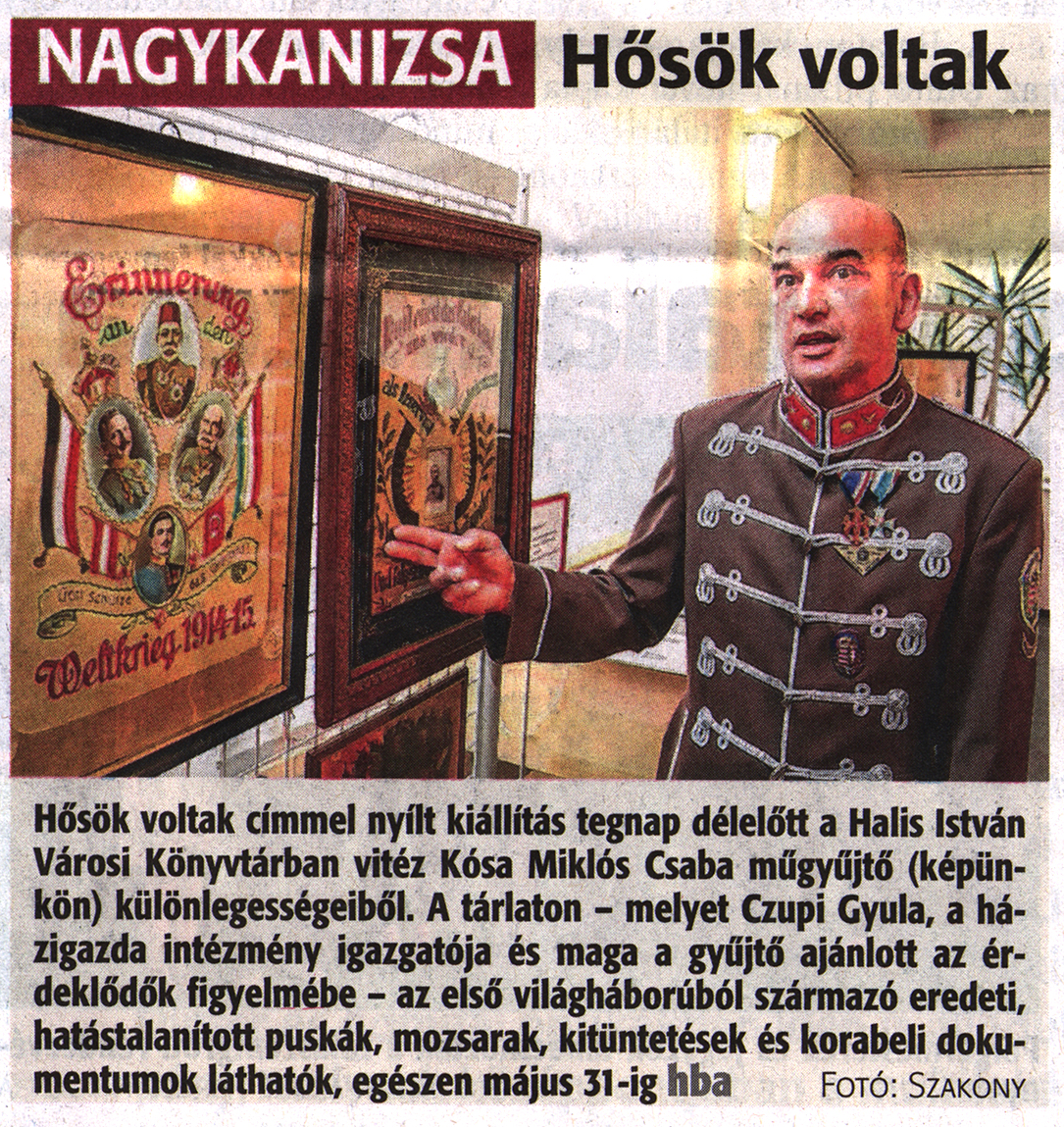 Nyilvános 1779 | 3406 | Zalai Hírlap 2017. május 10. 107. szám 3. oldal | NAGYKANIZSA Hősök voltak Hősök voltak címmel nyílt kiállítás tegnap délelőtt a Halis István Városi Könyvtárban vitéz Kósa Miklós Csaba műgyűjtő (képünkön) különlegességeiből. A tárlaton - melyet Czupi Gyula, a házigazda intézmény igazgatója és maga a gyűjtő ajánlott az érdeklődők figyelmébe - az első világháborúból származó eredeti, hatástalanított puskák, mozsarak, kitüntetések és korabeli dokumentumok láthatók, egészen május 31 -ig hba Fotó: Szakony |
