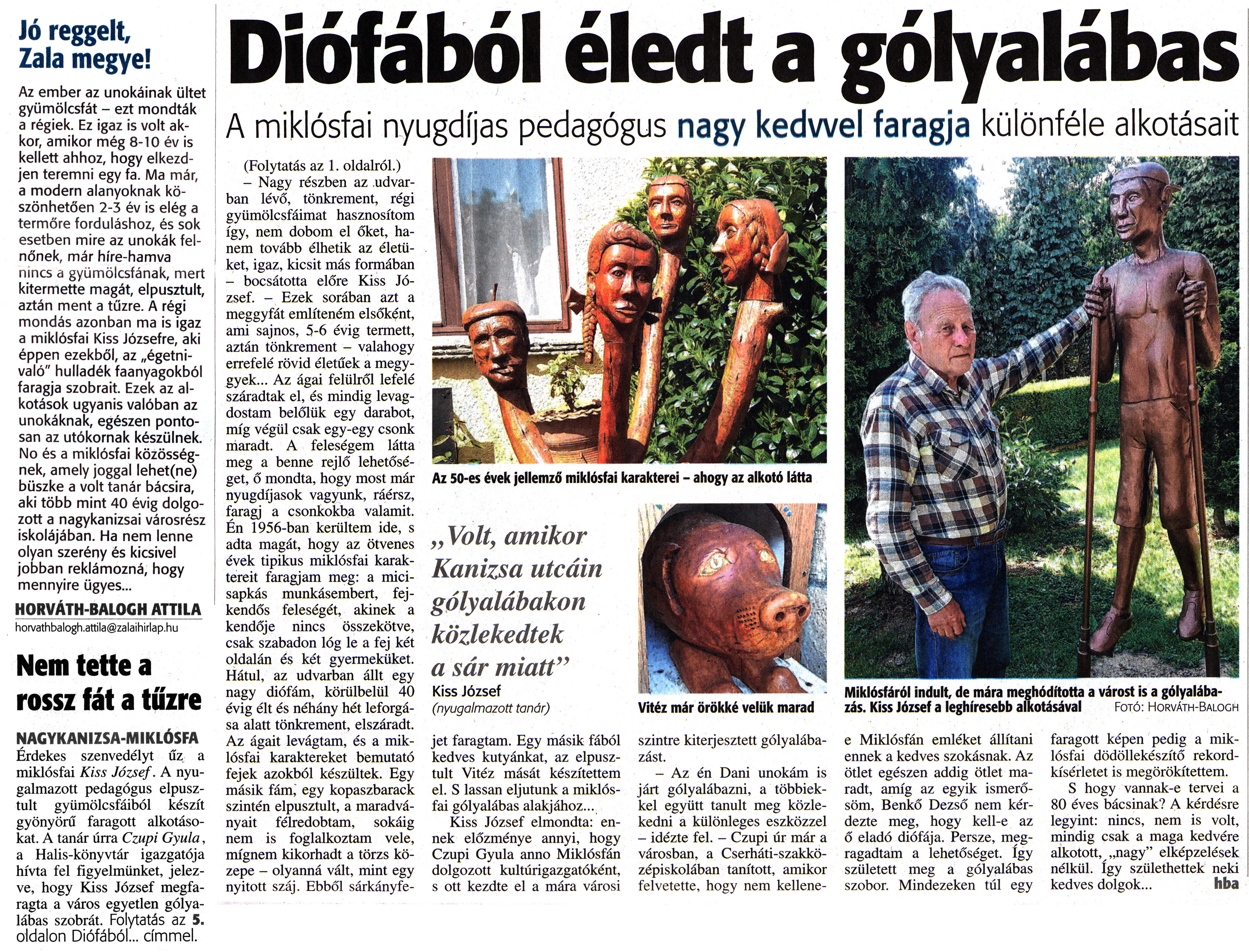 Nyilvános 1488 | 2376 | Zalai Hírlap 2017. május 24. 119. szám 5. oldal - Diófából éledt a gólyalábas | Jó reggelt, Zala megyei Az ember az unokáinak ültet gyümölcsfát - ezt mondták a régiek. Ez igaz is volt akkor, amikor még 8-10 év is kellett ahhoz, hogy elkezdjen teremni egy fa. Ma már, a modern alanyoknak köszönhetően 2-3 év is elég a termőre forduláshoz, és sok esetben mire az unokák felnőnek, már híre-hamva nincs a gyümölcsfának, mert kitermette magát, elpusztult, aztán ment a tűzre. A régi mondás azonban ma is igaz a miklósfai Kiss Józsefre, aki éppen ezekből, az „égetni-való" hulladék faanyagokból faragja szobrait. Ezek az alkotások ugyanis valóban az unokáknak, egészen pontosan az utókornak készülnek. No és a miklósfai közösségnek, amely joggal lehet(ne) büszke a volt tanár bácsira, aki több mint 40 évig dolgozott a nagykanizsai városrész iskolájában. Ha nem lenne olyan szerény és kicsivel jobban reklámozná, hogy mennyire ügyes... HORVÁTH-BALOGH ATTILA horvathbalogh.attila@zalaihirlap.hu Nem tette a rossz fát a tűzre NAGYKANIZSA-MIKLÓSFA Érdekes szenvedélyt űz a miklósfai Kiss József. A nyugalmazott pedagógus elpusztult gyümölcsfáiból készít gyönyörű faragott alkotásokat. A tanár úrra Czupi Gyula, a Halis-könyvtár igazgatója hívta fel figyelmünket, jelezve, hogy Kiss József megfaragta a város egyetlen gólyalábas szobrát. Folytatás az 5. oldalon Diófából... címmel. Diófából éledt a gólyalábas A miklósfai nyugdíjas pedagógus nagy kedvvel faragja különféle alkotásait Miklósfáról indult, de mára meghódította a várost is a gólyalábazás. Kiss József a leghíresebb alkotásával Fotó: Horváth-Balogh e Miklósfán emléket állítani ennek a kedves szokásnak. Az ötlet egészen addig ötlet maradt, amíg az egyik ismerősöm, Benkő Dezső nem kérdezte meg, hogy kell-e az ő eladó diófája. Persze, megragadtam a lehetőséget. így született meg a gólyalábas szobor. Mindezeken túl egy faragott képen pedig a miklósfai dödöllekészítő rekordkísérletet is megörökítettem. S hogy vannak-e tervei a 80 éves bácsinak? A kérdésre legyint: nincs, nem is volt, mindig csak a maga kedvére alkotott, „nagy" elképzelések nélkül. így születhettek neki kedves dolgok... Hba (Folytatás az 1. oldalról.) - Nagy részben az udvarban lévő, tönkrement, régi gyümölcsfáimat hasznosítom így, nem dobom el őket, hanem tovább élhetik az életüket, igaz, kicsit más formában - bocsátotta előre Kiss József. - Ezek sorában azt a meggyfát említeném elsőként, ami sajnos, 5-6 évig termett, aztán tönkrement - valahogy errefelé rövid életűek a meggyek... Az ágai felülről lefelé száradtak el, és mindig levagdostam belőlük egy darabot, míg végül csak egy-egy csonk maradt. A feleségem látta meg a benne rejlő lehetőséget, ő mondta, hogy most már nyugdíjasok vagyunk, ráérsz, faragj a csonkokba valamit. Én 1956-ban kerültem ide, s adta magát, hogy az ötvenes évek tipikus miklósfai karaktereit faragjam meg: a mici-sapkás munkásembert, fejkendős feleségét, akinek a kendője nincs összekötve, csak szabadon lóg le a fej két oldalán és két gyermeküket. Hátul, az udvarban állt egy nagy diófám, körülbelül 40 évig élt és néhány hét leforgása alatt tönkrement, elszáradt. Az ágait levágtam, és a miklósfai karaktereket bemutató fejek azokból készültek. Egy másik fám, egy kopaszbarack szintén elpusztult, a maradványait félredobtam, sokáig nem is foglalkoztam vele, mígnem kikorhadt a törzs közepe - olyanná vált, mint egy nyitott száj. Ebből sárkányfejet faragtam. Egy másik fából kedves kutyánkat, az elpusztult Vitéz mását készítettem el. S lassan eljutunk a miklósfai gólyalábas alakjához... Kiss József elmondta: ennek előzménye annyi, hogy Czupi Gyula anno Miklósfán dolgozott kultúrigazgatóként, s ott kezdte el a mára városi Vitéz már örökké velük marad szintre kiterjesztett gólyalábazást. - Az én Dani unokám is járt gólyalábazni, a többiekkel együtt tanult meg közlekedni a különleges eszközzel - idézte fel. - Czupi úr már a városban, a Cserháti-szakközépiskolában tanított, amikor felvetette, hogy nem kellene- Az 50-es évek jellemző miklósfai karakterei - ahogy az alkotó látta „ Volt, amikor Kanizsa utcáin gólyalábakon közlekedtek a sár miatt" Kiss József (nyugalmazott tanár) |