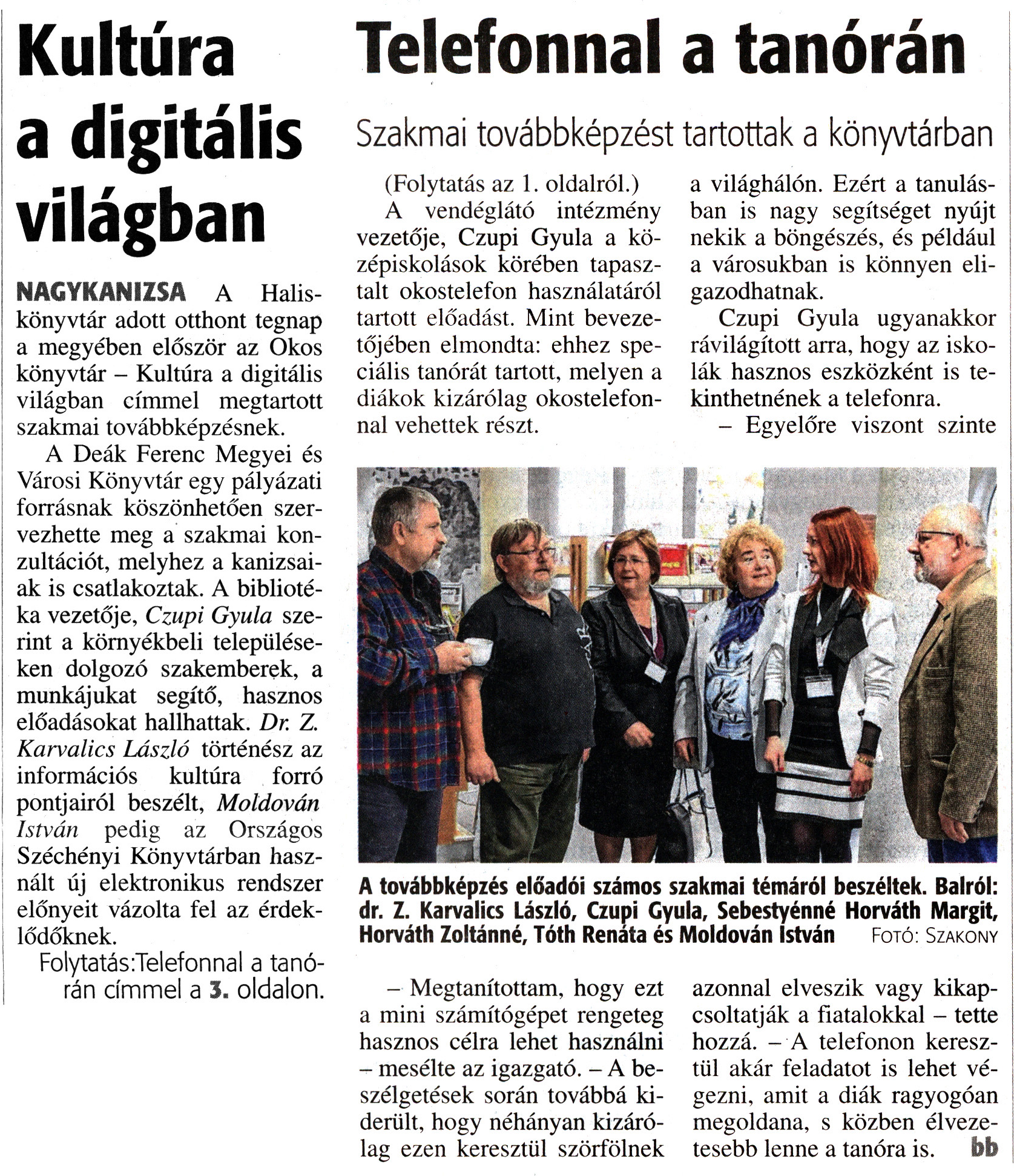 Nyilvános 1781 | 3299 | Zalai Hírlap 2017. november 21. 271. szám 1, 3. oldal | Kultúra a digitális világban NAGYKANIZSA A Halis könyvtár adott otthont tegnap a megyében először az Okos könyvtár - Kultúra a digitális világban címmel megtartott szakmai továbbképzésnek. A Deák Ferenc Megyei és Városi Könyvtár egy pályázati forrásnak köszönhetően szervezhette meg a szakmai konzultációt, melyhez a kanizsaiak is csatlakoztak. A bibliotéka vezetője, Czupi Gyula szerint a környékbeli településeken dolgozó szakemberek, a munkájukat segítő, hasznos előadásokat hallhattak. Dr. Z. Karvalics László történész az információs kultúra forró pontjairól beszélt, Moldován István pedig az Országos Széchényi Könyvtárban használt új elektronikus rendszer előnyeit vázolta fel az érdeklődőknek. Folytatás:Telefonnal a tanórán címmel a 3. oldalon. A továbbképzés előadói számos szakmai témáról beszéltek. Balról: dr. Z. Karvalics László, Czupi Gyula, Sebestyénné Horváth Margit, Horváth Zoltánné, Tóth Renáta és Moldován István Fotó: Szakony Telefonnal a tanórán Szakmai továbbképzést tartottak a könyvtárban (Folytatás az 1. oldalról.) A vendéglátó intézmény vezetője, Czupi Gyula a középiskolások körében tapasztalt okostelefon használatáról tartott előadást. Mint bevezetőjében elmondta: ehhez speciális tanórát tartott, melyen a diákok kizárólag okostelefonnal vehettek részt. - Megtanítottam, hogy ezt a mini számítógépet rengeteg hasznos célra lehet használni - mesélte az igazgató. - A beszélgetések során továbbá kiderült, hogy néhányan kizárólag ezen keresztül szörfölnek a világhálón. Ezért a tanulásban is nagy segítséget nyújt nekik a böngészés, és például a városukban is könnyen eligazodhatnak. Czupi Gyula ugyanakkor rávilágított arra, hogy az iskolák hasznos eszközként is tekinthetnének a telefonra. - Egyelőre viszont szinte azonnal elveszik vagy kikapcsoltatják a fiatalokkal - tette hozzá. - A telefonon keresztül akár feladatot is lehet végezni, amit a diák ragyogóan megoldana, s közben élvezetesebb lenne a tanóra is. bb |