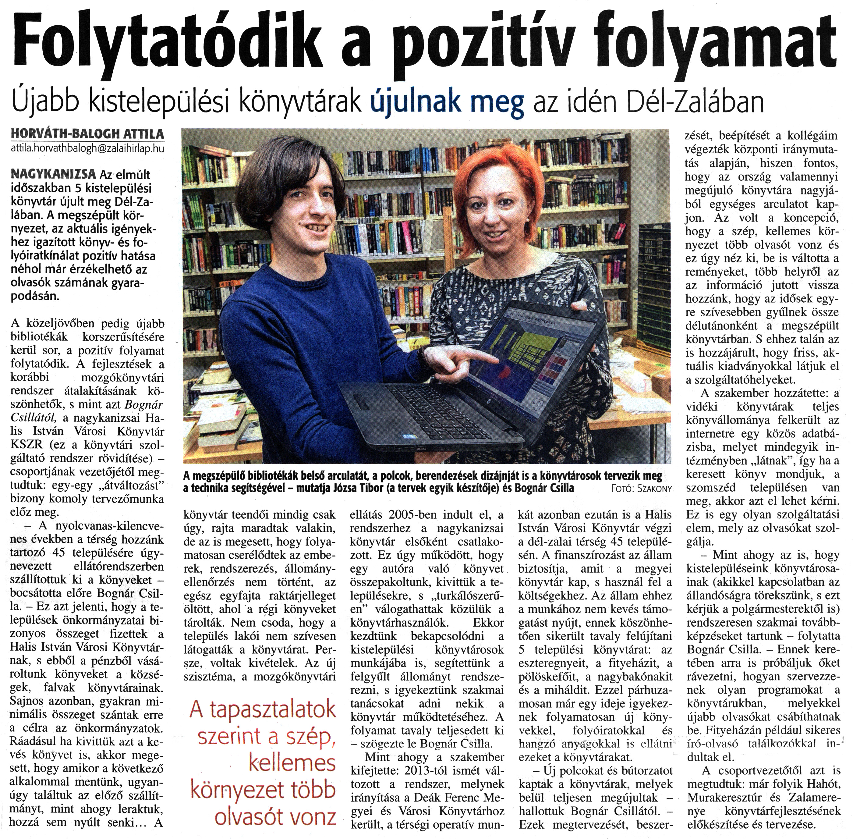 Nyilvános 1615 | 3011 | Zalai Hírlap 2018. február 15. 39. szám 6. oldal | Folytatódik a pozitív folyamat Újabb kistelepülési könyvtárak újulnak meg az idén Dél-Zalában A megszépülő bibliotékák belső arculatát, a polcok, berendezések dizájnját is a könyvtárosok tervezik meg a technika segítségével - mutatja Józsa Tibor (a tervek egyik készítője) és Bognár Csilla Fotó: Szakony HORVÁTH-BALOGH ATTILA attila.horvathbalogh@zalaihirlap.hu NAGYKANIZSA Az elmúlt időszakban 5 kistelepülési könyvtár újult meg Dél-Zalában. A megszépült környezet, az aktuális igényekhez igazított könyv- és folyóiratkínálat pozitív hatása néhol már érzékelhető az olvasók számának gyarapodásán. A közeljövőben pedig újabb bibliotékák korszerűsítésére kerül sor, a pozitív folyamat folytatódik. A fejlesztések a korábbi mozgókönyvtári rendszer átalakításának köszönhetők, s mint azt Bognár Csillától, a nagykanizsai Ha-lis István Városi Könyvtár KSZR (ez a könyvtári szolgáltató rendszer rövidítése) -csoportjának vezetőjétől megtudtuk: egy-egy „átváltozást" bizony komoly tervezőmunka előz meg. - A nyolcvanas-kilencvenes években a térség hozzánk tartozó 45 településére úgynevezett ellátórendszerben szállítottuk ki a könyveket -bocsátotta előre Bognár Csilla. - Ez azt jelenti, hogy a települések önkormányzatai bizonyos összeget fizettek a Halis István Városi Könyvtárnak, s ebből a pénzből vásároltunk könyveket a községek, falvak könyvtárainak. Sajnos azonban, gyakran minimális összeget szántak erre a célra az önkormányzatok. Ráadásul ha kivittük azt a kevés könyvet is, akkor megesett, hogy amikor a következő alkalommal mentünk, ugyanúgy találtuk az előző szállítmányt, mint ahogy leraktuk, hozzá sem nyúlt senki... A könyvtár teendői mindig csak úgy, rajta maradtak valakin, de az is megesett, hogy folyamatosan cserélődtek az emberek, rendszerezés, állományellenőrzés nem történt, az egész egyfajta raktárjelleget öltött, ahol a régi könyveket tárolták. Nem csoda, hogy a település lakói nem szívesen látogatták a könyvtárat. Persze, voltak kivételek. Az új szisztéma, a mozgókönyvtári A tapasztalatok szerint a szép, kellemes környezet több olvasót vonz ellátás 2005-ben indult el, a rendszerhez a nagykanizsai könyvtár elsőként csatlakozott. Ez úgy működött, hogy egy autóra való könyvet összepakoltunk, kivittük a településekre, s „turkálószerűen" válogathattak közülük a könyvtárhasználók. Ekkor kezdtünk bekapcsolódni a kistelepülési könyvtárosok munkájába is, segítettünk a felgyűlt állományt rendszerezni, s igyekeztünk szakmai tanácsokat adni nekik a könyvtár működtetéséhez. A folyamat tavaly teljesedett ki - szögezte le Bognár Csilla. Mint ahogy a szakember kifejtette: 2013-tól ismét változott a rendszer, melynek irányítása a Deák Ferenc Megyei és Városi Könyvtárhoz került, a térségi operatív mun- kát azonban ezután is a Halis István Városi Könyvtár végzi a dél-zalai térség 45 településén. A finanszírozást az állam biztosítja, amit a megyei könyvtár kap, s használ fel a költségekhez. Az állam ehhez a munkához nem kevés támogatást nyújt, ennek köszönhetően sikerült tavaly felújítani 5 települési könyvtárat: az eszteregnyeit, a fityeházit, a pölöskefőit, a nagybakónakit és a miháldit. Ezzel párhuzamosan már egy ideje igyekeznek folyamatosan új könyvekkel, folyóiratokkal és hangzó anyagokkal is ellátni ezeket a könyvtárakat. - Új polcokat és bútorzatot kaptak a könyvtárak, melyek belül teljesen megújultak -hallottuk Bognár Csillától. - Ezek megtervezését, beszerzését, beépítését a kollégáim végezték központi iránymutatás alapján, hiszen fontos, hogy az ország valamennyi megújuló könyvtára nagyjából egységes arculatot kapjon. Az volt a koncepció, hogy a szép, kellemes környezet több olvasót vonz és ez úgy néz ki, be is váltotta a reményeket, több helyről az az információ jutott vissza hozzánk, hogy az idősek egyre szívesebben gyűlnek össze délutánonként a megszépült könyvtárban. S ehhez talán az is hozzájárult, hogy friss, aktuális kiadványokkal látjuk el a szolgáltatóhelyeket. A szakember hozzátette: a vidéki könyvtárak teljes könyvállománya felkerült az internetre egy közös adatbázisba, melyet mindegyik intézményben „látnak", így ha a keresett könyv mondjuk, a szomszéd településen van meg, akkor azt el lehet kérni. Ez is egy olyan szolgáltatási elem, mely az olvasókat szolgálja. - Mint ahogy az is, hogy kistelepüléseink könyvtárosainak (akikkel kapcsolatban az állandóságra törekszünk, s ezt kérjük a polgármesterektől is) rendszeresen szakmai továbbképzéseket tartunk - folytatta Bognár Csilla. - Ennek keretében arra is próbáljuk őket rávezetni, hogyan szervezzenek olyan programokat a könyvtárukban, melyekkel újabb olvasókat csábíthatnak be. Fityeházán például sikeres író-olvasó találkozókkal indultak el. A csoportvezetőtől azt is megtudtuk: már folyik Hahót, Murakeresztúr és Zalamerenye könyvtárfejlesztésének előkészítése és tervezése. |