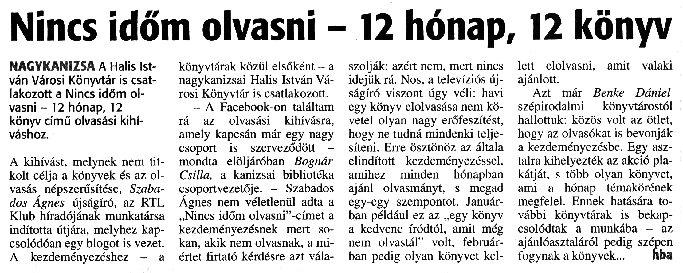 Nyilvános 1798 | 3197 | Zalai Hírlap 2018. március 6. 55. szám 13. oldal | Nincs időm olvasni - 12 hónap, 12 könyv NAGYKANIZSA A Halis István Városi Könyvtár is csatlakozott a Nincs időm olvasni - 12 hónap, 12 könyv című olvasási kihíváshoz. A kihívást, melynek nem titkolt célja a könyvek és az olvasás népszerűsítése, Szabados Ágnes újságíró, az RTL Klub híradójának munkatársa indította útjára, melyhez kapcsolódóan egy blogot is vezet. A kezdeményezéshez - a könyvtárak közül elsőként - a nagykanizsai Halis István Városi Könyvtár is csatlakozott. - A Facebook-on találtam rá az olvasási kihívásra, amely kapcsán már egy nagy csoport is szerveződött -mondta elöljáróban Bognár Csilla, a kanizsai bibliotéka csoportvezetője. - Szabados Ágnes nem véletlenül adta a „Nincs időm olvasni"-címet a kezdeményezésnek mert sokan, akik nem olvasnak, a miértet firtató kérdésre azt válaszolják: azért nem, mert nincs idejük rá. Nos, a televíziós újságíró viszont úgy véli: havi egy könyv elolvasása nem követel olyan nagy erőfeszítést, hogy ne tudná mindenki teljesíteni. Erre ösztönöz az általa elindított kezdeményezéssel, amihez minden hónapban ajánl olvasmányt, s megad egy-egy szempontot. Januárban például ez az „egy könyv a kedvenc íródtól, amit még nem olvastál" volt, februárban pedig olyan könyvet kellett elolvasni, amit valaki ajánlott. Azt már Benke Dániel szépirodalmi könyvtárostól hallottuk: közös volt az ötlet, hogy az olvasókat is bevonják a kezdeményezésbe. Egy asztalra kihelyezték az akció plakátját, s több olyan könyvet, ami a hónap témakörének megfelel. Ennek hatására további könyvtárak is bekapcsolódtak a munkába - az ajánlóasztaláról pedig szépen fogynak a könyvek... hba |