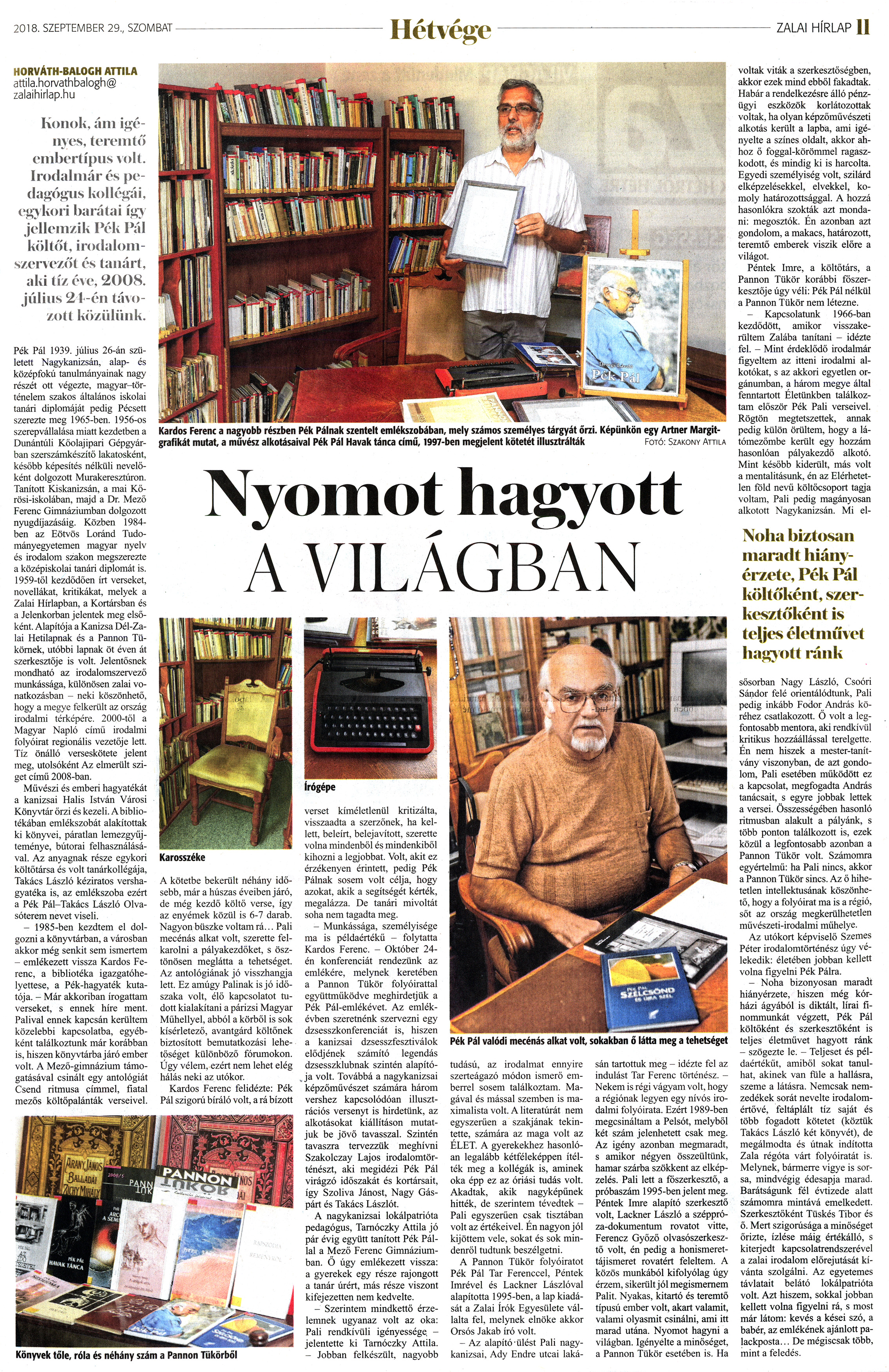 Nyilvános 2081 | 3960 | Zalai Hírlap 2018. szeptember 29. 227. szám 11. oldal - Nyomot hagyott a világban | HORVÁTH-BALOGH ATTILA attila.horvathbalogh@ zalaihirlap.hu Konok, ám igényes, teremtő embertípus volt. Irodalmár és pedagógus kollégái, egykori barátai így jellemzik Pék Pál költőt, irodalomszervezőt és tanárt, aki tíz éve, 2008. július 21 -én távozott közülünk. Pék Pál 1939. július 26-án született Nagykanizsán, alap- és középfokú tanulmányainak nagy részét ott végezte, magyar-történelem szakos általános iskolai tanári diplomáját pedig Pécsett szerezte meg 1965-ben. 1956-os szerepvállalása miatt kezdetben a Dunántúli Kőolajipari Gépgyárban szerszámkészítő lakatosként, később képesítés nélküli nevelőként dolgozott Murakeresztúron. Tanított Kiskanizsán, a mai Kőrösi-iskolában, majd a Dr. Mező Ferenc Gimnáziumban dolgozott nyugdíjazásáig. Közben 1984-ben az Eötvös Loránd Tudományegyetemen magyar nyelv és irodalom szakon megszerezte a középiskolai tanári diplomát is. 1959-től kezdődően írt verseket, novellákat, kritikákat, melyek a Zalai Hírlapban, a Kortársban és a Jelenkorban jelentek meg elsőként. Alapítója a Kanizsa Dél-Zalai Hetilapnak és a Pannon Tükörnek, utóbbi lapnak öt éven át szerkesztője is volt. Jelentősnek mondható az irodalomszervező munkássága, különösen zalai vonatkozásban - neki köszönhető, hogy a megye felkerült az ország irodalmi térképére. 2000-től a Magyar Napló című irodalmi folyóirat regionális vezetője lett. Tíz önálló verseskötete jelent meg, utolsóként Az elmerült sziget című 2008-ban. Művészi és emberi hagyatékát a kanizsai Halis István Városi Könyvtár őrzi és kezeli. A bibliotékában emlékszobát alakítottak ki könyvei, páratlan lemezgyűjteménye, bútorai felhasználásával. Az anyagnak része egykori költőtársa és volt tanárkollégája, Takács László kéziratos vershagyatéka is, az emlékszoba ezért a Pék Pál-Takács László Olvasóterem nevet viseli. - 1985-ben kezdtem el dolgozni a könyvtárban, a városban akkor még senkit sem ismertem - emlékezett vissza Kardos Ferenc, a bibliotéka igazgatóhelyettese, a Pék-hagyaték kutatója. - Már akkoriban írogattam verseket, s ennek híre ment. Palival ennek kapcsán kerültem közelebbi kapcsolatba, egyébként találkoztunk már korábban is, hiszen könyvtárba járó ember volt. A Mező-gimnázium támogatásával csinált egy antológiát Csend ritmusa címmel, fiatal mezős költőpalánták verseivel. Karosszéke A kötetbe bekerült néhány idősebb, már a húszas éveiben járó, de még kezdő költő verse, így az enyémek közül is 6-7 darab. Nagyon büszke voltam rá... Pali mecénás alkat volt, szerette felkarolni a pályakezdőket, s ösztönösen meglátta a tehetséget. Az antológiának jó visszhangja lett. Ez amúgy Palinak is jó időszaka volt, élő kapcsolatot tudott kialakítani a párizsi Magyar Műhellyel, abból a körből is sok kísérletező, avantgárd költőnek biztosított bemutatkozási lehetőséget különböző fórumokon. Úgy vélem, ezért nem lehet elég hálás neki az utókor. Kardos Ferenc felidézte: Pék Pál szigorú bíráló volt, a rá bízott verset kíméletlenül kritizálta, visszaadta a szerzőnek, ha kellett, beleírt, belejavított, szerette volna mindenből és mindenkiből kihozni a legjobbat. Volt, akit ez érzékenyen érintett, pedig Pék Pálnak sosem volt célja, hogy azokat, akik a segítségét kérték, megalázza. De tanári mivoltát soha nem tagadta meg. - Munkássága, személyisége ma is példaértékű - folytatta Kardos Ferenc. - Október 24-én konferenciát rendezünk az emlékére, melynek keretében a Pannon Tükör folyóirattal együttműködve meghirdetjük a Pék Pál-emlékévet. Az emlékévben szeretnénk szervezni egy dzsesszkonferenciát is, hiszen a kanizsai dzsesszfesztiválok elődjének számító legendás dzsesszklubnak szintén alapítója volt. Továbbá a nagykanizsai képzőművészet számára három vershez kapcsolódóan illusztrációs versenyt is hirdetünk, az alkotásokat kiállításon mutatjuk be jövő tavasszal. Szintén tavaszra tervezzük meghívni Szakolczay Lajos irodalomtörténészt, aki megidézi Pék Pál virágzó időszakát és kortársait, így Szoliva Jánost, Nagy Gáspárt és Takács Lászlót. A nagykanizsai lokálpatrióta pedagógus, Tarnóczky Attila jó pár évig együtt tanított Pék Pállal a Mező Ferenc Gimnáziumban. Ő úgy emlékezett vissza: a gyerekek egy része rajongott a tanár úrért, más része viszont kifejezetten nem kedvelte. - Szerintem mindkettő érzelemnek ugyanaz volt az oka: Pali rendkívüli igényessége, - jelentette ki Tarnóczky Attila. - Jobban felkészült, nagyobb tudású, az irodalmat ennyire szerteágazó módon ismerő emberrel sosem találkoztam. Magával és mással szemben is maximalista volt. A literatúrát nem egyszerűen a szakjának tekintette, számára az maga volt az ÉLET. A gyerekekhez hasonlóan legalább kétféleképpen ítélték meg a kollégák is, aminek oka épp ez az óriási tudás volt. Akadtak, akik nagyképűnek hitték, de szerintem tévedtek -Pali egyszerűen csak tisztában volt az értékeivel. Én nagyon jól kijöttem vele, sokat és sok mindenről tudtunk beszélgetni. A Pannon Tükör folyóiratot Pék Pál Tar Ferenccel, Péntek Imrével és Lackner Lászlóval alapította 1995-ben, a lap kiadását a Zalai írók Egyesülete vállalta fel, melynek elnöke akkor Orsós Jakab író volt. - Az alapító-ülést Pali nagykanizsai, Ady Endre utcai laká- sán tartottuk meg - idézte fel az indulást Tar Ferenc történész. -Nekem is régi vágyam volt, hogy a régiónak legyen egy nívós irodalmi folyóirata. Ezért 1989-ben megcsináltam a Pelsót, melyből két szám jelenhetett csak meg. Az igény azonban megmaradt, s 