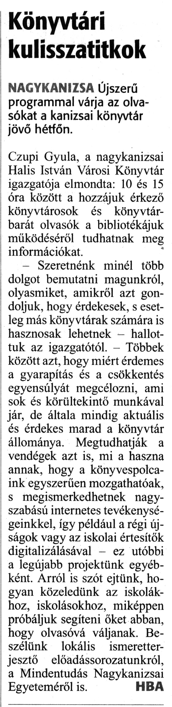 Nyilvános 1873 | 2826 | Zalai Hírlap 2018. október 5. 232. szám 7. oldal - Könyvtári kulisszatitkok | Könyvtári kulisszatitkok NAGYKANIZSA Újszerű programmal várja az olvasókat a kanizsai könyvtár jövő hétfőn. Czupi Gyula, a nagykanizsai Halis István Városi Könyvtár igazgatója elmondta: 10 és 15 óra között a hozzájuk érkező könyvtárosok és könyvtárbarát olvasók a bibliotékájuk működéséről tudhatnak meg információkat. - Szeretnénk minél több dolgot bemutatni magunkról, olyasmiket, amikről azt gondoljuk, hogy érdekesek, s esetleg más könyvtárak számára is hasznosak lehetnek - hallottuk az igazgatótól. - Többek között azt, hogy miért érdemes a gyarapítás és a csökkentés egyensúlyát megcélozni, ami sok és körültekintő munkával jár, de általa mindig aktuális és érdekes marad a könyvtár állománya. Megtudhatják a vendégek azt is, mi a haszna annak, hogy a könyvespolcaink egyszerűen mozgathatóak, s megismerkedhetnek nagyszabású internetes tevékenységeinkkel, így például a régi újságok vagy az iskolai értesítők digitalizálásával - ez utóbbi a legújabb projektünk egyébként. Arról is szót ejtünk, hogyan közeledünk az iskolákhoz, iskolásokhoz, miképpen próbáljuk segíteni őket abban, hogy olvasóvá váljanak. Beszélünk lokális ismeretterjesztő előadássorozatunkról, a Mindentudás Nagykanizsai Egyeteméről is. HBA |