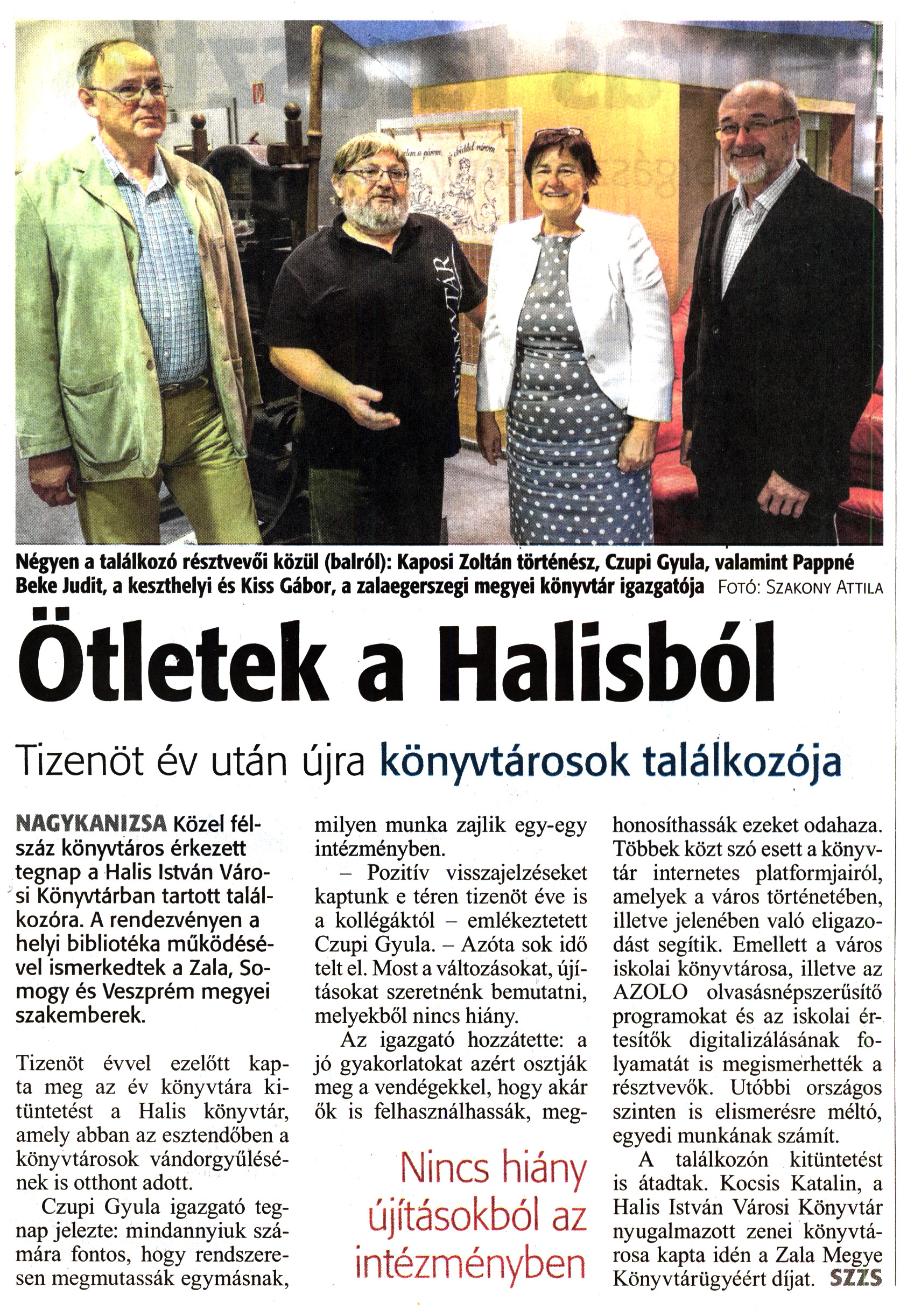 Nyilvános 1848 | 3261 | Zalai Hírlap 2018. október 9. 235. szám 4. oldal - Ötletek a Halisból | Négyen a találkozó résztvevői közül (balról): Kaposi Zoltán történész, Czupi Gyula, valamint Pappné Beke Judit, a keszthelyi és Kiss Gábor, a zalaegerszegi megyei könyvtár igazgatója Fotó: Szakony Attila Ötletek a Halisból Tizenöt év után újra könyvtárosok találkozója NAGYKANIZSA Közel félszáz könyvtáros érkezett tegnap a Halis István Városi Könyvtárban tartott találkozóra. A rendezvényen a helyi bibliotéka működésével ismerkedtek a Zala, Somogy és Veszprém megyei szakemberek. Tizenöt évvel ezelőtt kapta meg az év könyvtára kitüntetést a Halis könyvtár, amely abban az esztendőben a könyvtárosok vándorgyűlésének is otthont adott. Czupi Gyula igazgató tegnap jelezte: mindannyiuk számára fontos, hogy rendszeresen megmutassák egymásnak, milyen munka zajlik egy-egy intézményben. - Pozitív visszajelzéseket kaptunk e téren tizenöt éve is a kollégáktól - emlékeztetett Czupi Gyula. - Azóta sok idő telt el. Most a változásokat, újításokat szeretnénk bemutatni, melyekből nincs hiány. Az igazgató hozzátette: a jó gyakorlatokat azért osztják meg a vendégekkel, hogy akár ők is felhasználhassák, meg- Nincs hiány újításokból az intézményben honosíthassák ezeket odahaza. Többek közt szó esett a könyvtár internetes platformjairól, amelyek a város történetében, illetve jelenében való eligazodást segítik. Emellett a város iskolai könyvtárosa, illetve az AZOLO olvasásnépszerüsítő programokat és az iskolai értesítők digitalizálásának folyamatát is megismerhették a résztvevők. Utóbbi országos szinten is elismerésre méltó, egyedi munkának számít. A találkozón kitüntetést is átadtak. Kocsis Katalin, a Halis István Városi Könyvtár nyugalmazott zenei könyvtárosa kapta idén a Zala Megye Könyvtárügyéért díjat. SZZS |
