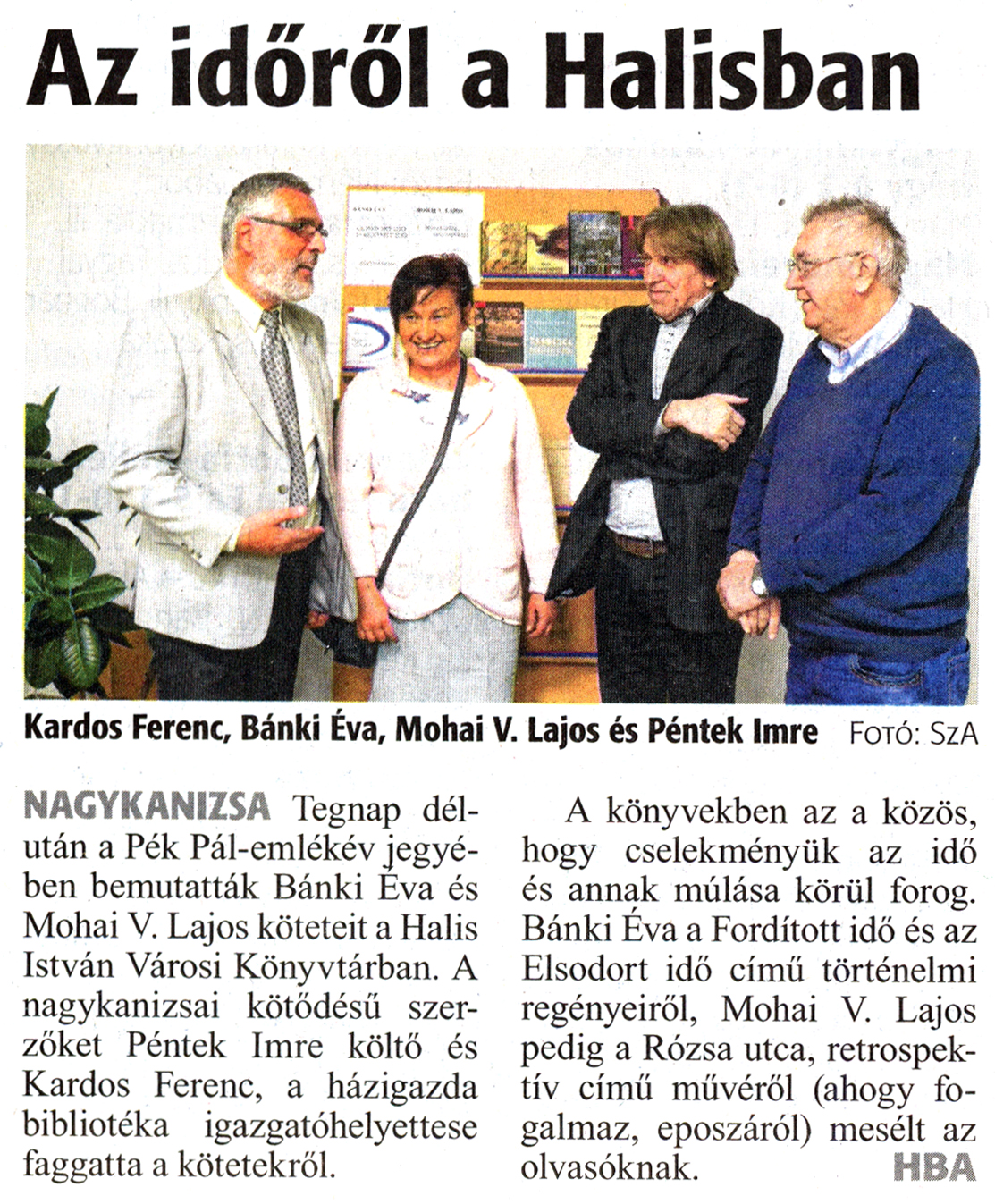 Nyilvános 1703 | 2799 | Zalai Hírlap 2018. november 7. 258. szám 16. oldal | Az időről a Halisban Kardos Ferenc, Bánki Éva, Mohai V. Lajos és Péntek Imre Fotó: SzA NAGYKANIZSA Tegnap délután a Pék Pál-emlékév jegyében bemutatták Bánki Éva és Mohai V. Lajos köteteit a Halis István Városi Könyvtárban. A nagykanizsai kötődésű szerzőket Péntek Imre költő és Kardos Ferenc, a házigazda bibliotéka igazgatóhelyettese faggatta a kötetekről. A könyvekben az a közös, hogy cselekményük az idő és annak múlása körül forog. Bánki Éva a Fordított idő és az Elsodort idő című történelmi regényeiről, Mohai V. Lajos pedig a Rózsa utca, retrospektív című művéről (ahogy fogalmaz, eposzáról) mesélt az olvasóknak. HBA |