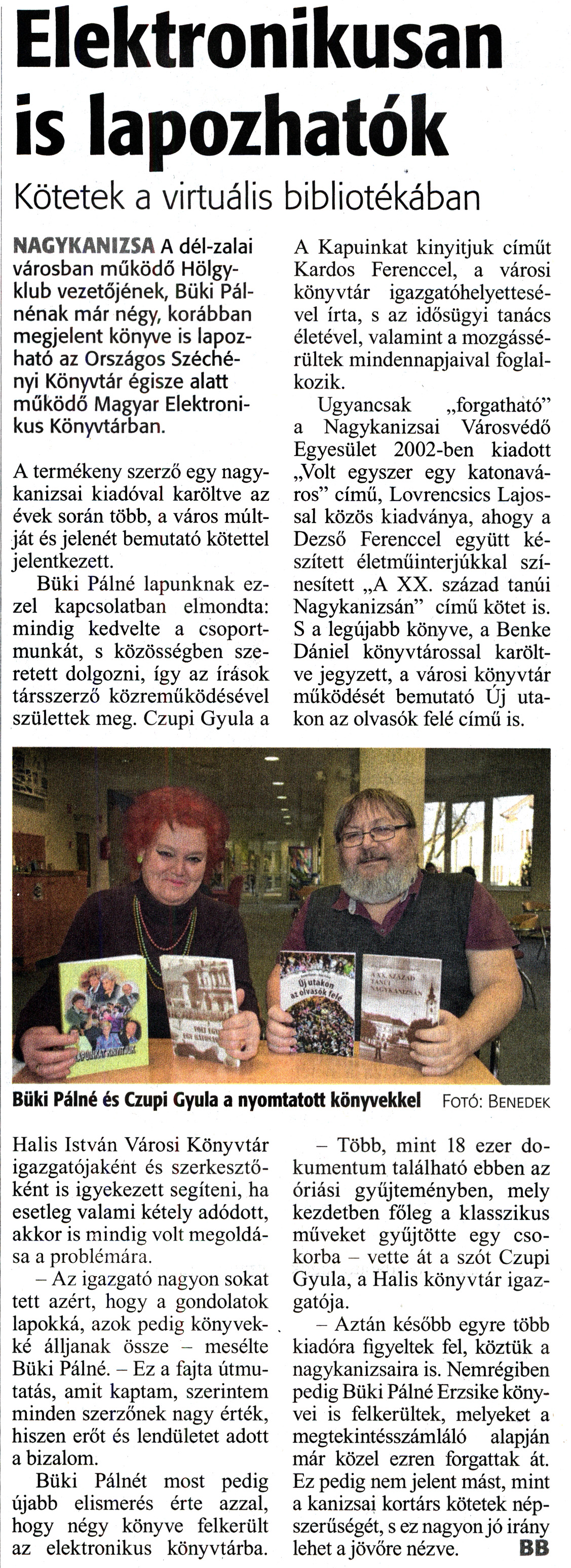 Nyilvános 1712 | 2934 | Zalai Hírlap 2019. január 16. 13. szám 7. oldal - Elektronikusan is lapozhatók | Elektronikusan is lapozhatok Kötetek a virtuális bibliotékában NAGYKANIZSA A dél-zalai városban működő Hölgyklub vezetőjének, Büki Pálnénak már négy, korábban megjelent könyve is lapozható az Országos Széchényi Könyvtár égisze alatt működő Magyar Elektronikus Könyvtárban. A termékeny szerző egy nagykanizsai kiadóval karöltve az évek során több, a város múltját és jelenét bemutató kötettel jelentkezett. Büki Pálné lapunknak ezzel kapcsolatban elmondta: mindig kedvelte a csoportmunkát, s közösségben szeretett dolgozni, így az írások társszerző közreműködésével születtek meg. Czupi Gyula a Halis István Városi Könyvtár igazgatójaként és szerkesztőként is igyekezett segíteni, ha esetleg valami kétely adódott, akkor is mindig volt megoldása a problémára. - Az igazgató nagyon sokat tett azért, hogy a gondolatok lapokká, azok pedig könyvekké álljanak össze - mesélte Büki Pálné. - Ez a fajta útmutatás, amit kaptam, szerintem minden szerzőnek nagy érték, hiszen erőt és lendületet adott a bizalom. Büki Pálnét most pedig újabb elismerés érte azzal, hogy négy könyve felkerült az elektronikus könyvtárba. A Kapuinkat kinyitjuk címűt Kardos Ferenccel, a városi könyvtár igazgatóhelyettesével írta, s az idősügyi tanács életével, valamint a mozgássérültek mindennapjaival foglalkozik. Ugyancsak „forgatható" a Nagykanizsai Városvédő Egyesület 2002-ben kiadott „Volt egyszer egy katonaváros" című, Lovrencsics Lajossal közös kiadványa, ahogy a Dezső Ferenccel együtt készített életműinterjúkkal színesített „A XX. század tanúi Nagykanizsán" című kötet is. S a legújabb könyve, a Benke Dániel könyvtárossal karöltve jegyzett, a városi könyvtár működését bemutató Új utakon az olvasók felé című is. - Több, mint 18 ezer dokumentum található ebben az óriási gyűjteményben, mely kezdetben főleg a klasszikus műveket gyűjtötte egy csokorba - vette át a szót Czupi Gyula, a Halis könyvtár igazgatója. - Aztán később egyre több kiadóra figyeltek fel, köztük a nagykanizsaira is. Nemrégiben pedig Büki Pálné Erzsike könyvei is felkerültek, melyeket a megtekintésszámláló alapján már közel ezren forgattak át. Ez pedig nem jelent mást, mint a kanizsai kortárs kötetek népszerűségét, s ez nagyon jó irány lehet a jövőre nézve. BB |