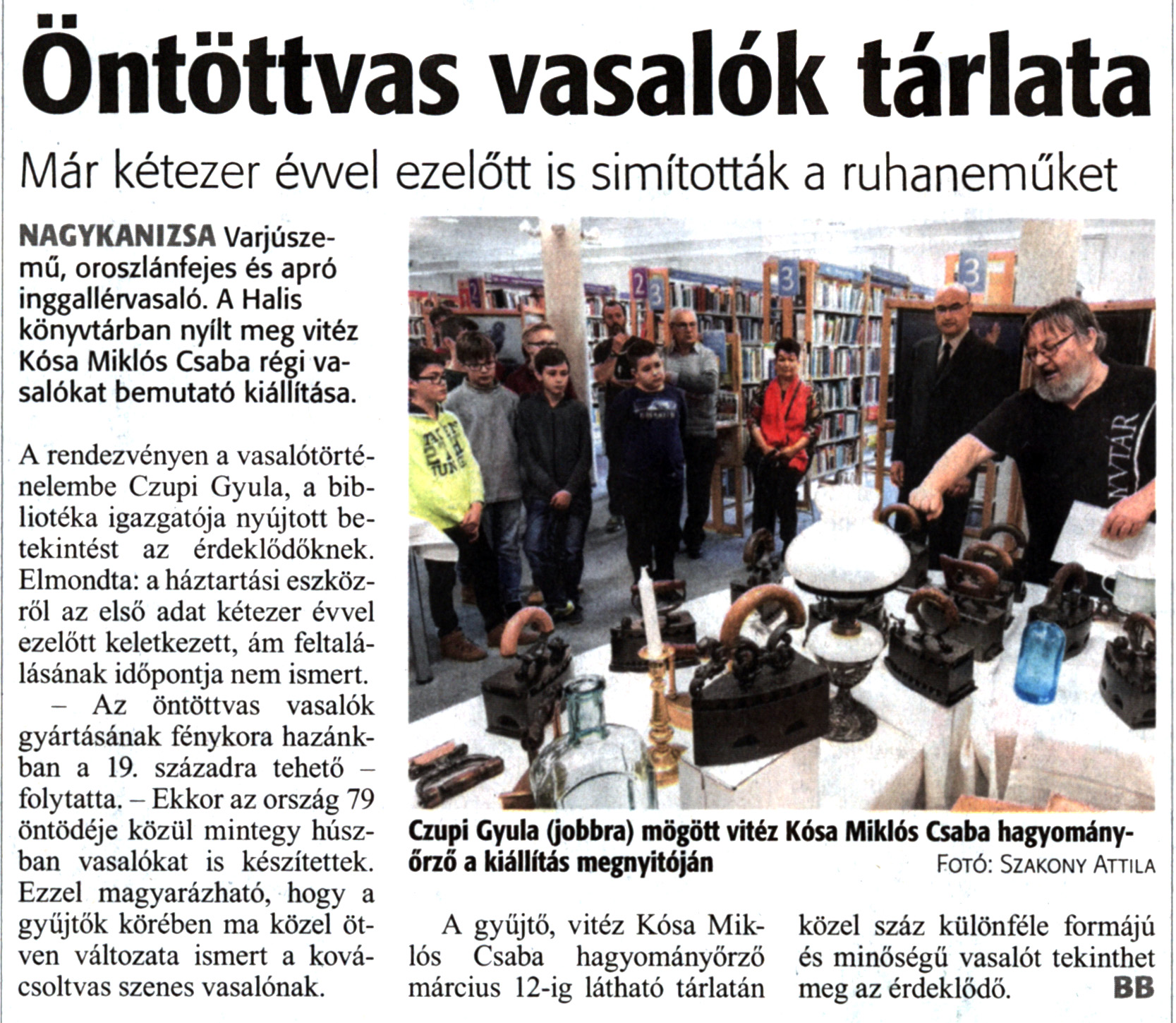 Nyilvános 1830 | 2952 | Zalai Hírlap 2019. február 14. 38. szám 16. oldal | Öntöttvas vasalók tárlata Már kétezer évvel ezelőtt is simították a ruhaneműket NAGYKANIZSA Varjúszemű, oroszlánfejes és apró inggallérvasaló. A Halis könyvtárban nyílt meg vitéz Kósa Miklós Csaba régi vasalókat bemutató kiállítása. A rendezvényen a vasalótörténelembe Czupi Gyula, a bibliotéka igazgatója nyújtott betekintést az érdeklődőknek. Elmondta: a háztartási eszközről az első adat kétezer évvel ezelőtt keletkezett, ám feltalálásának időpontja nem ismert. - Az öntöttvas vasalók gyártásának fénykora hazánkban a 19. századra tehető -folytatta. - Ekkor az ország 79 öntödéje közül mintegy húszban vasalókat is készítettek. Ezzel magyarázható, hogy a gyűjtők körében ma közel ötven változata ismert a kovácsoltvas szenes vasalónak. A gyűjtő, vitéz Kósa Miklós Csaba hagyományőrző március 12-ig látható tárlatán közel száz különféle formájú és minőségű vasalót tekinthet meg az érdeklődő. BB Czupi Gyula (jobbra) mögött vitéz Kósa Miklós Csaba hagyományőrző a kiállítás megnyitóján Fotó: Szakony Attila |