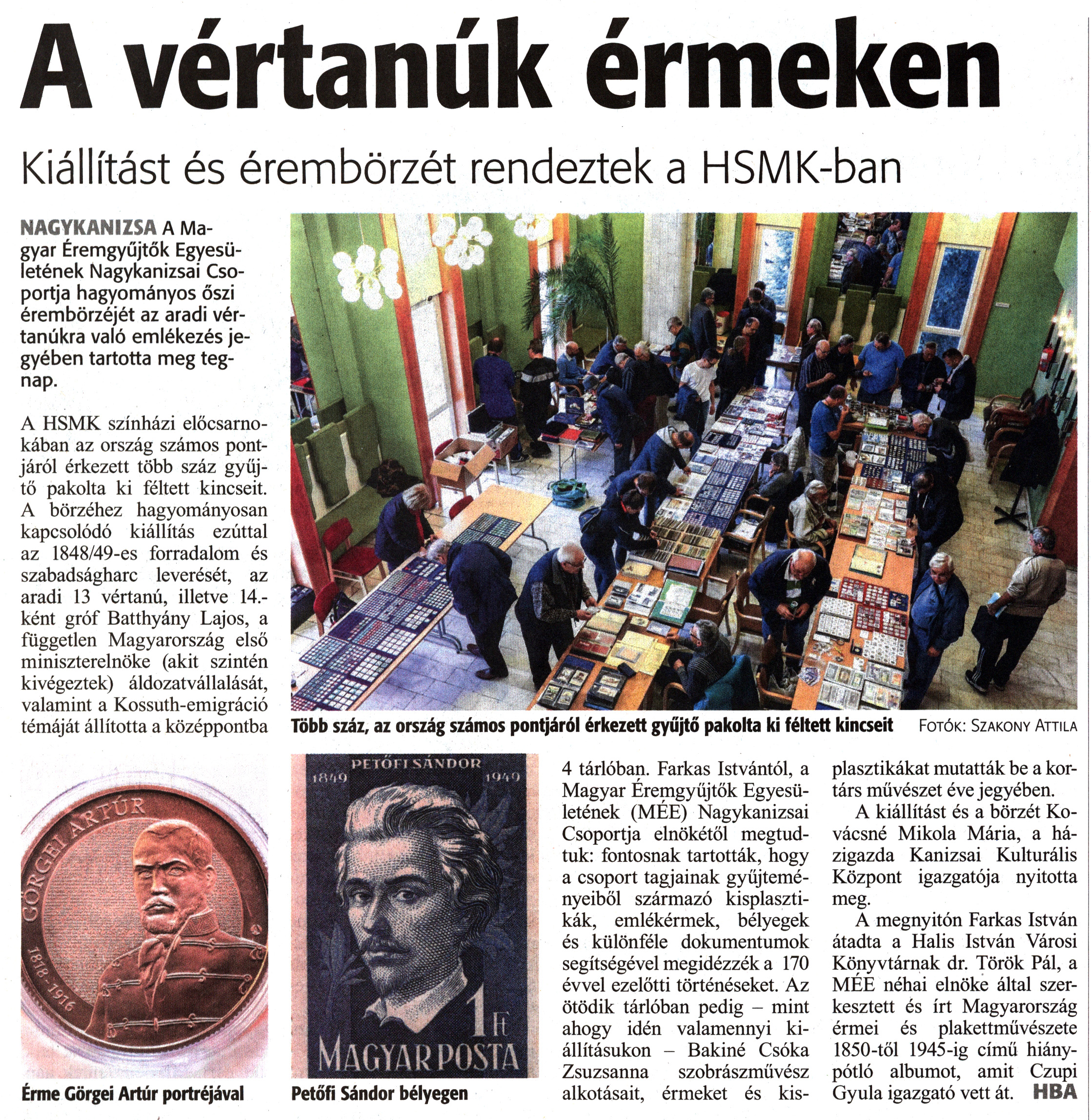 Nyilvános 1495 | 2191 | Zalai Hírlap 2019. november 4. 255. szám 3. oldal - A vértanúk érmeken | A vértanúk érmeken Kiállítást és érembörzét rendeztek a HSMK-ban NAGYKANIZSA A Magyar Éremgyűjtők Egyesületének Nagykanizsai Csoportja hagyományos őszi érembörzéjét az aradi vértanúkra való emlékezés jegyében tartotta meg tegnap. A HSMK színházi előcsarnokában az ország számos pontjáról érkezett több száz gyűjtő pakolta ki féltett kincseit. A börzéhez hagyományosan kapcsolódó kiállítás ezúttal az 1848/49-es forradalom és szabadságharc leverését, az aradi 13 vértanú, illetve 14.-ként gróf Batthyány Lajos, a független Magyarország első miniszterelnöke (akit szintén kivégeztek) áldozatvállalását, valamint a Kossuth-emigráció témáját állította a középpontba 4 tárlóban. Farkas Istvántól, a Magyar Éremgyüjtők Egyesületének (MÉE) Nagykanizsai Csoportja elnökétől megtudtuk: fontosnak tartották, hogy a csoport tagjainak gyűjteményeiből származó kisplasztikák, emlékérmek, bélyegek és különféle dokumentumok segítségével megidézzék a 170 évvel ezelőtti történéseket. Az ötödik tárlóban pedig - mint ahogy idén valamennyi kiállításukon - Bakiné Csóka Zsuzsanna szobrászművész alkotásait, érmeket és kisplasztikákat mutatták be a kortárs művészet éve jegyében. A kiállítást és a börzét Kovácsné Mikola Mária, a házigazda Kanizsai Kulturális Központ igazgatója nyitotta meg. A megnyitón Farkas István átadta a Halis István Városi Könyvtárnak dr. Török Pál, a MÉE néhai elnöke által szerkesztett és írt Magyarország érmei és plakettművészete 1850-től 1945-ig című hiánypótló albumot, amit Czupi Gyula igazgató vett át. HBA Érme Görgei Artúr portréjával Petőfi Sándor bélyegen Több száz, az ország számos pontjáról érkezett gyűjtő pakolta ki féltett kincseit Fotók: Szakony Attila |