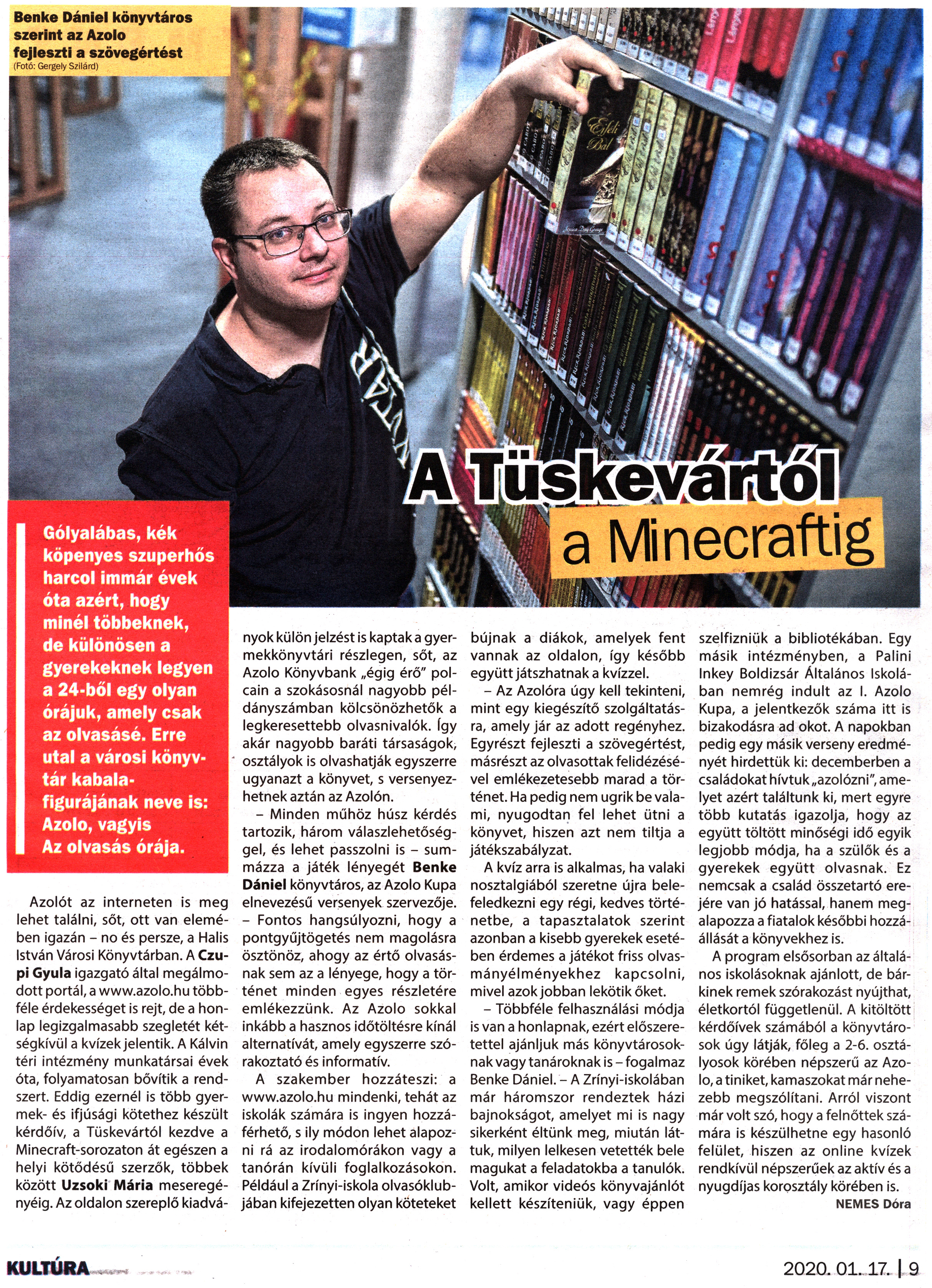 Nyilvános 1713 | 3173 | Kanizsa 2020. január 17. 2. szám 9. oldal - A Tüskevártól a Minecraftig | Gólyalábas, kék köpenyes szuperhős harcol immár évek óta azért, hogy minél többeknek, de különösen a gyerekeknek legyen a 24-ből egy olyan órájuk, amely csak az olvasásé. Erre utal a városi könyvtár kabalafigurájának neve is: Azolo, vagyis Az olvasás órája. Benke Dániel könyvtáros szerint az Azolo fejleszti a szövegértést (Fotó: Gergely Szilárd) Azolót az interneten is meg lehet találni, sőt, ott van elemében igazán - no és persze, a Halis István Városi Könyvtárban. A Czupi Gyula igazgató által megálmodott portál, a www.azolo.hu többféle érdekességet is rejt, de a honlap legizgalmasabb szegletét kétségkívül a kvízek jelentik. A Kálvin téri intézmény munkatársai évek óta, folyamatosan bővítik a rendszert. Eddig ezernél is több gyermek- és ifjúsági kötethez készült kérdőív, a Tüskevártól kezdve a Minecraft-sorozaton át egészen a helyi kötődésű szerzők, többek között Uzsoki Mária meseregényéig. Az oldalon szereplő kiadványok külön jelzést is kaptak a gyermekkönyvtári részlegen, sőt, az Azolo Könyvbank „égig érő" polcain a szokásosnál nagyobb példányszámban kölcsönözhetők a legkeresettebb olvasnivalók. így akár nagyobb baráti társaságok, osztályok is olvashatják egyszerre ugyanazt a könyvet, s versenyezhetnek aztán az Azolón. - Minden műhöz húsz kérdés tartozik, három válaszlehetőséggel, és lehet passzolni is - summázza a játék lényegét Benke Dániel könyvtáros, az Azolo Kupa elnevezésű versenyek szervezője. - Fontos hangsúlyozni, hogy a pontgyűjtögetés nem magolásra ösztönöz, ahogy az értő olvasásnak sem az a lényege, hogy a történet minden egyes részletére emlékezzünk. Az Azolo sokkal inkább a hasznos időtöltésre kínál alternatívát, amely egyszerre szórakoztató és informatív. A szakember hozzáteszi: a www.azolo.hu mindenki, tehát az iskolák számára is ingyen hozzáférhető, s ily módon lehet alapozni rá az irodalomórákon vagy a tanórán kívüli foglalkozásokon. Például a Zrínyi-iskola olvasóklubjában kifejezetten olyan köteteket bújnak a diákok, amelyek fent vannak az oldalon, így később együtt játszhatnak a kvízzel. - Az Azolóra úgy kell tekinteni, mint egy kiegészítő szolgáltatásra, amely jár az adott regényhez. Egyrészt fejleszti a szövegértést, másrészt az olvasottak felidézésével emlékezetesebb marad a történet. Ha pedig nem ugrik be valami, nyugodtan fel lehet ütni a könyvet, hiszen azt nem tiltja a játékszabályzat. A kvíz arra is alkalmas, ha valaki nosztalgiából szeretne újra belefeledkezni egy régi, kedves történetbe, a tapasztalatok szerint azonban a kisebb gyerekek esetében érdemes a játékot friss olvasmányélményekhez kapcsolni, mivel azok jobban lekötik őket. - Többféle felhasználási módja is van a honlapnak, ezért előszeretettel ajánljuk más könyvtárosoknak vagy tanároknak is-fogalmaz Benke Dániel. - A Zrínyi-iskolában már háromszor rendeztek házi bajnokságot, amelyet mi is nagy sikerként éltünk meg, miután láttuk, milyen lelkesen vetették bele magukat a feladatokba a tanulók. Volt, amikor videós könyvajánlót kellett készíteniük, vagy éppen szelfizniük a bibliotékában. Egy másik intézményben, a Palini Inkey Boldizsár Általános Iskolában nemrég indult az I. Azolo Kupa, a jelentkezők száma itt is bizakodásra ad okot. A napokban pedig egy másik verseny eredményét hirdettük ki: decemberben a családokat hívtuk „azolózni", amelyet azért találtunk ki, mert egyre több kutatás igazolja, hogy az együtt töltött minőségi idő egyik legjobb módja, ha a szülők és a gyerekek együtt olvasnak. Ez nemcsak a család összetartó erejére van jó hatással, hanem megalapozza a fiatalok későbbi hozzáállását a könyvekhez is. A program elsősorban az általános iskolásoknak ajánlott, de bárkinek remek szórakozást nyújthat, életkortól függetlenül. A kitöltött kérdőívek számából a könyvtárosok úgy látják, főleg a 2-6. osztályosok körében népszerű az Azolo, a tiniket, kamaszokat már nehezebb megszólítani. Arról viszont már volt szó, hogy a felnőttek számára is készülhetne egy hasonló felület, hiszen az online kvízek rendkívül népszerűek az aktív és a nyugdíjas korosztály körében is. NEMES Dóra |