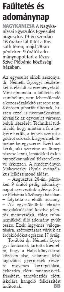 Nyilvános 1470 | 2272 | Zalai Hírlap 2020. augusztus 13. 189. szám 6. oldal | Faültetés és adománynap NAGYKANIZSA A Nagykanizsai Egyszülős Egyesület augusztus 19-én szerdán 16 órakor fát ültet a Kossuth téren, majd 28-án pénteken 9 órától adománynapot tart a Jézus Szíve Plébánia közösségi házában. Az egyesület elnök asszonya, dr. Németh Györgyi részleteket is elárult az eseményekről. Mint elmondta: a faültetés élő szimbólum, nem lebecsülendő a közösségalakító szerepe sem. Közösen juharfát ültetnek, hiszen ezzel is nyomatékosítani kívánják az egyesület városon belüli létezését. Technikai tudnivaló, hogy miután a fa a helyére került, a tervek szerint a gödröt sok-sok kisgyermek temetné be egyszerre. Ezért azt kérik, aki szeretne az ünnep részese lenni, lapátokkal és kis öntözőkannákkal felszerelkezve érkezzen. A rendezvényen Makoviczky Gyula evangélikus lelkész mond áldást. – Augusztus 28-án, pénteken 9 órától pedig adománynapot szervezünk a Jézus Szíve Plébánia közösségi házában – folytatta az elnök asszony. – Az egyesületünk februári megalakulásától kezdve jelentős mennyiségű, főleg ruhaneműkből álló adomány gyűlt össze. Ezek ingyenes válogatására, szétosztására várjuk az érdeklődőket egészen 17 óráig. Továbbá dr. Németh Györgyi fontosnak tartotta kiemelni, hogy a Halis-könyvtárral közösen alsó, valamint felső tagozatos gyermekek részére ingyenes korrepetálást, frissítést, tanévkezdés előtti iskolára hangoló felkészítést indítottak. BB |