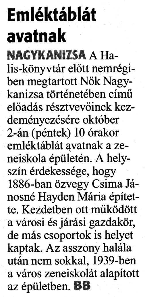 Nyilvános 1489 | 2051 | Zalai Hírlap 2020. szeptember 30. 229. szám 3. oldal | Emléktáblát avatnak NAGYKANIZSA A Halis-könyvtár előtt nemrégiben megtartott Nők Nagykanizsa történetében című előadás résztvevőinek kezdeményezésére október 2-án (péntek) 10 órakor emléktáblát avatnak a zeneiskola épületén. A helyszín érdekessége, hogy 1886-ban özvegy Csima Jánosné Hayden Mária építette. Kezdetben ott működött a városi és járási gazdakör, de más csoportok is helyet kaptak. Az asszony halála után nem sokkal, 1939-ben a város zeneiskolát alapított az épületben. BB |