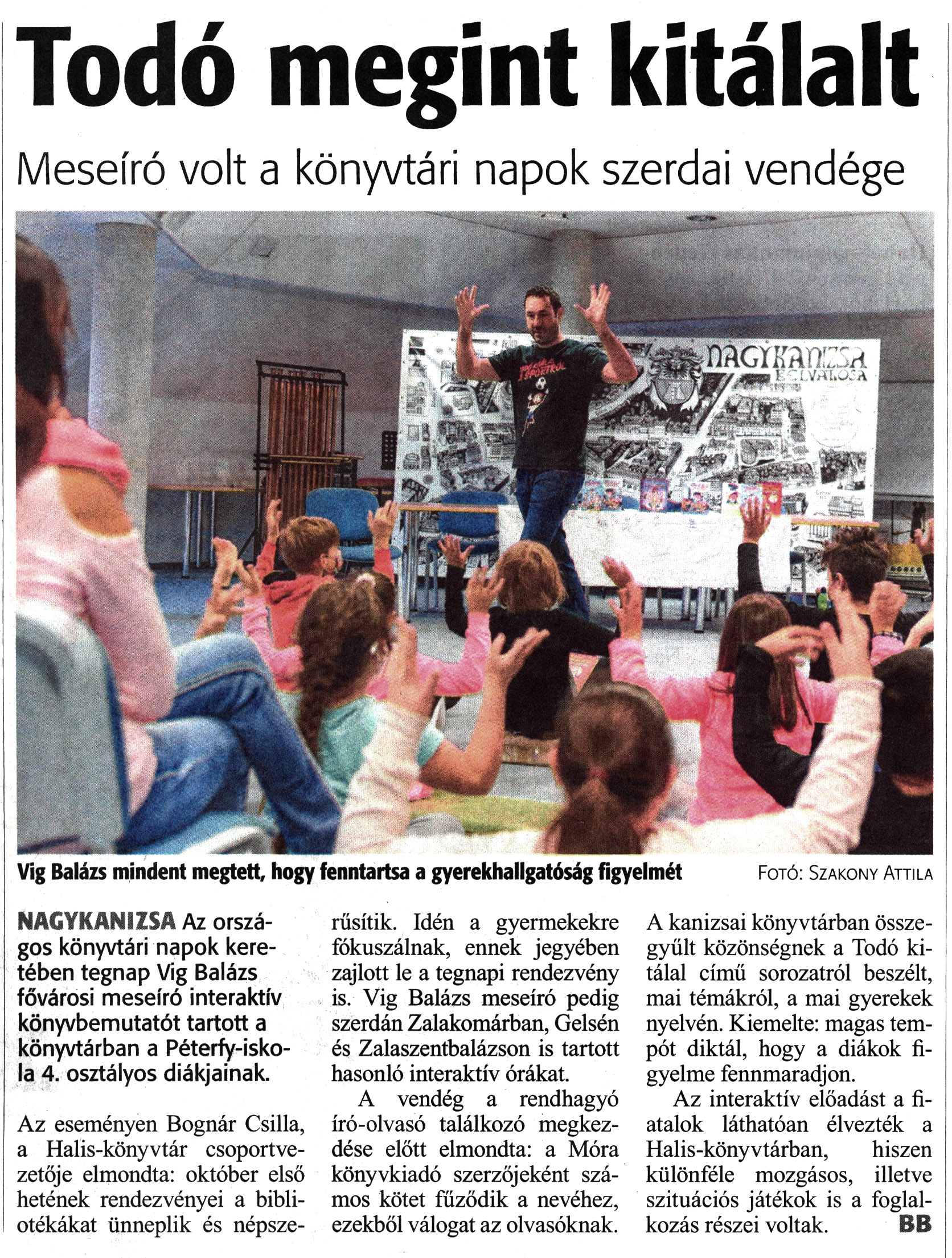 Nyilvános 1418 | 2076 | Zalai Hírlap 2020 október 8. 236. szám 16. oldal | Todó megint kitálalt Meseíró volt a könyvtári napok szerdai vendége Vig Balázs mindent megtett, hogy fenntartsa a gyerekhallgatóság figyelmét Fotó: Szakony Attila NAGYKANIZSA Az országos könyvtári napok keretében tegnap Vig Balázs fővárosi meseíró interaktív könyvbemutatót tartott a könyvtárban a Péterfy-iskola 4. osztályos diákjainak. Az eseményen Bognár Csilla, a Halis-könyvtár csoportvezetője elmondta: október első hetének rendezvényei a bibliotékákat ünneplik és népszerűsítik. Idén a gyermekekre fókuszálnak, ennek jegyében zajlott le a tegnapi rendezvény is. Vig Balázs meseíró pedig szerdán Zalakomárban, Gelsén és Zalaszentbalázson is tartott hasonló interaktív órákat. A vendég a rendhagyó író-olvasó találkozó megkezdése előtt elmondta: a Móra könyvkiadó szerzőjeként számos kötet fűződik a nevéhez, ezekből válogat az olvasóknak. A kanizsai könyvtárban összegyűlt közönségnek a Todó kitálal című sorozatról beszélt, mai témákról, a mai gyerekek nyelvén. Kiemelte: magas tempót diktál, hogy a diákok figyelme fennmaradjon. Az interaktív előadást a fiatalok láthatóan élvezték a Halis-könyvtárban, hiszen különféle mozgásos, illetve szituációs játékok is a foglalkozás részei voltak. BB |