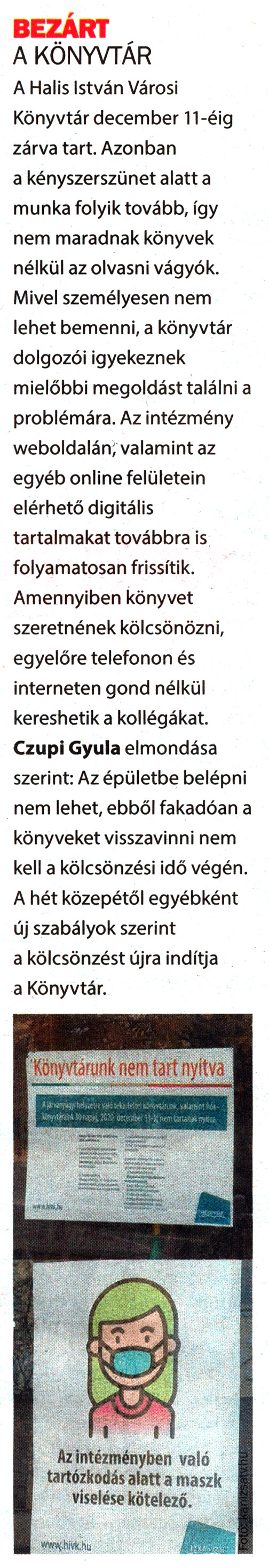 Nyilvános 1453 | 1971 | Kanizsa 2020. november 20. 42. szám 3. oldal | BEZÁRT A KÖNYVTÁR A Halis István Városi Könyvtár december 11-éig zárva tart. Azonban a kényszerszünet alatt a munka folyik tovább, így nem maradnak könyvek nélkül az olvasni vágyók. Mivel személyesen nem lehet bemenni, a könyvtár dolgozói igyekeznek mielőbbi megoldást találni a problémára. Az intézmény weboldalán; valamint az egyéb online felületein elérhető digitális tartalmakat továbbra is folyamatosan frissítik. Amennyiben könyvet szeretnének kölcsönözni, egyelőre telefonon és interneten gond nélkül kereshetik a kollégákat. Czupi Gyula elmondása szerint: Az épületbe belépni nem lehet, ebből fakadóan a könyveket visszavinni nem kell a kölcsönzési idő végén. A hét közepétől egyébként új szabályok szerint a kölcsönzést újra indítja a Könyvtár. |