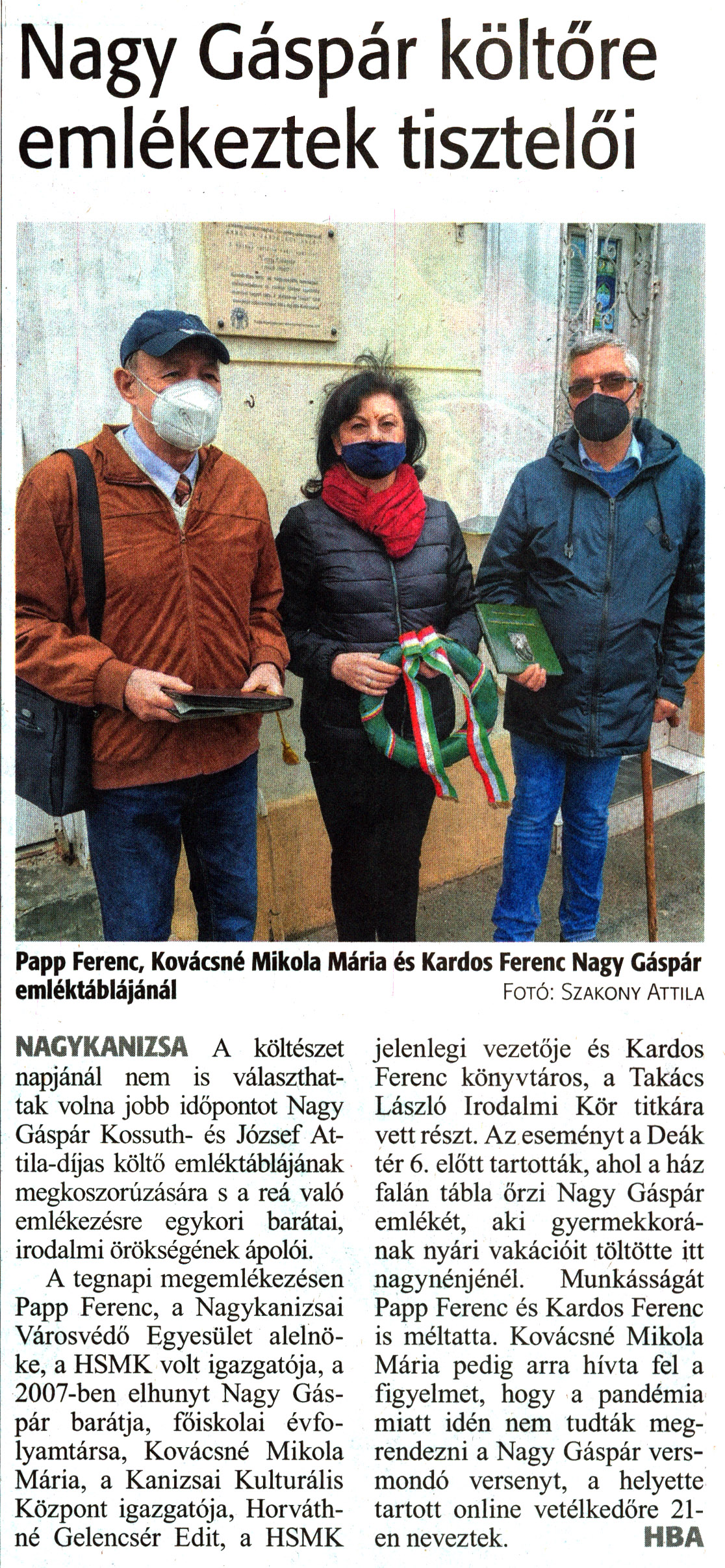 Nyilvános 1406 | 1839 | Zalai Hírlap 2021. április 12. 83. szám 3. oldal | Nagy Gáspár költőre emlékeztek tisztelői Papp Ferenc, Kovácsné Mikola Mária és Kardos Ferenc Nagy Gáspár emléktáblájánál Fotó: Szakony Attila NAGYKANIZSA A költészet napjánál nem is választhattak volna jobb időpontot Nagy Gáspár Kossuth- és József Attila-díjas költő emléktáblájának megkoszorúzására s a reá való emlékezésre egykori barátai, irodalmi örökségének ápolói. A tegnapi megemlékezésen Papp Ferenc, a Nagykanizsai Városvédő Egyesület alelnöke, a HSMK volt igazgatója, a 2007-ben elhunyt Nagy Gáspár barátja, főiskolai évfolyamtársa, Kovácsné Mikola Mária, a Kanizsai Kulturális Központ igazgatója, Horváthné Gelencsér Edit, a HSMK jelenlegi vezetője és Kardos Ferenc könyvtáros, a Takács László Irodalmi Kör titkára vett részt. Az eseményt a Deák tér 6. előtt tartották, ahol a ház falán tábla őrzi Nagy Gáspár emlékét, aki gyermekkorának nyári vakációit töltötte itt nagynénjénél. Munkásságát Papp Ferenc és Kardos Ferenc is méltatta. Kovácsné Mikola Mária pedig arra hívta fel a figyelmet, hogy a pandémia miatt idén nem tudták megrendezni a Nagy Gáspár versmondó versenyt, a helyette tartott online vetélkedőre 21-en neveztek. HBA |