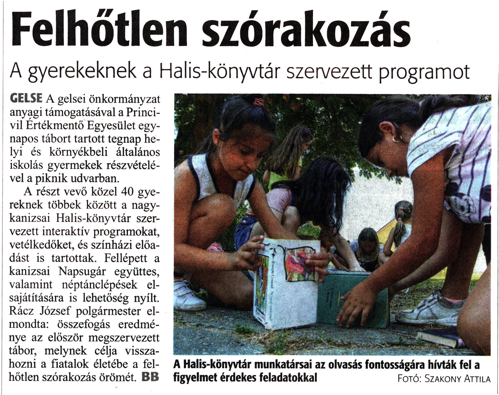 Nyilvános 1351 | 1869 | Zalai Hírlap 2021. július 8. 156. szám 16. oldal | Felhőtlen szórakozás A gyerekeknek a Halis-könyvtár szervezett programot GELSE A gelsei önkormányzat anyagi támogatásával a Princivil Értékmentő Egyesület egynapos tábort tartott tegnap helyi és környékbeli általános iskolás gyermekek részvételével a piknik udvarban. A Halis-könyvtár munkatársai az olvasás fontosságára hívták fel a figyelmet érdekes feladatokkal Fotó: Szakony Attila A részt vevő közel 40 gyereknek többek között a nagykanizsai Halis-könyvtár szervezett interaktív programokat, vetélkedőket, és színházi előadást is tartottak. Fellépett a kanizsai Napsugár együttes, valamint néptánclépések elsajátítására is lehetőség nyílt. Rácz József polgármester elmondta: összefogás eredménye az először megszervezett tábor, melynek célja visszahozni a fiatalok életébe a felhőtlen szórakozás örömét. BB |