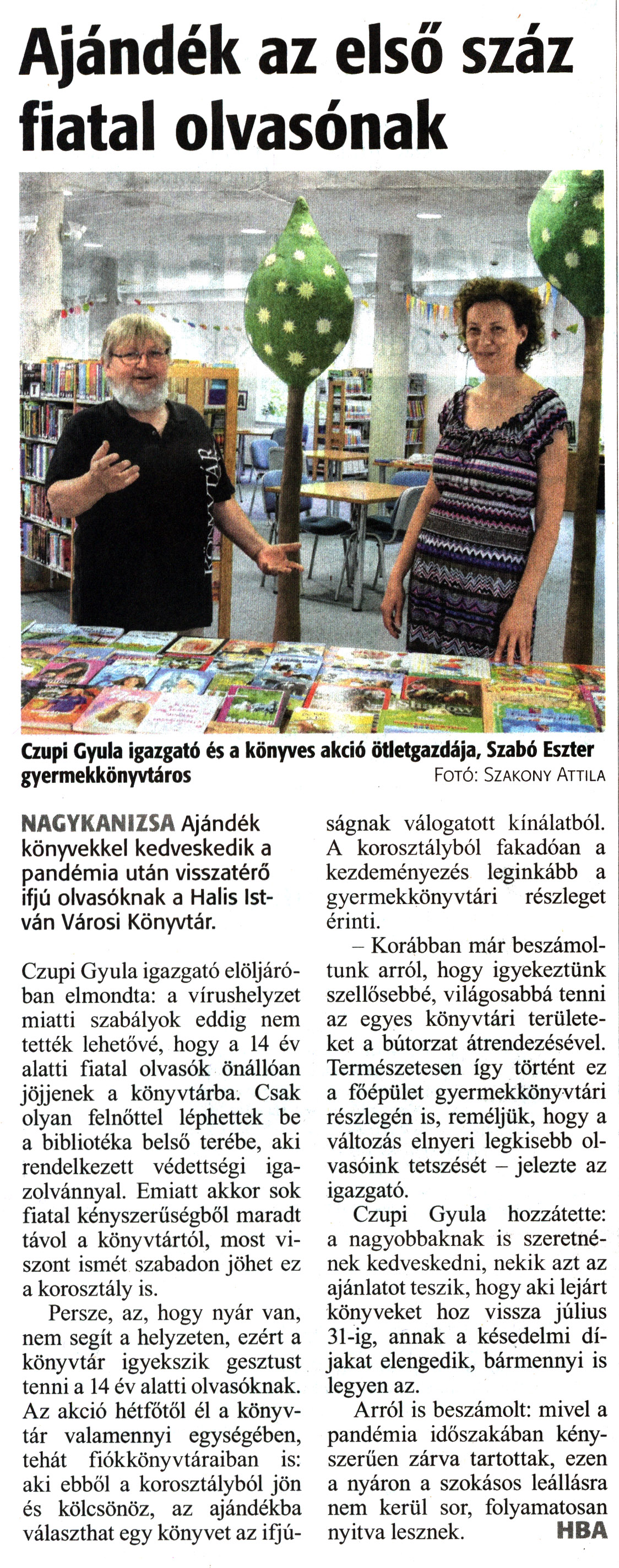 Nyilvános 1483 | 1793 | Zalai Hírlap 2021. július 9. 157. szám 16. oldal | Ajándék az első száz fiatal olvasónak Czupi Gyula igazgató és a könyves akció ötletgazdája. Szabó Eszter gyermekkönyvtáros Fotó: Szakony Attila NAGYKANIZSA Ajándék könyvekkel kedveskedik a pandémia után visszatérő ifjú olvasóknak a Halis István Városi Könyvtár. Czupi Gyula igazgató elöljáróban elmondta: a vírushelyzet miatti szabályok eddig nem tették lehetővé, hogy a 14 év alatti fiatal olvasók önállóan jöjjenek a könyvtárba. Csak olyan felnőttel léphettek be a bibliotéka belső terébe, aki rendelkezett védettségi igazolvánnyal. Emiatt akkor sok fiatal kényszerűségből maradt távol a könyvtártól, most viszont ismét szabadon jöhet ez a korosztály is. Persze, az, hogy nyár van, nem segít a helyzeten, ezért a könyvtár igyekszik gesztust tenni a 14 év alatti olvasóknak. Az akció hétfőtől él a könyvtár valamennyi egységében, tehát fiókkönyvtáraiban is: aki ebből a korosztályból jön és kölcsönöz, az ajándékba választhat egy könyvet az ifjúságnak válogatott kínálatból. A korosztályból fakadóan a kezdeményezés leginkább a gyermekkönyvtári részleget érinti. - Korábban már beszámoltunk arról, hogy igyekeztünk szellősebbé, világosabbá tenni az egyes könyvtári területeket a bútorzat átrendezésével. Természetesen így történt ez a főépület gyermekkönyvtári részlegén is, reméljük, hogy a változás elnyeri legkisebb olvasóink tetszését - jelezte az igazgató. Czupi Gyula hozzátette: a nagyobbaknak is szeretnének kedveskedni, nekik azt az ajánlatot teszik, hogy aki lejárt könyveket hoz vissza július 31-ig, annak a késedelmi díjakat elengedik, bármennyi is legyen az. Arról is beszámolt: mivel a pandémia időszakában kényszerűen zárva tartottak, ezen a nyáron a szokásos leállásra nem kerül sor, folyamatosan nyitva lesznek. HBA |