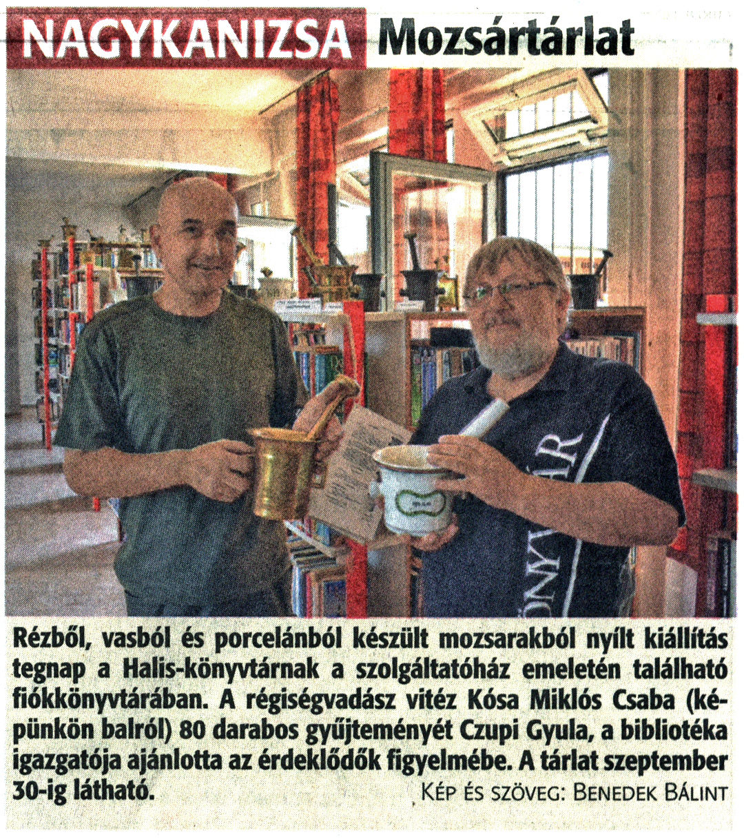 Nyilvános 1362 | 2916 | Zalai Hírlap 2021. július 30. 175. szám 3. oldal | Mozsártárlat Rézből, vasból és porcelánból készült mozsarakból nyílt kiállítás tegnap a Halis-könyvtárnak a szolgáltatóház emeletén található fiókkönyvtárában. A régiségvadász vitéz Kósa Miklós Csaba (képünkön balról) 80 darabos gyűjteményét Czupi Gyula, a bibliotéka igazgatója ajánlotta az érdeklődők figyelmébe. A tárlat szeptember 30-ig látható. Kép és szöveg: Benedek Bálint |