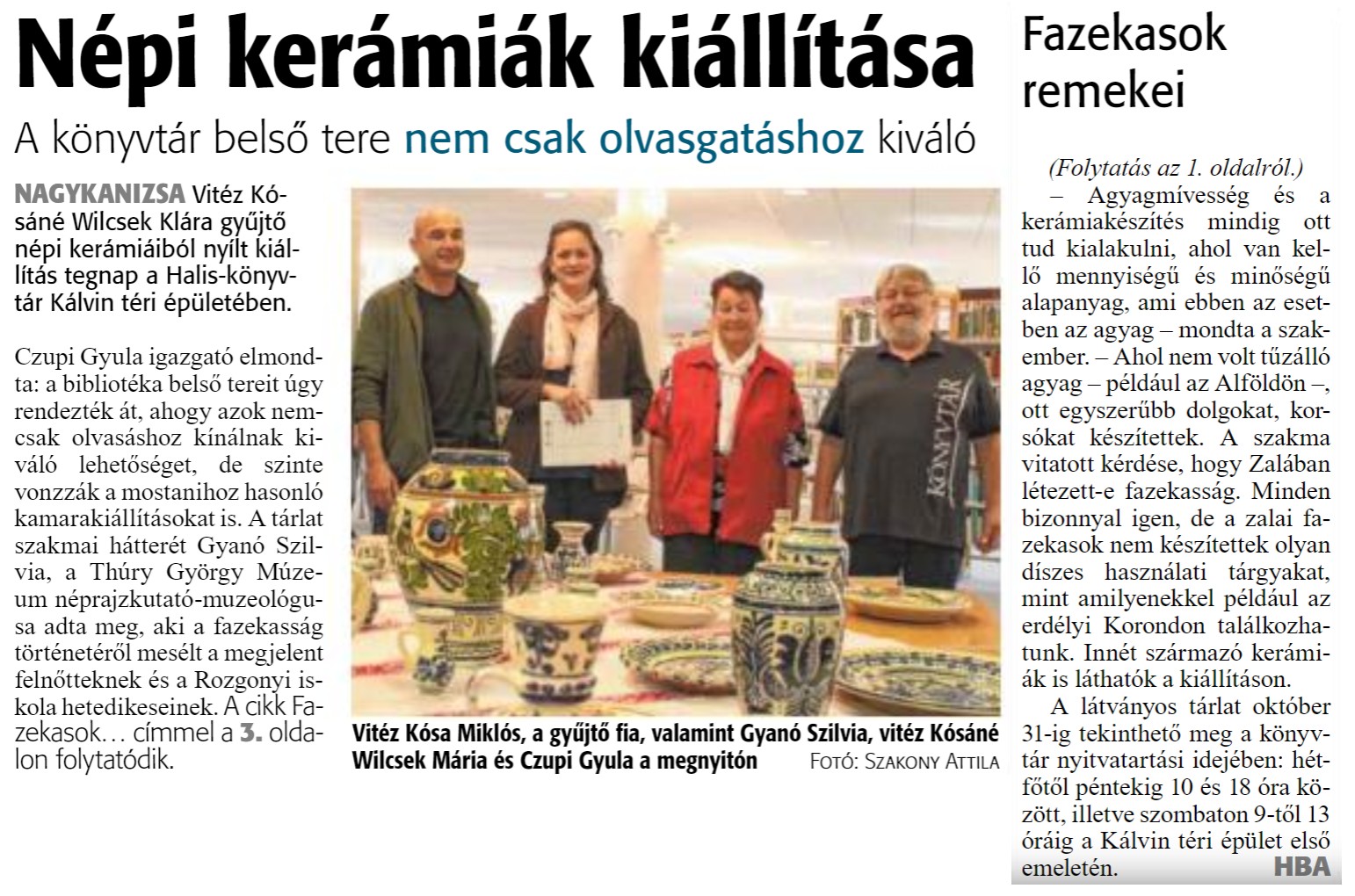 Nyilvános 1295 | 1624 | Népi kerámiák kiállítása | A könyvtár belső tere nem csak olvasgatáshoz kiváló NAGYKANIZSA Vitéz Kósáné Wilcsek Klára gyűjtő népi kerámiáiból nyílt kiállítás tegnap a Halis-könyvtár Kálvin téri épületében. Czupi Gyula igazgató elmondta: a bibliotéka belső tereit úgy rendezték át, ahogy azok nemcsak olvasáshoz kínálnak kiváló lehetőséget, de szinte vonzzák a mostanihoz hasonló kamarakiállításokat is. A tárlat szakmai hátterét Gyanó Szilvia, a Thúry György Múzeum néprajzkutató -muzeológusa adta meg, aki a fazekasság történetérő mesélt a megjelent felnőtteknek és a Rozgonyi iskola hetedikeseinek. A cikk Fazekasok. .. címmel a 3. oldalon folytatódik. Vitéz Kosa Miklós, a gyűjtő fia, valamint Gyanó Szilvia, vitéz Kósáné Wilcsek Mária és Czupi Gyula a megnyitón FOTÓ: SZAKONY ATTILA Fazekasok remekei (Folytatás az 1. oldalról.) - Agyagmíves ség és a kerámiakészítés mindig ott tud kialakulni, ahol van kellő mennyiségű és minőségű alapanyag, ami ebben az esetben az agyag - mondta a szakember. - Ahol nem volt tűzálló agyag - például az Alföldön ott egyszerűbb dolgokat, korsókat készítettek. A szakma vitatott kérdése, hogy Zalában létezett-e fazekasság. Minden bizonnyal igen, de a zalai fazekasok nem készítettek olyan díszes használati tárgyakat, mint amilyenekkel például az erdélyi Korondon találkozhatunk. Innét származó kerámiák is láthatók a kiállításon. A látványos tárlat október 31-ig tekinthető meg a könyvtár nyitvatartási idejében: hétfőtől péntekig 10 és 18 óra között, illetve szombaton 9-től 13 óráig a Kálvin téri épület első emeletén. HBA |