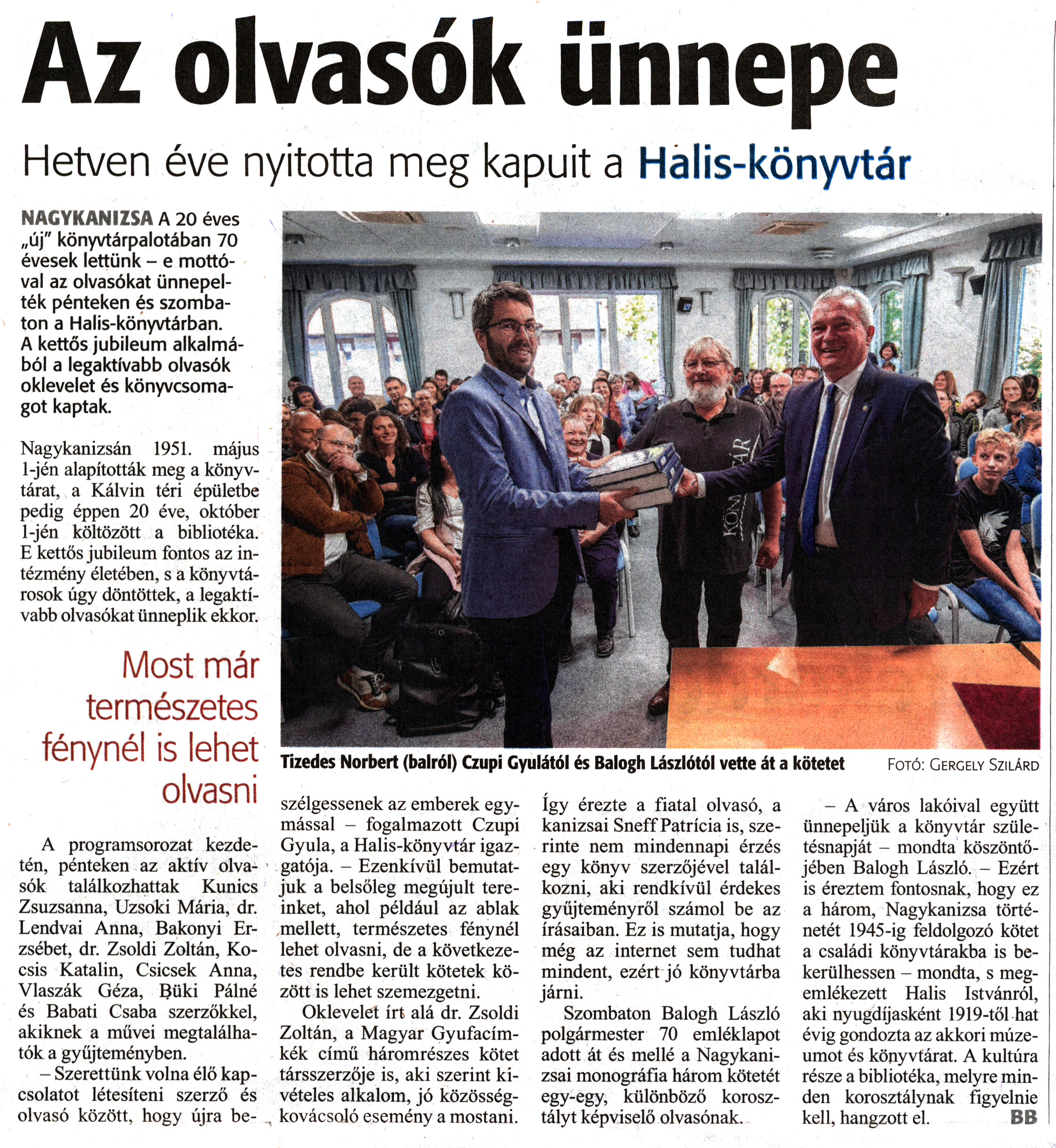 Nyilvános 1409 | 2218 | Zalai Hírlap 2021. október 4. 230. szám 4. oldal | Az olvasók ünnepe Hetven éve nyitotta meg kapuit a Halis-könyvtár NAGYKANIZSA A 20 éves „új" könyvtárpalotában 70 évesek lettünk - e mottóval az olvasókat ünnepelték pénteken és szombaton a Halis-könyvtárban. A kettős jubileum alkalmából a legaktívabb olvasók oklevelet és könyvcsomagot kaptak. Nagykanizsán 1951. május l-jén alapították meg a könyvtárat, a Kálvin téri épületbe pedig éppen 20 éve, október 1-jén költözött a bibliotéka. E kettős jubileum fontos az intézmény életében, s a könyvtárosok úgy döntöttek, a legaktívabb olvasókat ünneplik ekkor. A programsorozat kezdetén, pénteken az aktív olvasók találkozhattak Kunics Zsuzsanna, Uzsoki Mária, dr. Lendvai Anna, Bakonyi Erzsébet, dr. Zsoldi Zoltán, Kocsis Katalin, Csicsek Anna, Vlaszák Géza, Büki Pálné és Babati Csaba szerzőkkel, akiknek a művei megtalálhatók a gyűjteményben. - Szerettünk volna élő kapcsolatot létesíteni szerző és olvasó között, hogy újra beszélgessenek az emberek egymással - fogalmazott Czupi Gyula, a Halis-könyvtár igazgatója. - Ezenkívül bemutatjuk a belsőleg megújult tereinket, ahol például az ablak mellett, természetes fénynél lehet olvasni, de a következetes rendbe került kötetek között is lehet szemezgetni. Oklevelet írt alá dr. Zsoldi Zoltán, a Magyar Gyufacímkék című háromrészes kötet társszerzője is, aki szerint kivételes alkalom, jó közösségkovácsoló esemény a mostani. így érezte a fiatal olvasó, a kanizsai Sneff Patrícia is, szerinte nem mindennapi érzés egy könyv szerzőjével találkozni, aki rendkívül érdekes gyűjteményről számol be az írásaiban. Ez is mutatja, hogy még az internet sem tudhat mindent, ezért jó könyvtárba járni. Szombaton Balogh László polgármester 70 emléklapot adott át és mellé a Nagykanizsai monográfia három kötetét egy-egy, különböző korosztályt képviselő olvasónak. - A város lakóival együtt ünnepeljük a könyvtár születésnapját - mondta köszöntőjében Balogh László. - Ezért is éreztem fontosnak, hogy ez a három, Nagykanizsa történetét 1945-ig feldolgozó kötet a családi könyvtárakba is bekerülhessen - mondta, s megemlékezett Halis Istvánról, aki nyugdíjasként 1919-től hat évig gondozta az akkori múzeumot és könyvtárat. A kultúra része a bibliotéka, melyre minden korosztálynak figyelnie kell, hangzott el. BB Tizedes Norbert (balról) Czupi Gyulától és Balogh Lászlótól vette át a kötetet Fotó: Gergely Szilárd |