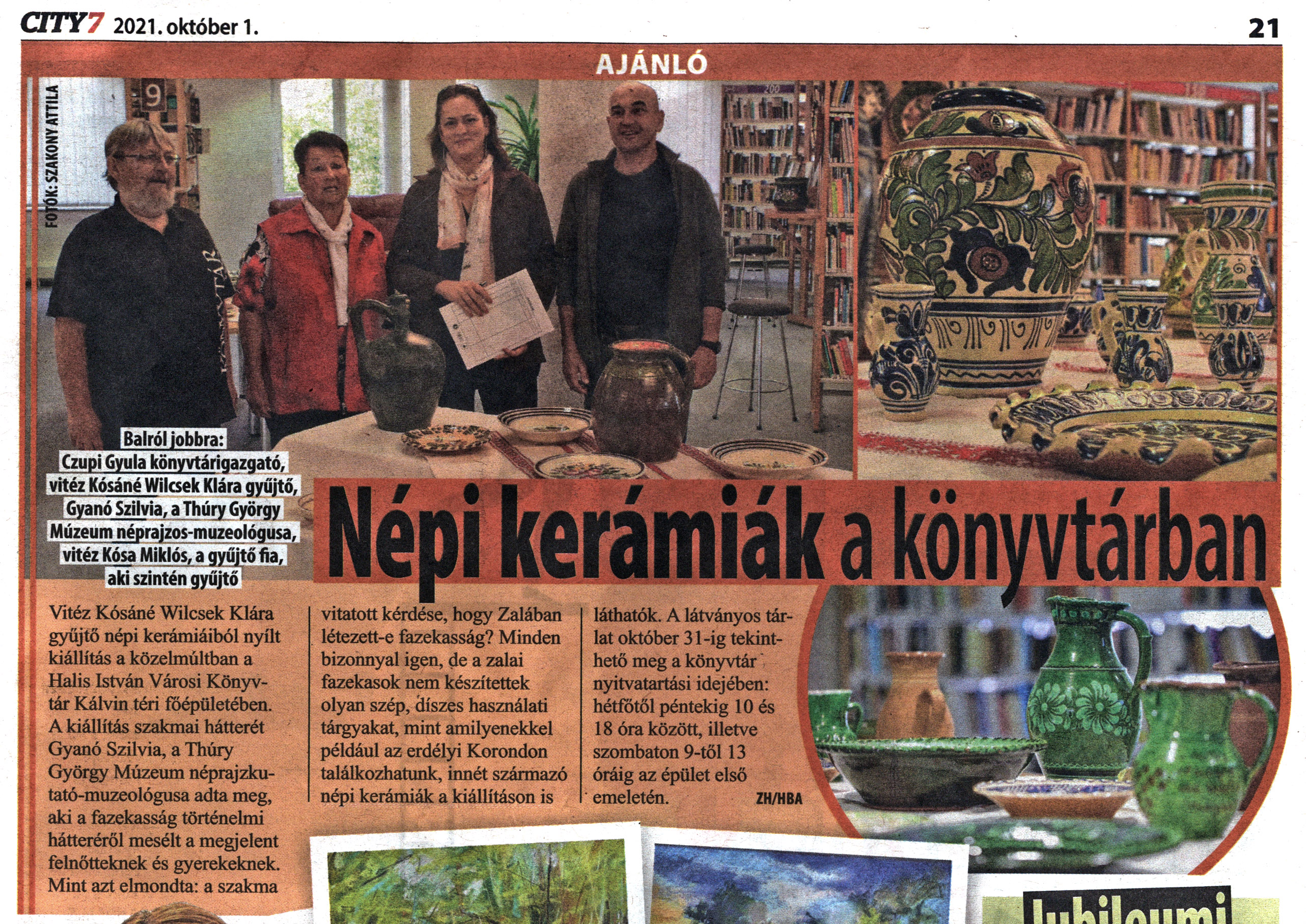 Nyilvános 1814 | 2814 | City7 Magazin 2021. október 1. 28. szám 21. oldal | Népi kerámiák a könyvtárban Vitéz Kósáné Wilcsek Klára gyűjtő népi kerámiáiból nyílt kiállítás a közelmúltban a Halis István Városi Könyvtár Kálvin téri főépületében. A kiállítás szakmai hátterét Gyanó Szilvia, a Thúry György Múzeum néprajzkutató-muzeológusa adta meg, aki a fazekasság történelmi hátteréről mesélt a megjelent felnőtteknek és gyerekeknek. Mint azt elmondta: a szakma vitatott kérdése, hogy Zalában létezett-e fazekasság? Minden bizonnyal igen, de a zalai fazekasok nem készítettek olyan szép, díszes használati tárgyakat, mint amilyenekkel például az erdélyi Korondon találkozhatunk, innét származó népi kerámiák a kiállításon is láthatók. A látványos tárlat október 31-ig tekinthető meg a könyvtár nyitvatartási idejében: hétfőtől péntekig 10 és 18 óra között, illetve szombaton 9-től 13 óráig az épület első emeletén. ZH/HBA Balról jobbra: Czupi Gyula könyvtárigazgató, vitéz Kósáné Wilcsek Klára gyűjtő, Gyanó Szilvia, a Thúry György Múzeum néprajzos-muzeológusa, vitéz Kósa Miklós, a gyűjtő fia, aki szintén gyűjtő |