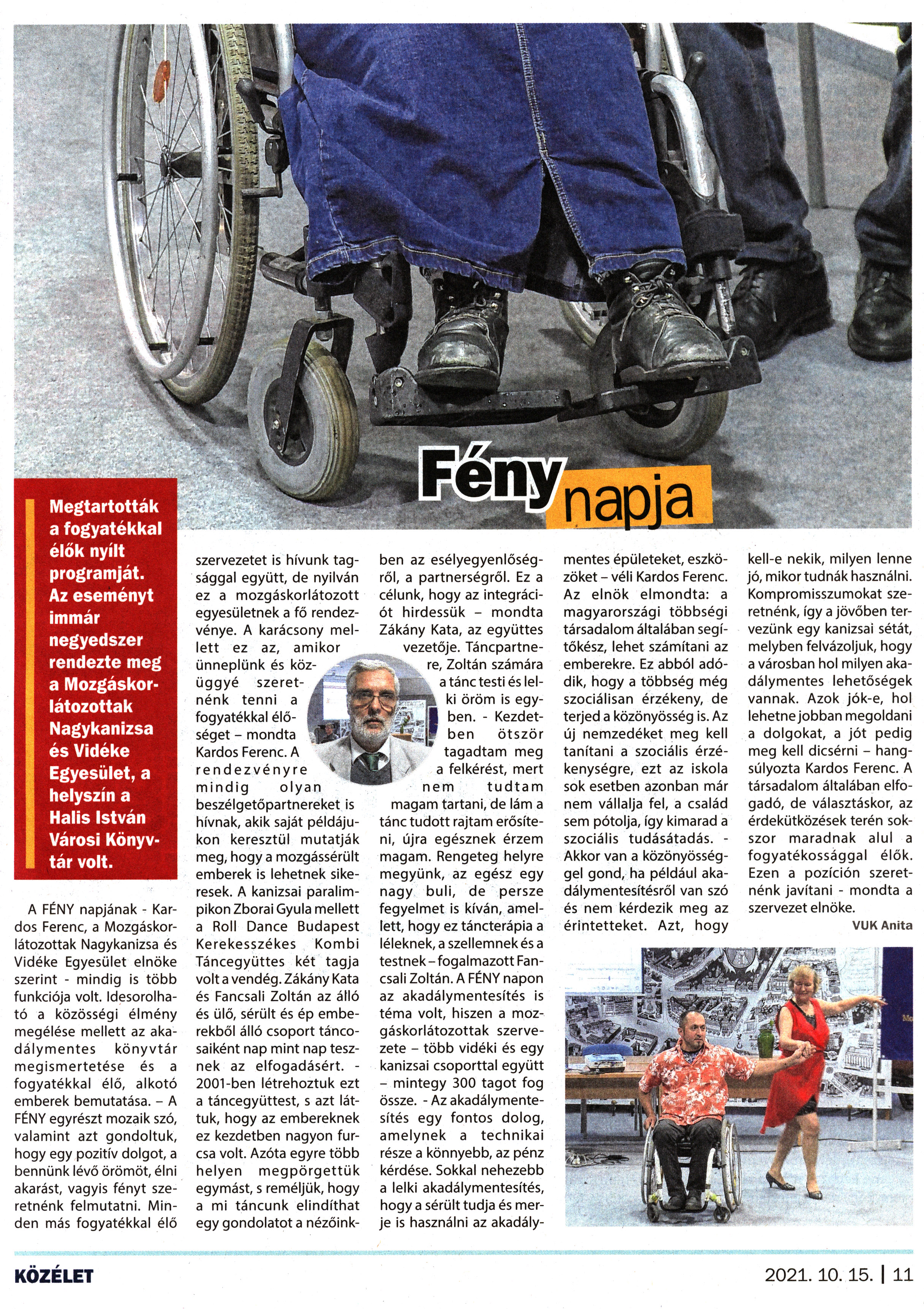 Nyilvános 1398 | 1960 | Kanizsa 2021. október 15. 18. szám 11. oldal | Fény napja Megtartották a fogyatékkal élők nyílt programját. Az eseményt immár negyedszer rendezte meg a Mozgáskorlátozottak Nagykanizsa és Vidéke Egyesület, a helyszín a Halis István Városi Könyvtár volt. A FÉNY napjának - Kardos Ferenc, a Mozgáskorlátozottak Nagykanizsa és Vidéke Egyesület elnöke szerint - mindig is több funkciója volt. Idesorolható a közösségi élmény megélése mellett az akadálymentes könyvtár megismertetése és a fogyatékkal élő, alkotó emberek bemutatása. - A FÉNY egyrészt mozaik szó, valamint azt gondoltuk, hogy egy pozitív dolgot, a bennünk lévő örömöt, élni akarást, vagyis fényt szeretnénk felmutatni. Minden más fogyatékkal élő szervezetet is hívunk tagsággal együtt, de nyilván ez a mozgáskorlátozott egyesületnek a fő rendezvénye. A karácsony mellett ez az, amikor ünneplünk és közüggyé szeretnénk tenni a fogyatékkal élőséget - mondta Kardos Ferenc. A rendezvényre mindig olyan beszélgetőpartnereket is hívnak, akik saját példájukon keresztül mutatják meg, hogy a mozgássérült emberek is lehetnek sikeresek. A kanizsai paralimpikon Zborai Gyula mellett a Roll Dance Budapest Kerekesszékes Kombi Táncegyüttes két tagja volt a vendég. Zákány Kata és Fancsali Zoltán az álló és ülő, sérült és ép emberekből álló csoport táncosaiként nap mint nap tesznek az elfogadásért. -2001-ben létrehoztuk ezt a táncegyüttest, s azt láttuk, hogy az embereknek ez kezdetben nagyon furcsa volt. Azóta egyre több helyen megpörgettük egymást, s reméljük, hogy a mi táncunk elindíthat egy gondolatot a nézőinkben az esélyegyenlőségről, a partnerségről. Ez a célunk, hogy az integrációt hirdessük - mondta Zákány Kata, az együttes vezetője. Táncpartnere, Zoltán számára a tánc testi és lelki öröm is egyben. - Kezdetben ötször tagadtam meg a felkérést, mert nem tudtam magam tartani, de lám a tánc tudott rajtam erősíteni, újra egésznek érzem magam. Rengeteg helyre megyünk, az egész egy nagy buli, de persze fegyelmet is kíván, amellett, hogy ez táncterápia a léleknek, a szellemnek és a testnek-fogalmazott Fancsali Zoltán. A FÉNY napon az akadálymentesítés is téma volt, hiszen a mozgáskorlátozottak szervezete - több vidéki és egy kanizsai csoporttal együtt - mintegy 300 tagot fog össze. - Az akadálymentesítés egy fontos dolog, amelynek a technikai része a könnyebb, az pénz kérdése. Sokkal nehezebb a lelki akadálymentesítés, hogy a sérült tudja és merje is használni az akadálymentes épületeket, eszközöket - véli Kardos Ferenc. Az elnök elmondta: a magyarországi többségi társadalom általában segítőkész, lehet számítani az emberekre. Ez abból adódik, hogy a többség még szociálisan érzékeny, de terjed a közönyösség is. Az új nemzedéket meg kell tanítani a szociális érzékenységre, ezt az iskola sok esetben azonban már nem vállalja fel, a család sem pótolja, így kimarad a szociális tudásátadás. - Akkor van a közönyösséggel gond, ha például akadálymentesítésről van szó és nem kérdezik meg az érintetteket. Azt, hogy kell-e nekik, milyen lenne jó, mikor tudnák használni. Kompromisszumokat szeretnénk, így a jövőben tervezünk egy kanizsai sétát, melyben felvázoljuk, hogy a városban hol milyen akadálymentes lehetőségek vannak. Azok jók-e, hol lehetne jobban megoldani a dolgokat, a jót pedig meg kell dicsérni - hangsúlyozta Kardos Ferenc. A társadalom általában elfogadó, de választáskor, az érdekütközések terén sokszor maradnak alul a fogyatékossággal élők. Ezen a pozíción szeretnénk javítani - mondta a szervezet elnöke. VUK Anita |