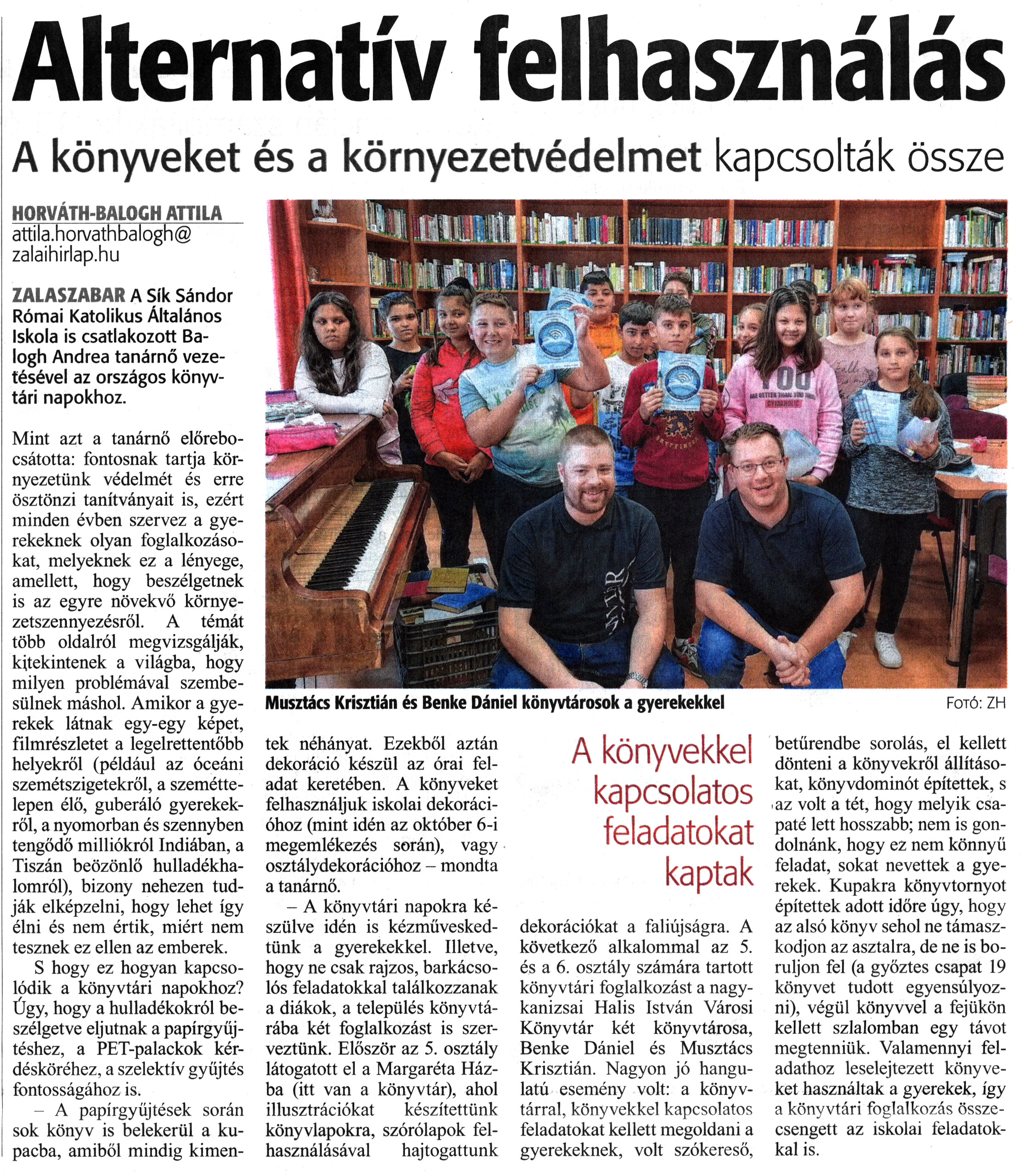 Nyilvános 1263 | 1652 | Zalai Hírlap 2021. október 21. 245. szám 4. oldal | Alternatív felhasználás A könyveket és a környezetvédelmet kapcsolták össze HORVÁTH-BALOGH ATTILA attila.horvathbalogh@ zalaihirlap.hu ZALASZABAR A Sík Sándor Római Katolikus Általános Iskola is csatlakozott Balogh Andrea tanárnő vezetésével az országos könyvtári napokhoz. Mint azt a tanárnő előrebocsátotta: fontosnak tartja környezetünk védelmét és erre ösztönzi tanítványait is, ezért minden évben szervez a gyerekeknek olyan foglalkozásokat, melyeknek ez a lényege, amellett, hogy beszélgetnek is az egyre növekvő környezetszennyezésről. A témát több oldalról megvizsgálják, kitekintenek a világba, hogy milyen problémával szembesülnek máshol. Amikor a gyerekek látnak egy-egy képet, filmrészletet a legelrettentőbb helyekről (például az óceáni szemétszigetekről, a szeméttelepen élő, guberáló gyerekekről, a nyomorban és szennyben tengődő milliókról Indiában, a Tiszán beözönlő hulladékhalomról), bizony nehezen tudják elképzelni, hogy lehet így élni és nem értik, miért nem tesznek ez ellen az emberek. S hogy ez hogyan kapcsolódik a könyvtári napokhoz? Úgy, hogy a hulladékokról beszélgetve eljutnak a papírgyűjtéshez, a PET-palackok kérdésköréhez, a szelektív gyűjtés fontosságához is. - A papírgyűjtések során sok könyv is belekerül a kupacba, amiből mindig kimentek néhányat. Ezekből aztán dekoráció készül az órai feladat keretében. A könyveket felhasználjuk iskolai dekorációhoz (mint idén az október 6-i megemlékezés során), vagy osztálydekorációhoz - mondta a tanárnő. - A könyvtári napokra készülve idén is kézműveskedtünk a gyerekekkel. Illetve, hogy ne csak rajzos, barkácsolós feladatokkal találkozzanak a diákok, a település könyvtárába két foglalkozást is szerveztünk. Először az 5. osztály látogatott el a Margaréta Házba (itt van a könyvtár), ahol illusztrációkat készítettünk könyvlapokra, szórólapok felhasználásával hajtogattunk dekorációkat a faliújságra. A következő alkalommal az 5. és a 6. osztály számára tartott könyvtári foglalkozást a nagykanizsai Halis István Városi Könyvtár két könyvtárosa, Benke Dániel és Musztács Krisztián. Nagyon jó hangulatú esemény volt: a könyvtárral, könyvekkel kapcsolatos feladatokat kellett megoldani a gyerekeknek, volt szókereső, betűrendbe sorolás, el kellett dönteni a könyvekről állításokat, könyvdominót építettek, s az volt a tét, hogy melyik csapaté lett hosszabb; nem is gondolnánk, hogy ez nem könnyű feladat, sokat nevettek a gyerekek. Kupakra könyvtornyot építettek adott időre úgy, hogy az alsó könyv sehol ne támaszkodjon az asztalra, de ne is boruljon fel (a győztes csapat 19 könyvet tudott egyensúlyozni), végül könyvvel a fejükön kellett szlalomban egy távot megtenniük. Valamennyi feladathoz leselejtezett könyveket használtak a gyerekek, így a könyvtári foglalkozás összecsengett az iskolai feladatokkal is. Musztács Krisztián és Benke Dániel könyvtárosok a gyerekekkel |