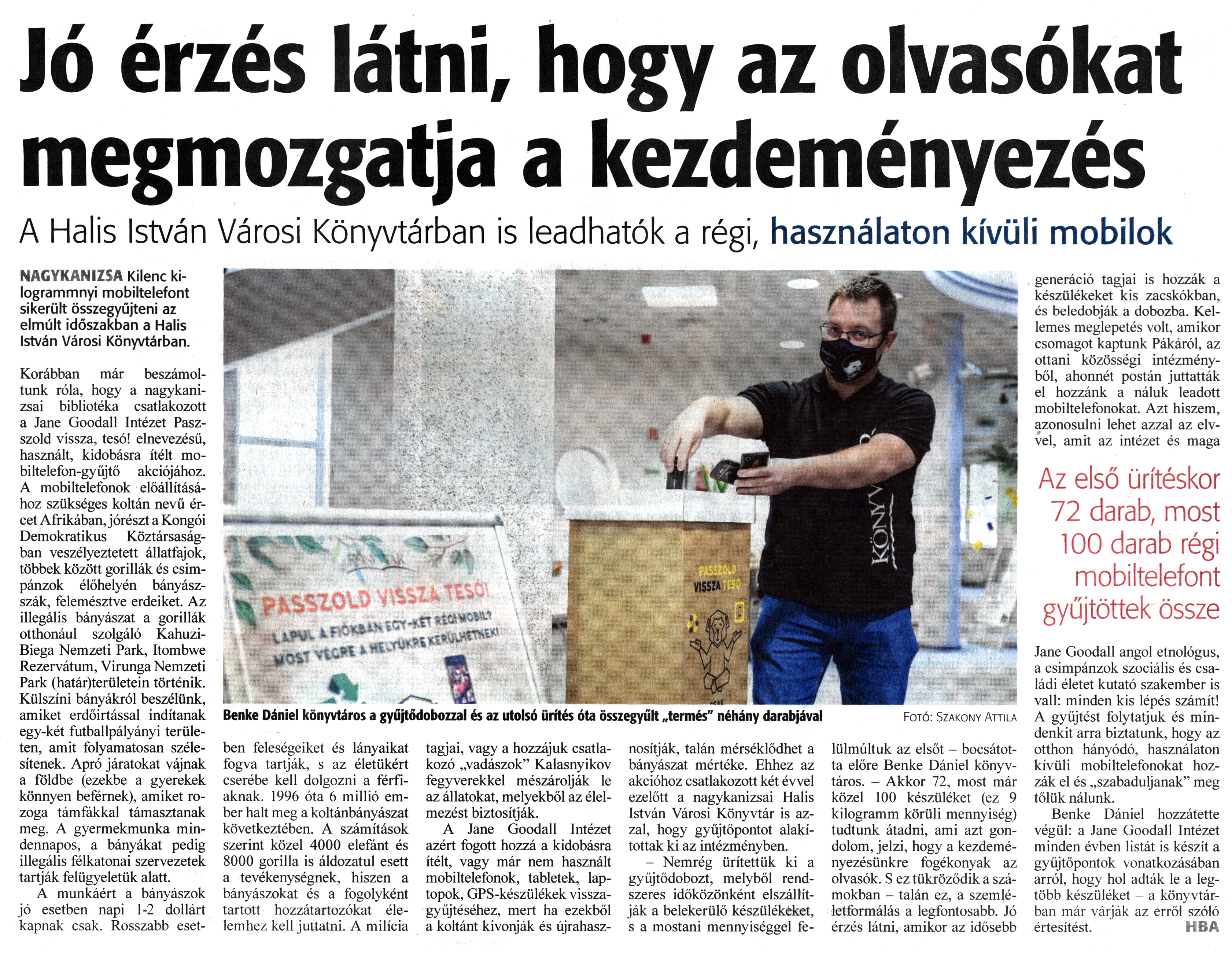 Nyilvános 1287 | 2341 | Zalai Hírlap 2021. december 21. 295. szám 5. oldal | Jó érzés látni, hogy az olvasókat megmozgatja a kezdeményezés A Halis István Városi Könyvtárban is leadhatók a régi, használaton kívüli mobilok NAGYKANIZSA Kilenc kilogrammnyi mobiltelefont sikerült összegyűjteni az elmúlt időszakban a Halis István Városi Könyvtárban. Korábban már beszámoltunk róla, hogy a nagykanizsai bibliotéka csatlakozott a Jane Goodall Intézet Passzold vissza, tesó! elnevezésű, használt, kidobásra ítélt mobiltelefon-gyűjtő akciójához. A mobiltelefonok előállításához szükséges koltán nevű ércet Afrikában, jórészt a Kongói Demokratikus Köztársaságban veszélyeztetett állatfajok, többek között gorillák és csimpánzok élőhelyén bányászszák, felemésztve erdeiket. Az illegális bányászat a gorillák otthonául szolgáló Kahuzi-Biega Nemzeti Park, Itombwe Rezervátum, Virunga Nemzeti Park határterületein történik. Külszíni bányákról beszélünk, amiket erdőirtással indítanak egy-két futballpályányi területen, amit folyamatosan szélesítenek. Apró járatokat vájnak a földbe (ezekbe a gyerekek könnyen beférnek), amiket rozoga támfákkal támasztanak meg. A gyermekmunka mindennapos, a bányákat pedig illegális félkatonai szervezetek tartják felügyeletük alatt. A munkáért a bányászok jó esetben napi 1-2 dollárt kapnak csak. Rosszabb esetben feleségeiket és lányaikat fogva tartják, s az életükért cserébe kell dolgozni a férfiaknak. 1996 óta 6 millió ember halt meg a koltánbányászat következtében. A számítások szerint közel 4000 elefánt és 8000 gorilla is áldozatul esett a tevékenységnek, hiszen a bányászokat és a fogolyként tartott hozzátartozókat élelemhez kell juttatni. A milícia tagjai, vagy a hozzájuk csatlakozó „vadászok" Kalasnyikov fegyverekkel mészárolják le az állatokat, melyekből az élelmezést biztosítják. A Jane Goodall Intézet azért fogott hozzá a kidobásra ítélt, vagy már nem használt mobiltelefonok, tabletek, laptopok, GPS-készülékek visszagyűjtéséhez, mert ha ezekből a koltánt kivonják és újrahasznosítják, talán mérséklődhet a bányászat mértéke. Ehhez az akcióhoz csatlakozott két évvel ezelőtt a nagykanizsai Halis István Városi Könyvtár is azzal, hogy gyűjtőpontot alakítottak ki az intézményben. - Nemrég ürítettük ki a gyűjtődobozt, melyből rendszeres időközönként elszállítják a belekerülő készülékeket, s a mostani mennyiséggel felülmúltuk az elsőt - bocsátotta előre Benke Dániel könyvtáros. - Akkor 72, most már közel 100 készüléket (ez 9 kilogramm körüli mennyiség) tudtunk átadni, ami azt gondolom, jelzi, hogy a kezdeményezésünkre fogékonyak az olvasók. S ez tükröződik a számokban - talán ez, a szemléletformálás a legfontosabb. Jó érzés látni, amikor az idősebb generáció tagjai is hozzák a készülékeket kis zacskókban, és beledobják a dobozba. Kellemes meglepetés volt, amikor csomagot kaptunk Pákáról, az ottani közösségi intézményből, ahonnét postán juttatták el hozzánk a náluk leadott mobiltelefonokat. Azt hiszem, azonosulni lehet azzal az elvvel, amit az intézet és maga Jane Goodall angol etnológus, a csimpánzok szociális és családi életet kutató szakember is vall: minden kis lépés számít! A gyűjtést folytatjuk és mindenkit arra biztatunk, hogy az otthon hányódó, használaton kívüli mobiltelefonokat hozzák el és „szabaduljanak" meg tőlük nálunk. Benke Dániel hozzátette végül: a Jane Goodall Intézet minden évben listát is készít a gyűjtőpontok vonatkozásában arról, hogy hol adták le a legtöbb készüléket - a könyvtárban már várják az erről szóló értesítést. HBA Benke Dániel könyvtáros a gyűjtődobozzal és az utolsó ürítés óta összegyűlt „termés" néhány darabjával Fotó: Szakony Attila |