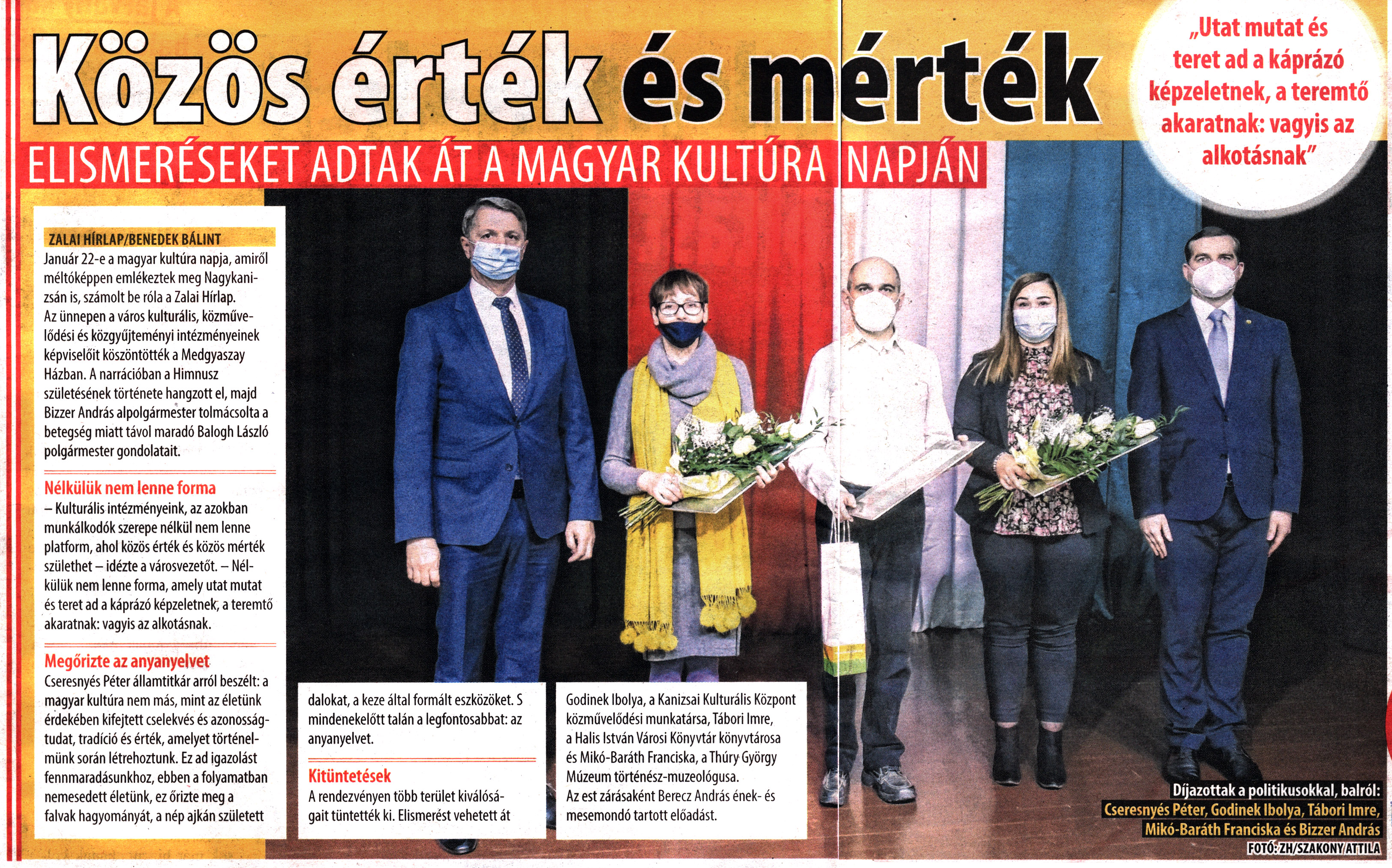 Nyilvános 1777 | 2731 | City7 magazin 2022. január 28. 4. szám 6-7. oldal | Közös érték és mérték - Elismeréseket adtak át a magyar kultúra napján „Utat mutat és teret ad a káprázó képzeletnek, a teremtő akaratnak: vagyis az alkotásnak" ZALAI HÍRLAP/BENEDEK BÁLINT Január 22-e a magyar kultúra napja, amiről méltóképpen emlékeztek meg Nagykanizsán is, számolt be róla a Zalai Hírlap. Az ünnepen a város kulturális, közművelődési és közgyűjteményi intézményeinek képviselőit köszöntötték a Medgyaszay Házban. A narrációban a Himnusz születésének története hangzott el, majd Bizzer András alpolgármester tolmácsolta a betegség miatt távol maradó Balogh László polgármester gondolatait. Nélkülük nem lenne forma - Kulturális intézményeink, az azokban munkálkodók szerepe nélkül nem lenne platform, ahol közös érték és közös mérték születhet - idézte a városvezetőt. - Nélkülük nem lenne forma, amely utat mutat és teret ad a káprázó képzeletnek, a teremtő akaratnak: vagyis az alkotásnak. Megőrizte az anyanyelvet Cseresnyés Péter államtitkár arról beszélt: a magyar kultúra nem más, mint az életünk érdekében kifejtett cselekvés és azonosságtudat, tradíció és érték, amelyet történelmünk során létrehoztunk. Ez ad igazolást fennmaradásunkhoz, ebben a folyamatban nemesedett életünk, ez őrizte meg a falvak hagyományát, a nép ajkán született dalokat, a keze által formált eszközöket. S mindenekelőtt talán a legfontosabbat: az anyanyelvet. Kitüntetések A rendezvényen több terület kiválóságait tüntették ki. Elismerést vehetett át Gödinek Ibolya, a Kanizsai Kulturális Központ közművelődési munkatársa, Tábori Imre, a Halis István Városi Könyvtár könyvtárosa és Mikó-Baráth Franciska, a Thúry György Múzeum történész-muzeológusa. Az est zárásaként Berecz András ének- és mesemondó tartott előadást. Díjazottak a politikusokkal, balról: Cseresnyés Péter, Gödinek Ibolya, Tábori Imre, Mikó-Baráth Franciska és Bizzer András |