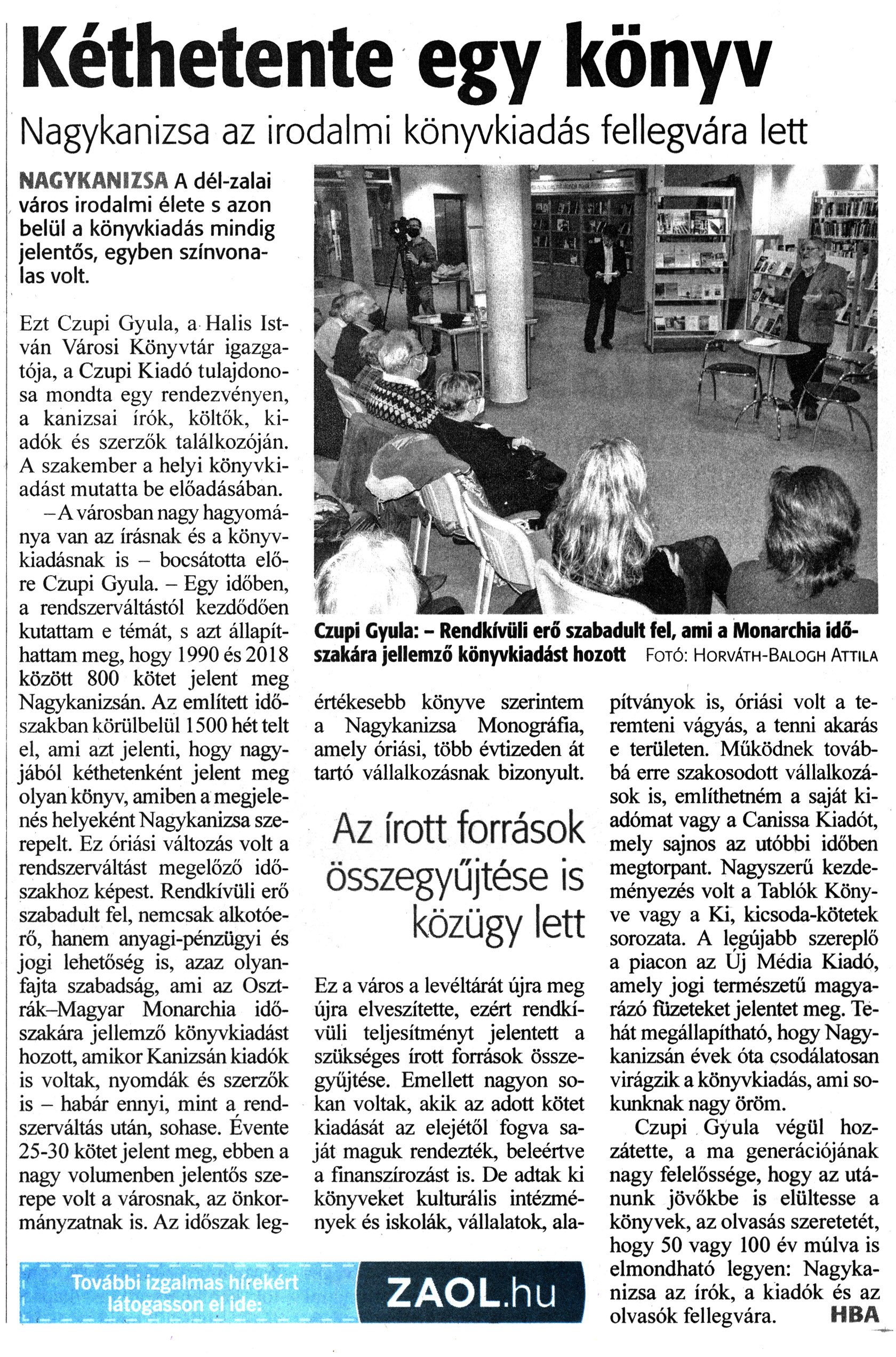 Nyilvános 1348 | 1664 | Zalai Hírlap 2022. március 23. 68. szám 12. oldal | Kéthetente egy könyv Nagykanizsa az irodalmi könyvkiadás fellegvára lett NAGYKANIZSA A dél-zalai város irodalmi élete s azon belül a könyvkiadás mindig jelentős, egyben színvonalas volt. Ezt Czupi Gyula, a Halis István Városi Könyvtár igazgatója, a Czupi Kiadó tulajdonosa mondta egy rendezvényen, a kanizsai írók, költők, kiadók és szerzők találkozóján. A szakember a helyi könyvkiadást mutatta be előadásában. -A városban nagy hagyománya van az írásnak és a könyvkiadásnak is - bocsátotta előre Czupi Gyula. - Egy időben, a rendszerváltástól kezdődően kutattam e témát, s azt állapíthattam meg, hogy 1990 és 2018 között 800 kötet jelent meg Nagykanizsán. Az említett időszakban körülbelül 1500 hét telt el, ami azt jelenti, hogy nagyjából kéthetenként jelent meg olyan könyv, amiben a megjelenés helyeként Nagykanizsa szerepelt. Ez óriási változás volt a rendszerváltást megelőző időszakhoz képest. Rendkívüli erő szabadult fel, nemcsak alkotóerő, hanem anyagi-pénzügyi és jogi lehetőség is, azaz olyanfajta szabadság, ami az Osztrák-Magyar Monarchia időszakára jellemző könyvkiadást hozott, amikor Kanizsán kiadók is voltak, nyomdák és szerzők is - habár ennyi, mint a rendszerváltás után, sohase. Évente 25-30 kötet jelent meg, ebben a nagy volumenben jelentős szerepe volt a városnak, az önkormányzatnak is. Az időszak legértékesebb könyve szerintem a Nagykanizsa Monográfia, amely óriási, több évtizeden át tartó vállalkozásnak bizonyult. Ez a város a levéltárát újra meg újra elveszítette, ezért rendkívüli teljesítményt jelentett a szükséges írott források összegyűjtése. Emellett nagyon sokan voltak, akik az adott kötet kiadását az elejétől fogva saját maguk rendezték, beleértve a finanszírozást is. De adtak ki könyveket kulturális intézmények és iskolák vállalatok ala- pítványok is, óriási volt a teremteni vágyás, a tenni akarás e területen. Működnek továbbá erre szakosodott vállalkozások is, említhetném a saját kiadómat vagy a Canissa Kiadót, mely sajnos az utóbbi időben megtorpant. Nagyszerű kezdeményezés volt a Tablók Könyve vagy a Ki, kicsoda-kötetek sorozata. A legújabb szereplő a piacon az Új Média Kiadó, amely jogi természetű magyarázó füzeteket jelentet meg. Tehát megállapítható, hogy Nagykanizsán évek óta csodálatosan virágzik a könyvkiadás, ami sokunknak nagy öröm. Czupi Gyula végül hozzátette, a ma generációjának nagy felelőssége, hogy az utánunk jövőkbe is elültesse a könyvek, az olvasás szeretetét, hogy 50 vagy 100 év múlva is elmondható legyen: Nagykanizsa az írók, a kiadók és az olvasók fellegvára. HBA Czupi Gyula: - Rendkívüli erő szabadult fel, ami a Monarchia időszakára jellemző könyvkiadást hozott Fotó: Horváth-Balogh Attila |