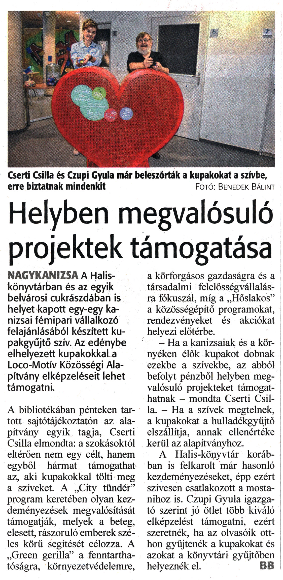 Nyilvános 1202 | 1566 | Zalai Hírlap 2022. november 2. 255. szám 2. oldal | Helyben megvalósuló projektek támogatása NAGYKANIZSA A Halis-könyvtárban és az egyik belvárosi cukrászdában is helyet kapott egy-egy kanizsai fémipari vállalkozó felajánlásából készített kupakgyűjtő szív. Az edénybe elhelyezett kupakokkal a Loco-Motív Közösségi Alapítvány elképzeléseit lehet támogatni. A bibliotékában pénteken tartott sajtótájékoztatón az alapítvány egyik tagja, Cserti Csilla elmondta: a szokásoktól eltérően nem egy célt, hanem egyből hármat támogathat az, aki kupakokkal tölti meg a szíveket. A „City tündér" program keretében olyan kezdeményezések megvalósítását támogatják, melyek a beteg, elesett, rászoruló emberek széles körű segítését célozza. A „Green gerilla" a fenntarthatóságra, környezetvédelemre, a körforgásos gazdaságra és a társadalmi felelősségvállalásra fókuszál, míg a „Hőslakos" a közösségépítő programokat, rendezvényeket és akciókat helyezi előtérbe. - Ha a kanizsaiak és a környéken élők kupakot dobnak ezekbe a szívekbe, az abból befolyt pénzből helyben megvalósuló projekteket támogathatnak - mondta Cserti Csilla. - Ha a szívek megtelnek, a kupakokat a hulladékgyűjtő elszállítja, annak ellenértéke kerül az alapítványhoz. A Halis-könyvtár korábban is felkarolt már hasonló kezdeményezéseket, épp ezért szívesen csatlakozott a mostanihoz is. Czupi Gyula igazgató szerint jó ötlet több kiváló elképzelést támogatni, ezért szeretnék, ha az olvasóik otthon gyűjtenék a kupakokat és azokat a könyvtári gyűjtőben helyeznék el. BB Cserti Csilla és Czupi Gyula már beleszórták a kupakokat a szívbe, erre biztatnak mindenkit Fotó: Benedek Bálint |
