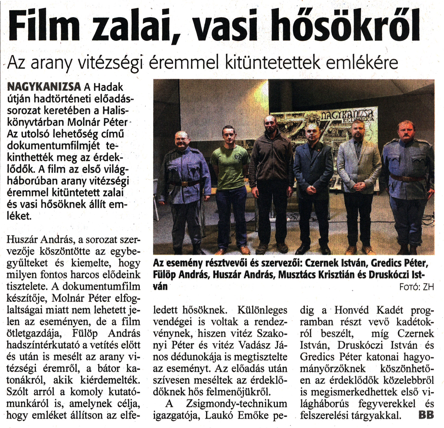 Nyilvános 1218 | 3474 | Zalai Hírlap 2022. december 14. 291. szám 5. oldal | Film zalai, vasi hősökről Az arany vitézségi éremmel kitüntetettek emlékére NAGYKANIZSA A Hadak útján hadtörténeti előadássorozat keretében a Halis-könyvtárban Molnár Péter Az utolsó lehetőség című dokumentumfilmjét tekinthették meg az érdeklődők. A film az első világháborúban arany vitézségi éremmel kitüntetett zalai és vasi hősöknek állít emléket. Huszár András, a sorozat szervezője köszöntötte az egybegyűlteket és kiemelte, hogy milyen fontos harcos elődeink tisztelete. A dokumentumfilm készítője, Molnár Péter elfoglaltságai miatt nem lehetett jelen az eseményen, de a film ötletgazdája, Fülöp András hadszíntérkutató a vetítés előtt és után is mesélt az arany vitézségi éremről, a bátor katonákról, akik kiérdemelték. Szólt arról a komoly kutatómunkáról is, amelynek célja, hogy emléket állítson az elfe- ledett hősöknek. Különleges vendégei is voltak a rendezvénynek, hiszen vitéz Szakonyi Péter és vitéz Vadász János dédunokája is megtisztelte az eseményt. Az előadás után szívesen meséltek az érdeklődőknek hős felmenőjükről. A Zsigmondy-technikum igazgatója, Laukó Emőke pedig a Honvéd Kadét programban részt vevő kadétokról beszélt, míg Czernek István, Druskóczi István és Gredics Péter katonai hagyományőrzőknek köszönhetően az érdeklődők közelebbről is megismerkedhettek első világháborús fegyverekkel és felszerelési tárgyakkal. BB Az esemény résztvevői és szervezői: Czernek István, Gredics Péter, Fülöp András, Huszár András, Musztács Krisztián és Druskóczi István Fotó: ZH |