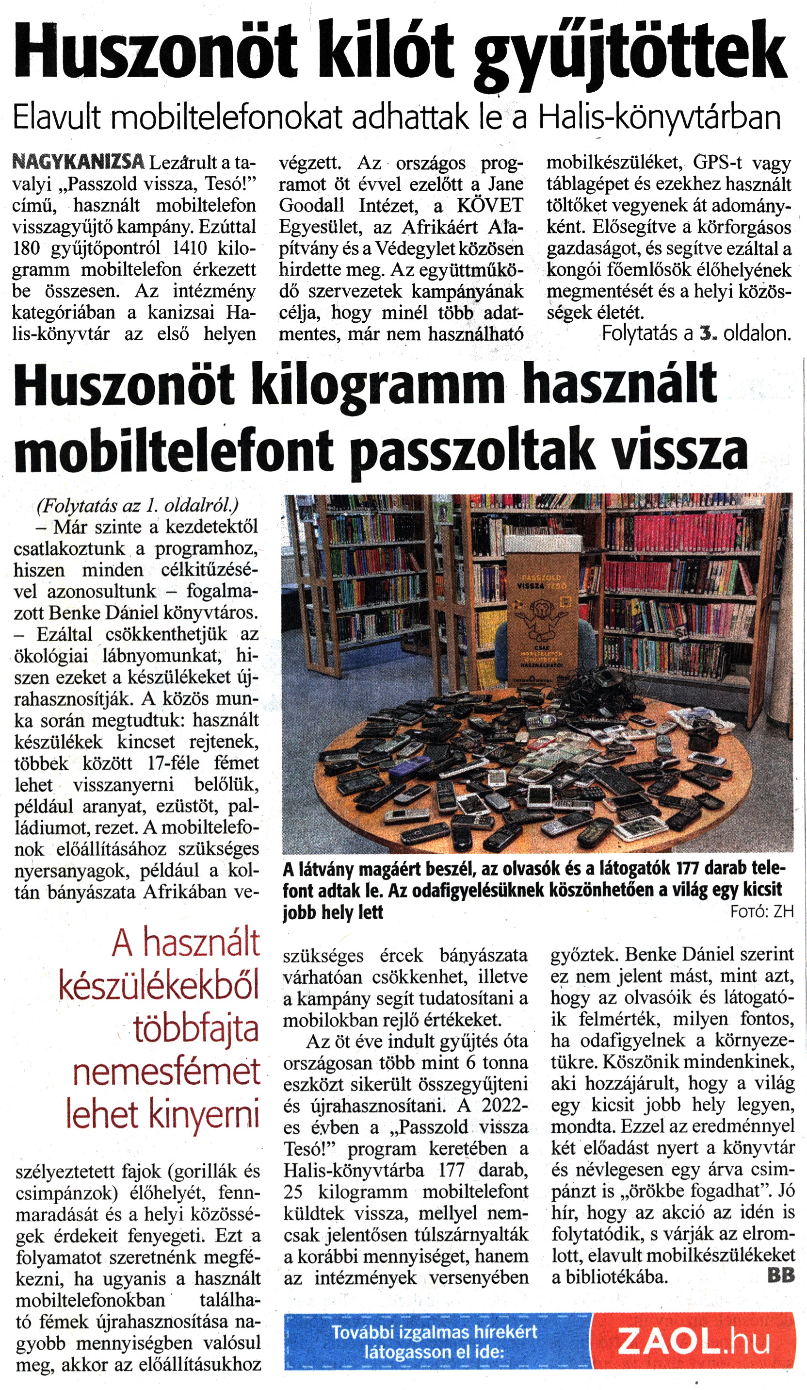 Nyilvános 1090 | 1277 | Zalai Hírlap 2023. január 24. 20. szám, 1, 3. oldal | Huszonöt kilót gyűjtöttek Elavult mobiltelefonokat adhattak le a Halis-könyvtárban NAGYKANIZSA Lezárult a tavalyi „Passzold vissza, Tesó!" című, használt mobiltelefon visszagyűjtő kampány. Ezúttal 180 gyűjtőpontról 1410 kilogramm mobiltelefon érkezett be összesen. Az intézmény kategóriában a kanizsai Halis-könyvtár az első helyen végzett. Az országos programot öt évvel ezelőtt a Jane Goodall Intézet, a KÖVET Egyesület, az Afrikáért Alapítvány és a Védegylet közösen hirdette meg. Az együttműködő szervezetek kampányának célja, hogy minél több adatmentes, már nem használható mobilkészüléket, GPS-t vagy táblagépet és ezekhez használt töltőket vegyenek át adományként. Elősegítve a körforgásos gazdaságot, és segítve ezáltal a kongói főemlősök élőhelyének megmentését és a helyi közösségek életét. Folytatás a 3. oldalon. Huszonöt kilogramm használt mobiltelefont passzoltak vissza (Folytatás az 1. oldalról.) - Már szinte a kezdetektől csatlakoztunk a programhoz, hiszen minden célkitűzésével azonosultunk - fogalmazott Benke Dániel könyvtáros. - Ezáltal csökkenthetjük az ökológiai lábnyomunkat, hiszen ezeket a készülékeket újrahasznosítják. A közös munka során megtudtuk: használt készülékek kincset rejtenek, többek között 17-féle fémet lehet visszanyerni belőlük, például aranyat, ezüstöt, palládiumot, rezet. A mobiltelefonok előállításához szükséges nyersanyagok, például a kol-tán bányászata Afrikában veszélyeztetett fajok (gorillák és csimpánzok) élőhelyét, fennmaradását és a helyi közösségek érdekeit fenyegeti. Ezt a folyamatot szeretnénk megfékezni, ha ugyanis a használt mobiltelefonokban található fémek újrahasznosítása nagyobb mennyiségben valósul meg, akkor az előállításukhoz szükséges ércek bányászata várhatóan csökkenhet, illetve a kampány segít tudatosítani a mobilokban rejlő értékeket. Az öt éve indult gyűjtés óta országosan több mint 6 tonna eszközt sikerült összegyűjteni és újrahasznosítani. A 2022-es évben a „Passzold vissza Tesó!" program keretében a Halis-könyvtárba 177 darab, 25 kilogramm mobiltelefont küldtek vissza, mellyel nemcsak jelentősen túlszárnyalták a korábbi mennyiséget, hanem az intézmények versenyében győztek. Benke Dániel szerint ez nem jelent mást, mint azt, hogy az olvasóik és látogatóik felmérték, milyen fontos, ha odafigyelnek a környezetükre. Köszönik mindenkinek, aki hozzájárult, hogy a világ egy kicsit jobb hely legyen, mondta. Ezzel az eredménnyel két előadást nyert a könyvtár és névlegesen egy árva csimpánzt is „örökbe fogadhat". Jó hír, hogy az akció az idén is folytatódik, s várják az elromlott, elavult mobilkészülékeket a bibliotékába. BB A látvány magáért beszél, az olvasók és a látogatók 177 darab telefont adtak le. Az odafigyelésüknek köszönhetően a világ egy kicsit jobb hely lett Fotó: ZH További izgalmas hírekért látogasson el ide: ZAOL.hu |